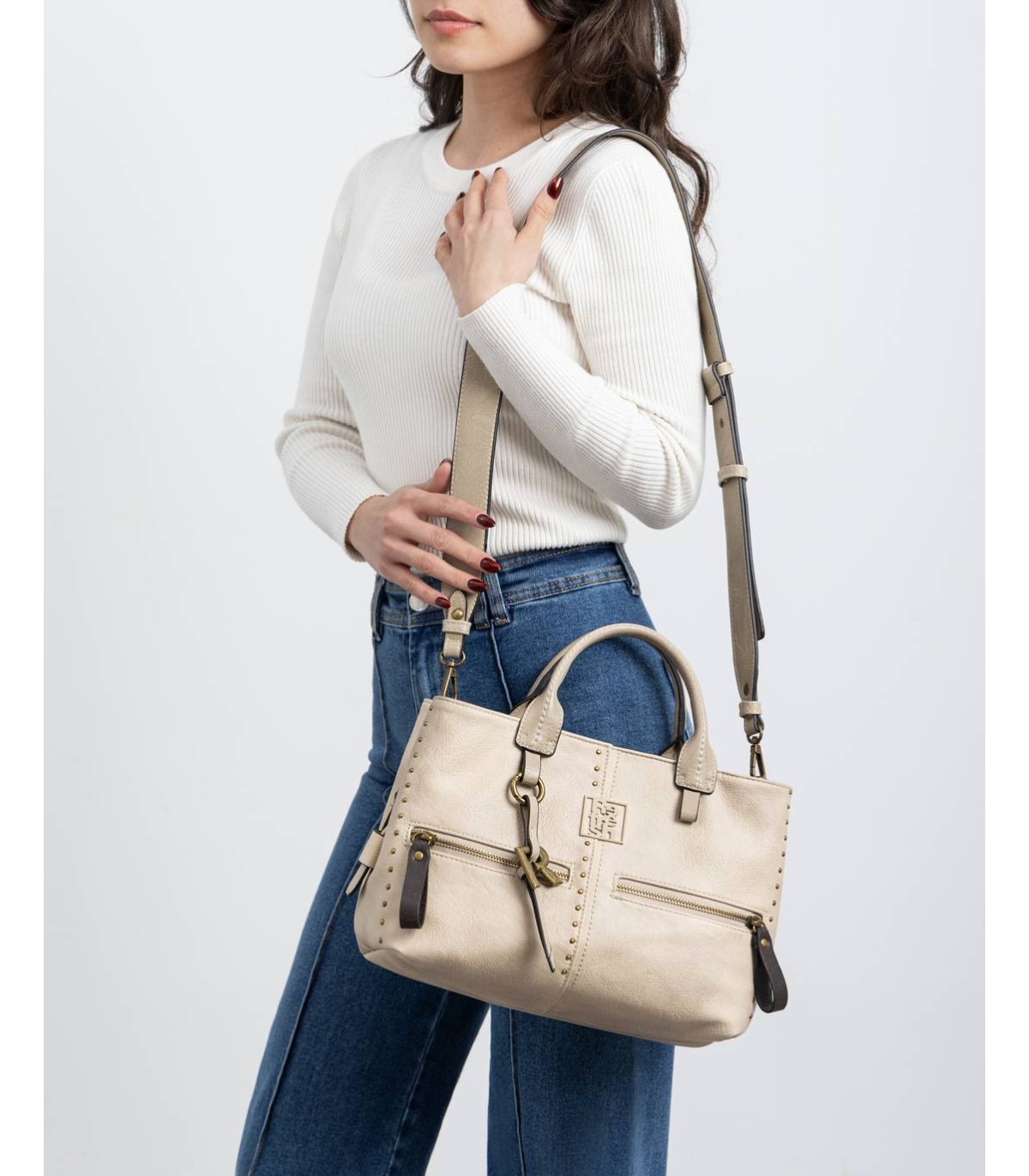 Bolso de mujer Refresh, elaborado en material que imita la piel, con cierre de cremallera. Cuenta con varios bolsillos para una excelente organización y un asa bandolera ajustable. Además, se destaca por las tachas decorativas que le dan un toque moderno. Un accesorio con estilo para cualquier ocasión. Medidas: 21 x 31 x 15 cm. Este modelo ha obtenido el certificado vegano por la organización mundial PETA (Organización de los derechos de los animales).