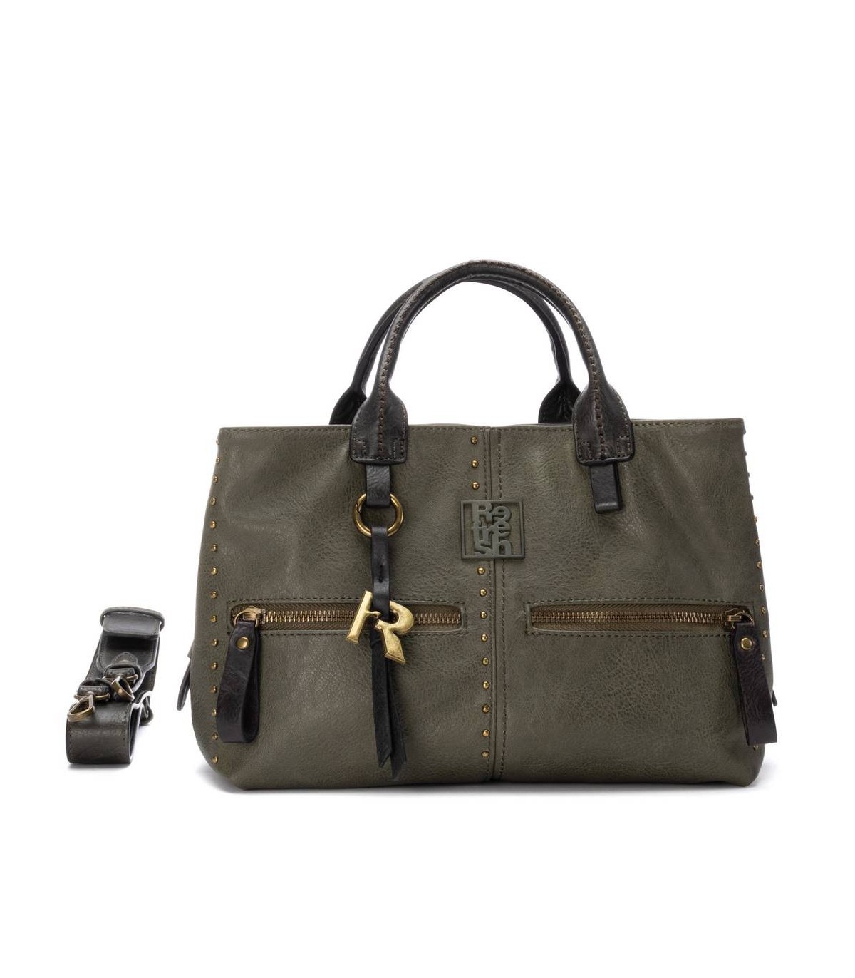 Bolso de mujer Refresh, elaborado en material que imita la piel, con cierre de cremallera. Cuenta con varios bolsillos para una excelente organización y un asa bandolera ajustable. Además, se destaca por las tachas decorativas que le dan un toque moderno. Un accesorio con estilo para cualquier ocasión. Medidas: 21 x 31 x 15 cm. Este modelo ha obtenido el certificado vegano por la organización mundial PETA (Organización de los derechos de los animales).