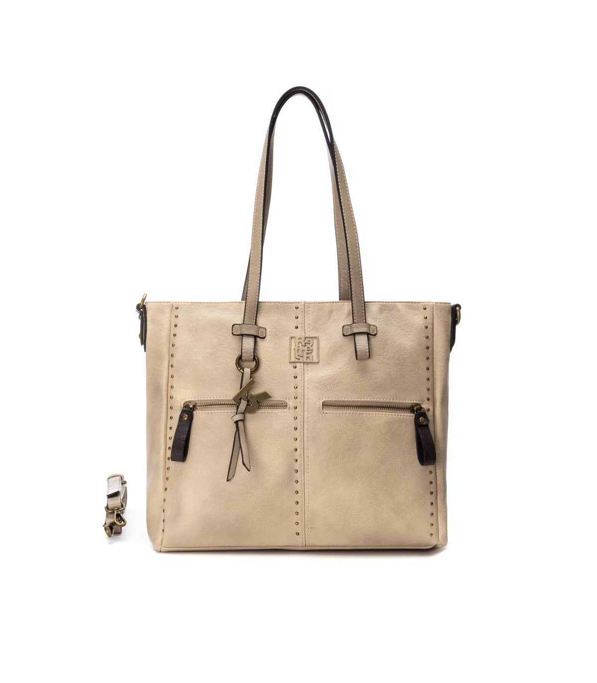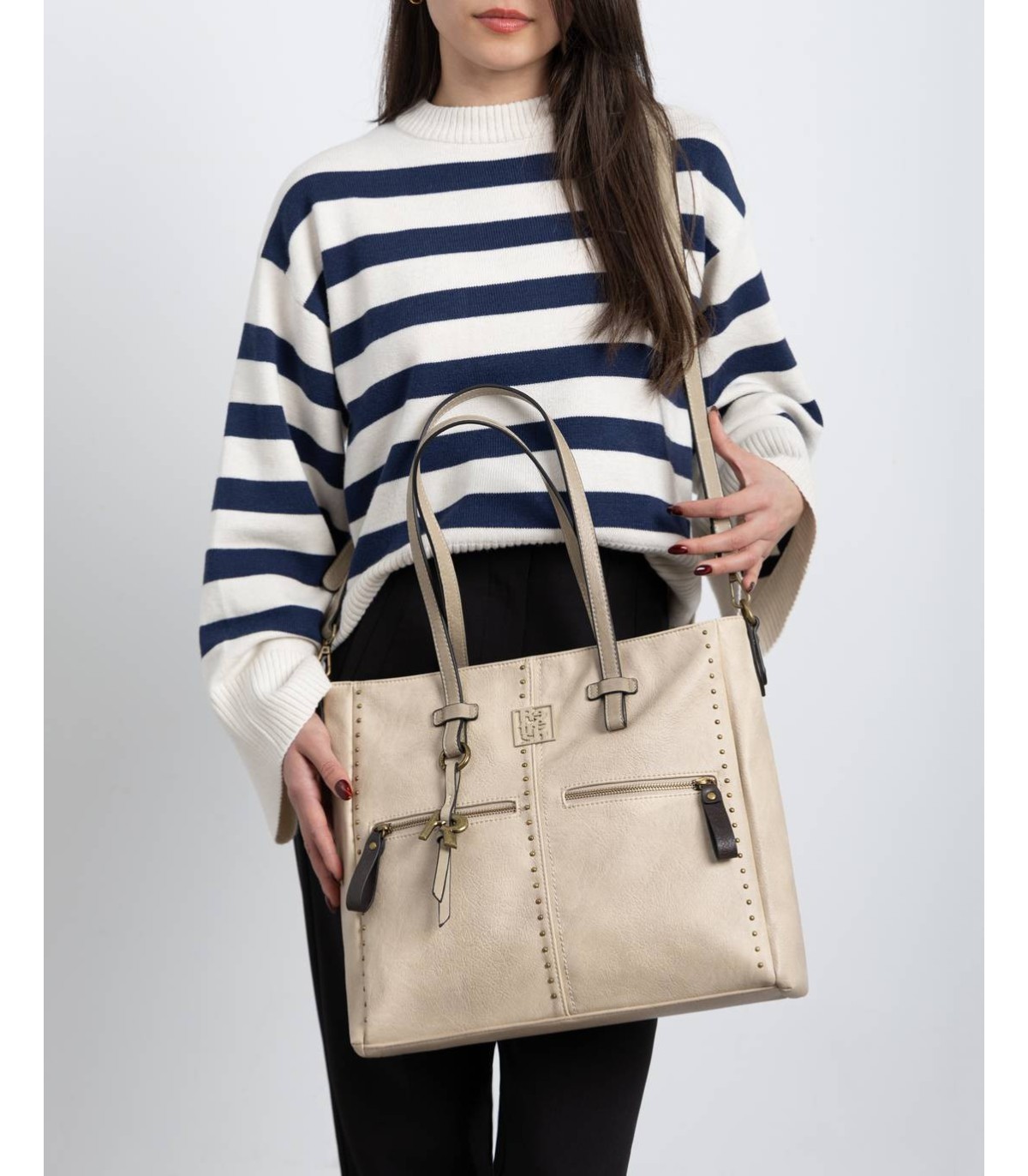 Bolso shopper de mujer de la marca Refresh, confeccionado en material que imita la piel, con cierre de cremallera para mayor seguridad. Su diseño incluye varios bolsillos para una organización óptima y un asa bandolera ajustable. Las tachas decorativas le añaden un toque moderno, perfecto para el dia a dia. Medidas: 31 x 36 x 11 cm. Este modelo ha obtenido el certificado vegano por la organización mundial PETA (Organización de los derechos de los animales).