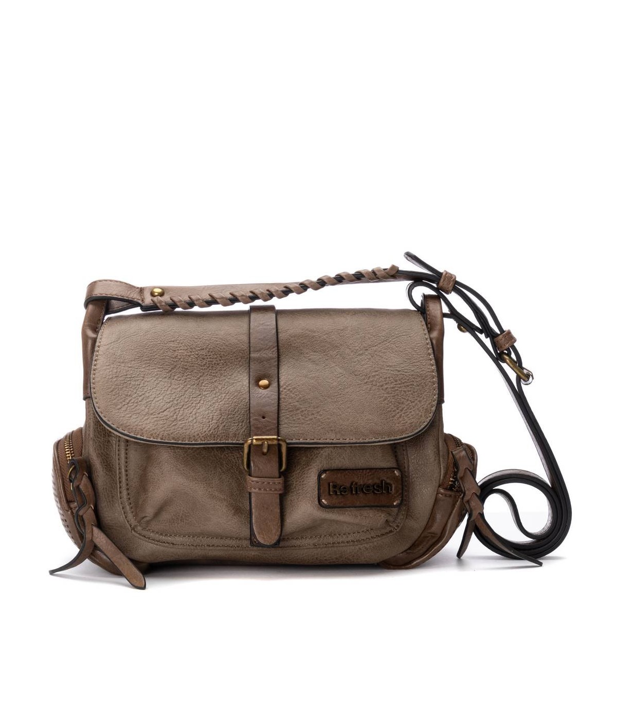 Bolso tipo bandolera de la marca Refresh. Fabricado en material que imita la piel, combina diseño funcional con un estilo urbano. Cuenta con cierre de cremallera, detalles metálicos decorativos y una correa ajustable para mayor comodidad. Su interior está forrado y ofrece compartimentos prácticos para organizar tus objetos personales. Medidas: 19 x 25 x 13 cm. Este modelo ha obtenido el certificado vegano por la organización mundial PETA (Organización de los derechos de los animales).