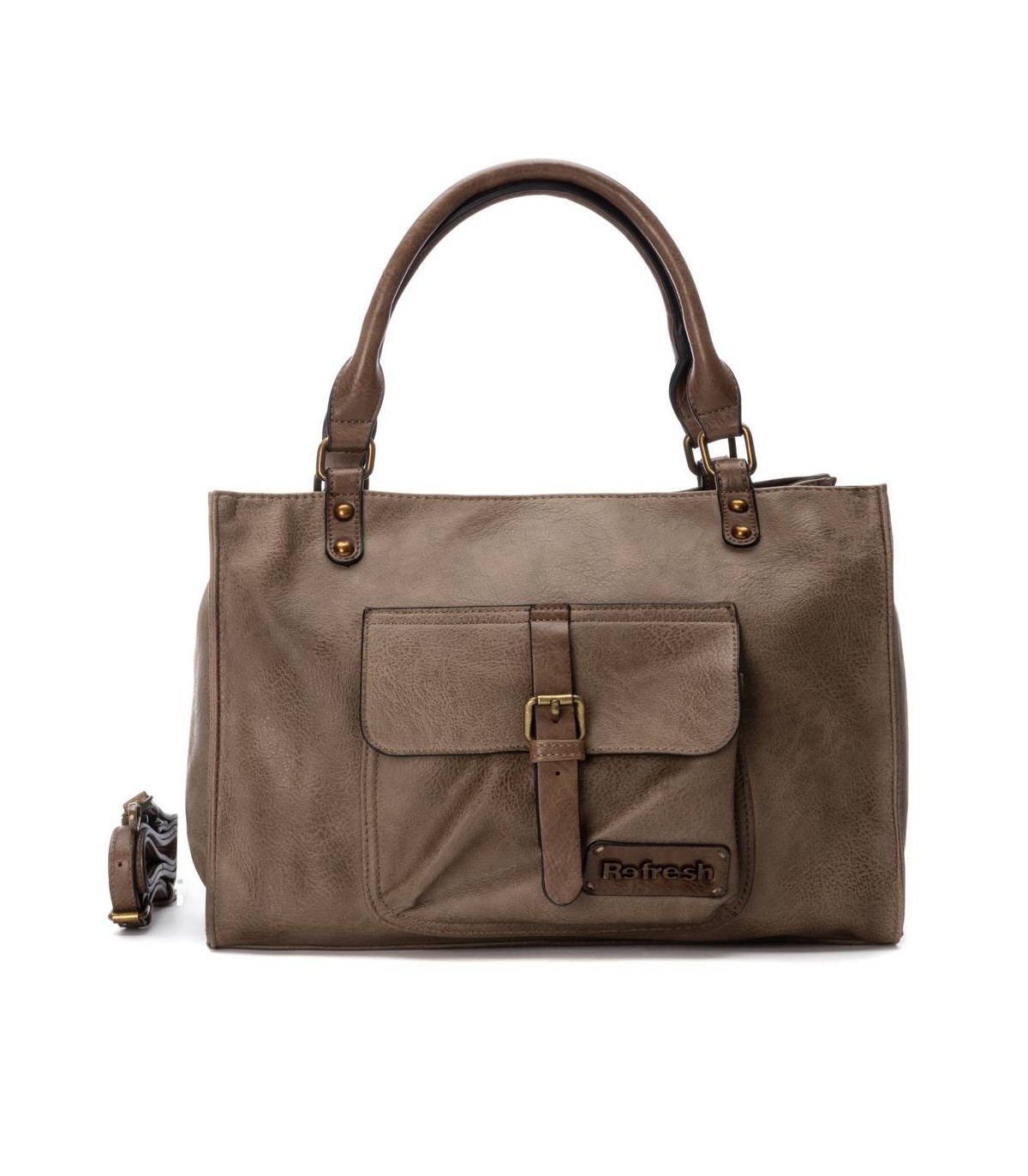Bolso de mujer de la marca Refresh. Fabricado en material que imita la piel, suave y resistente. Su diseño incluye bolsillos interiores con forro y un bolsillo exterior con cierre metálico. Práctico y versátil, con asa corta y bandolera regulable. Medidas: 26 x 35 x 12 cm. Este modelo ha obtenido el certificado vegano por la organización mundial PETA (Organización de los derechos de los animales).