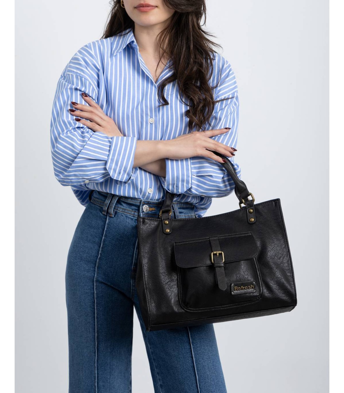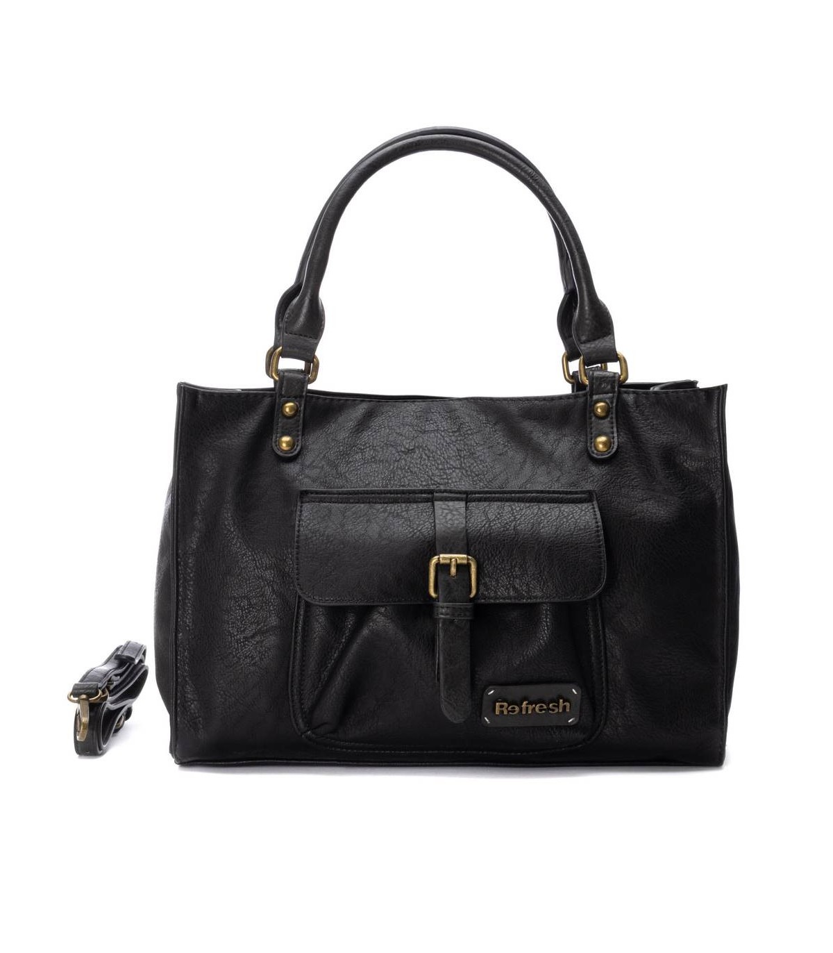 Bolso de mujer de la marca Refresh. Fabricado en material que imita la piel, suave y resistente. Su diseño incluye bolsillos interiores con forro y un bolsillo exterior con cierre metálico. Práctico y versátil, con asa corta y bandolera regulable. Medidas: 26 x 35 x 12 cm. Este modelo ha obtenido el certificado vegano por la organización mundial PETA (Organización de los derechos de los animales).