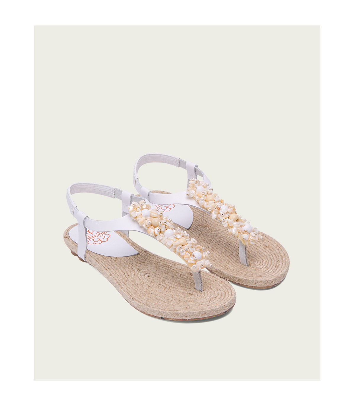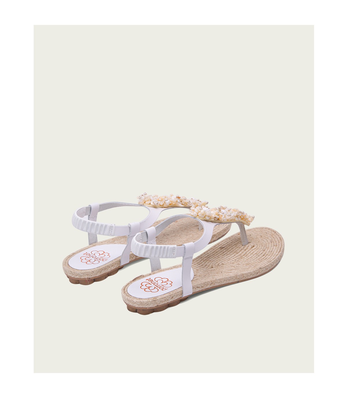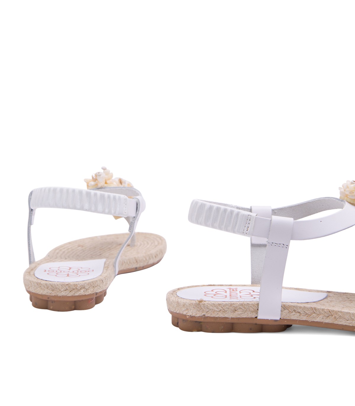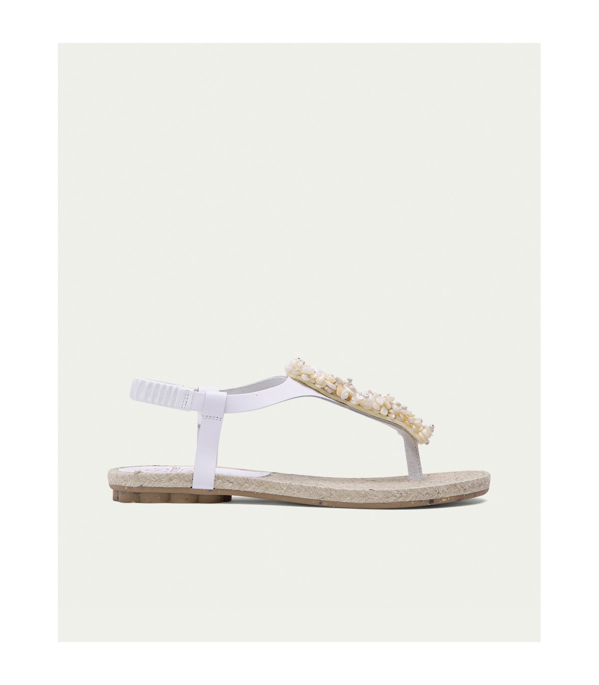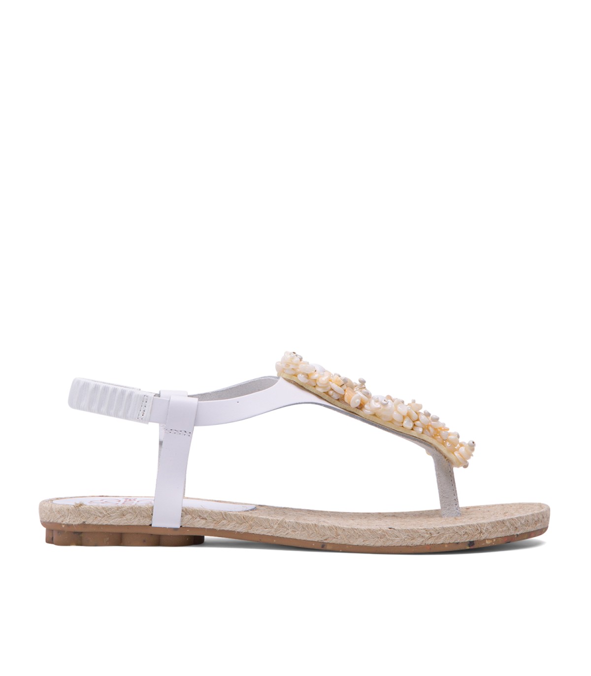 Sandalia plana tipo esclava con original aplique con avalorios de madera de estilo etnico. Corte y talonera de piel de color blanco. Piso de goma flexible elaborado con tecnologías y parte de materiales reciclados y 100% reciclables, que ayudan a reducir el impacto medioambiental. Fabricado artesanalmente en España.
