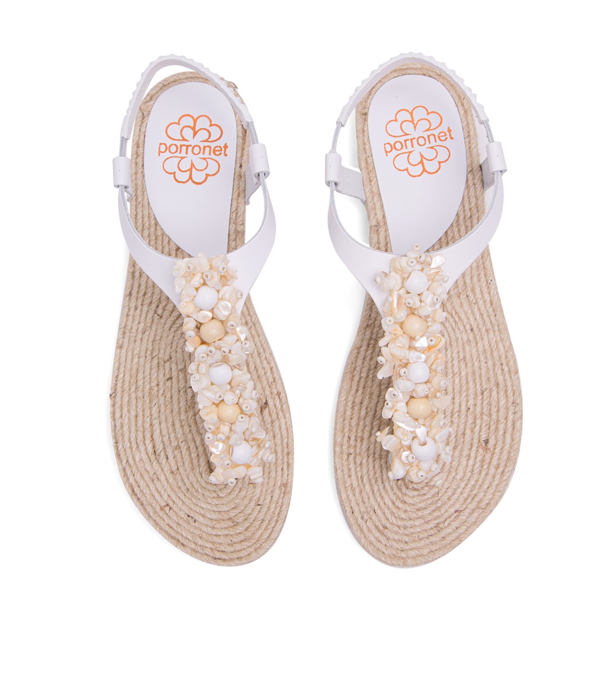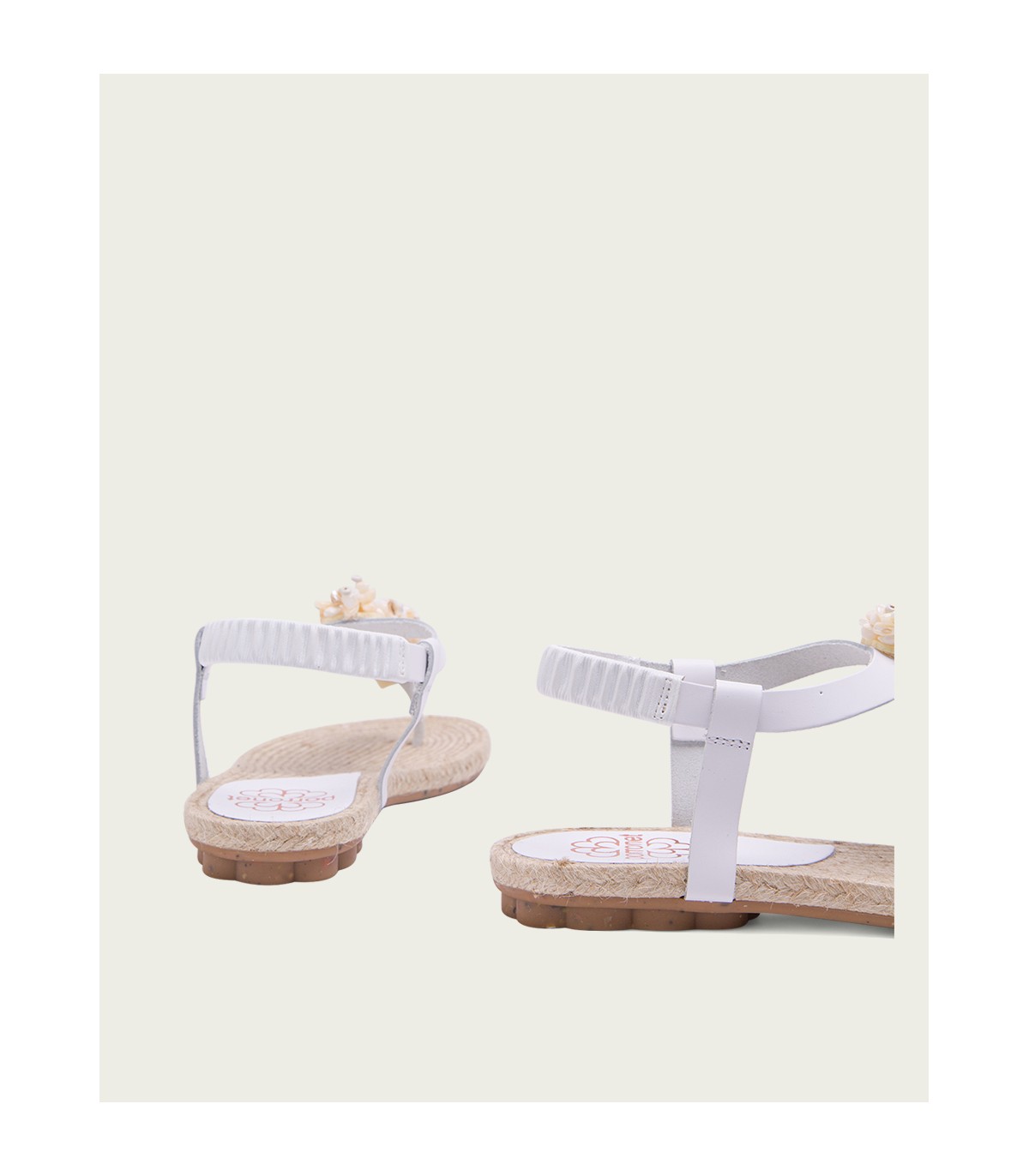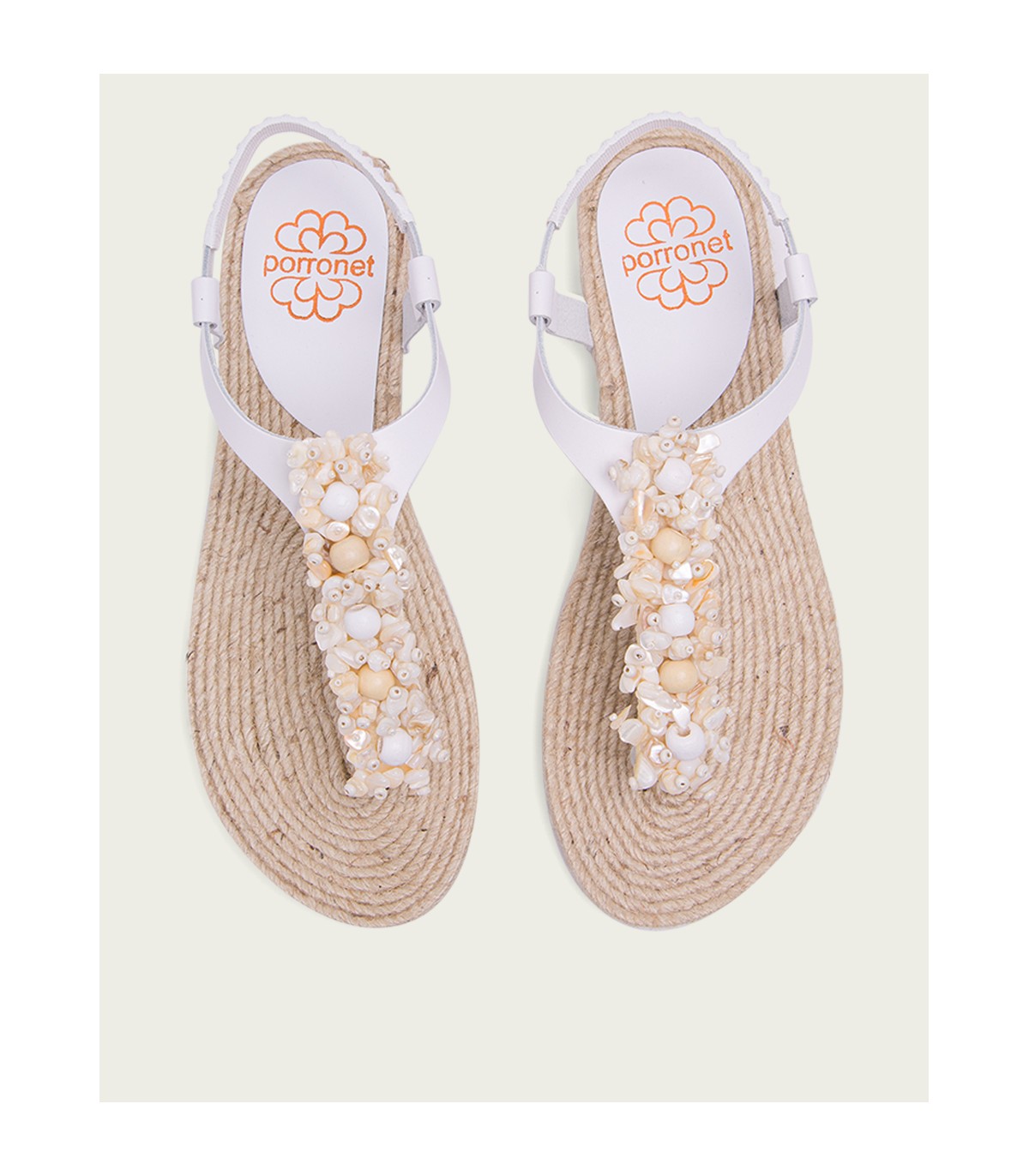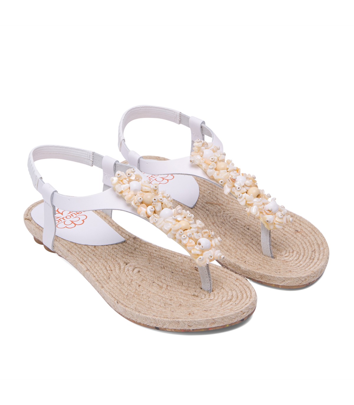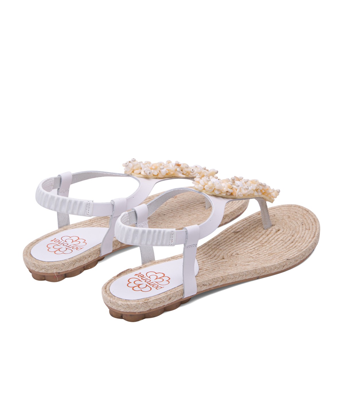 Sandalia plana tipo esclava con original aplique con avalorios de madera de estilo etnico. Corte y talonera de piel de color blanco. Piso de goma flexible elaborado con tecnologías y parte de materiales reciclados y 100% reciclables, que ayudan a reducir el impacto medioambiental. Fabricado artesanalmente en España.