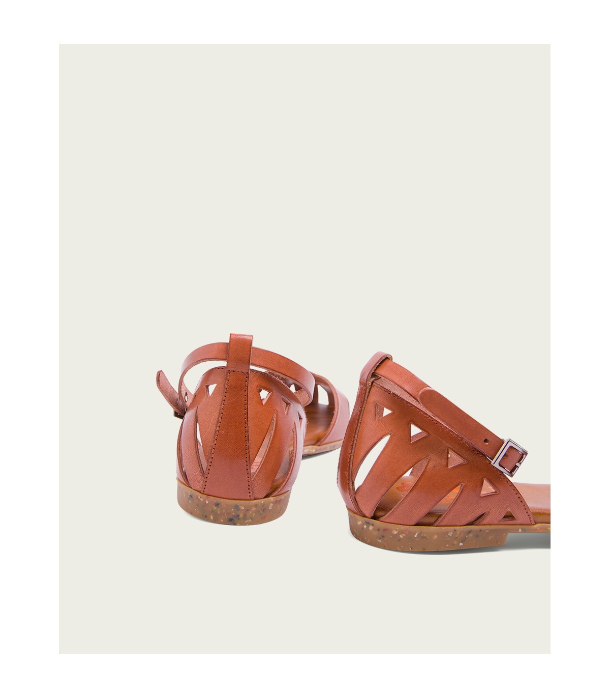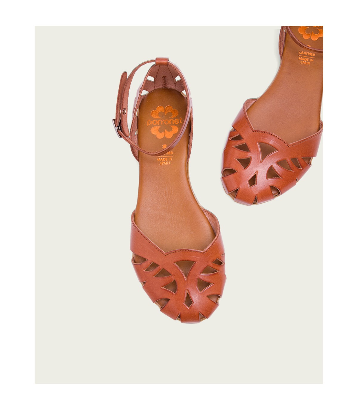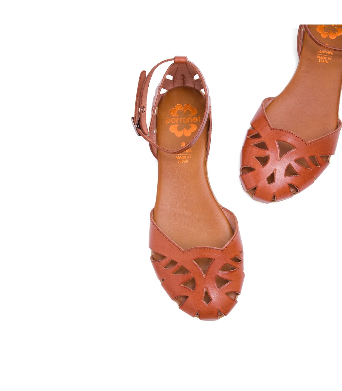 Sandalia plana de piel de color cuero con pala y talón troquelado. Cierre con tira ajustable con hebilla. Plantilla en piel acolchada que junto al piso de goma flexible antideslizante garantiza una gran comodidad. Fabricado en España.