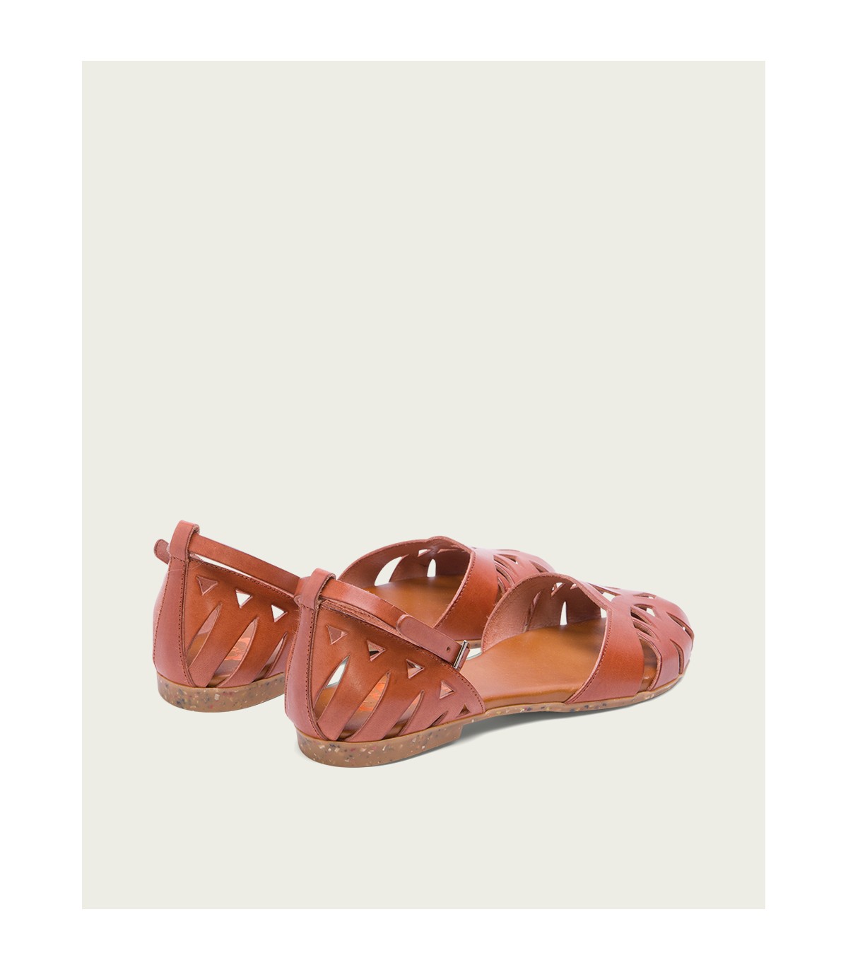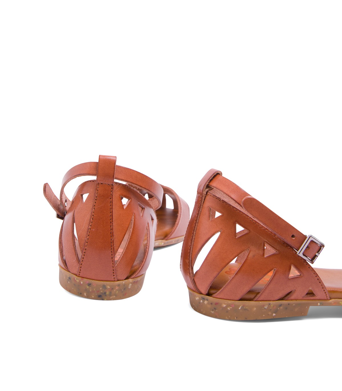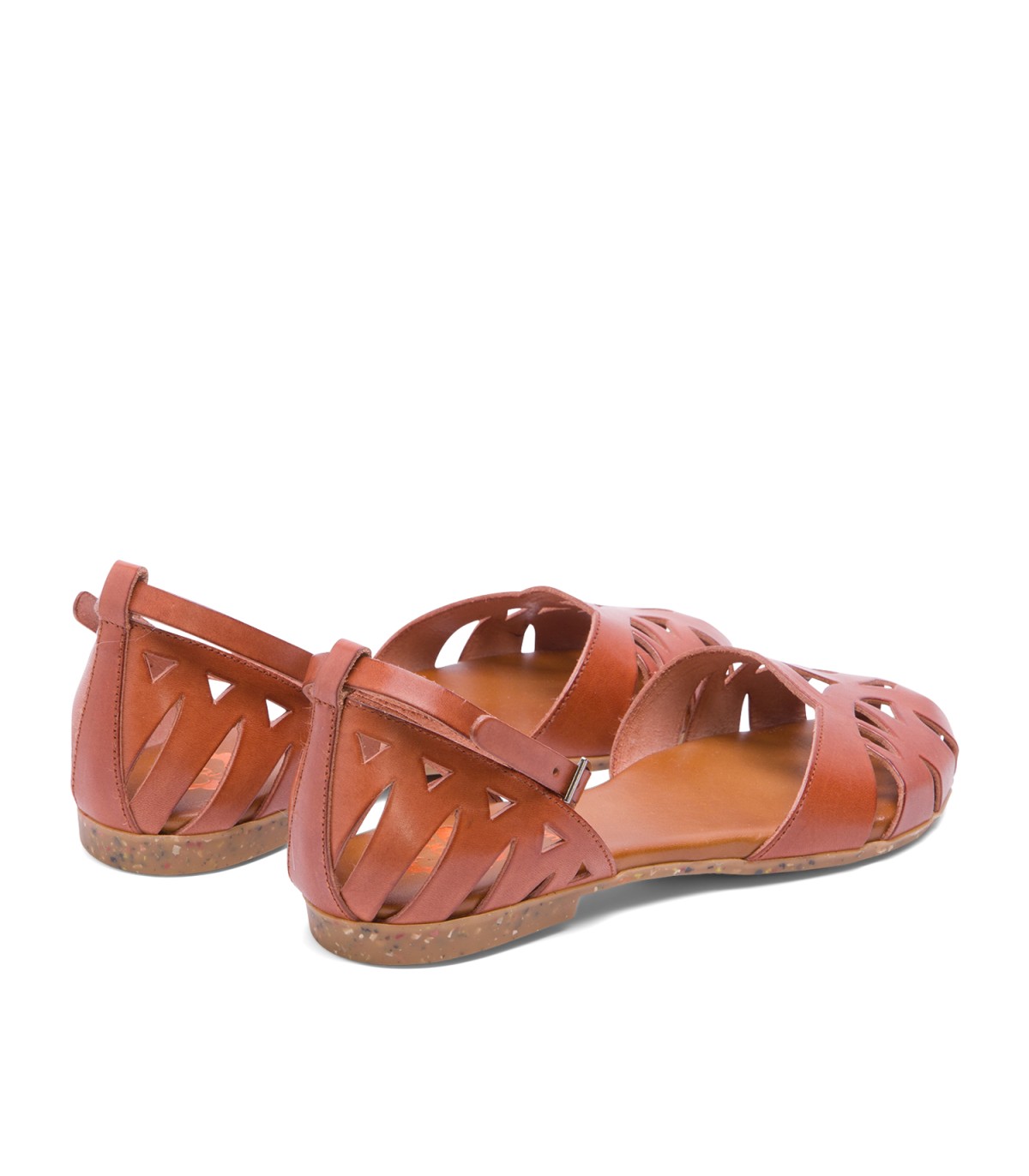 Sandalia plana de piel de color cuero con pala y talón troquelado. Cierre con tira ajustable con hebilla. Plantilla en piel acolchada que junto al piso de goma flexible antideslizante garantiza una gran comodidad. Fabricado en España.