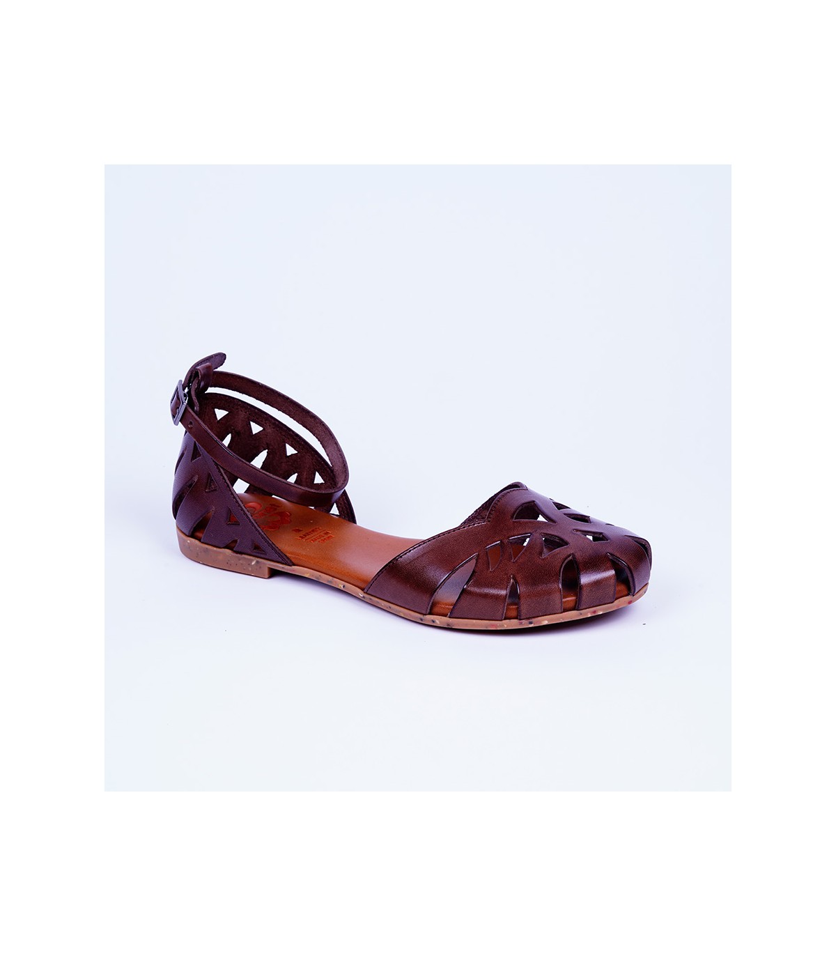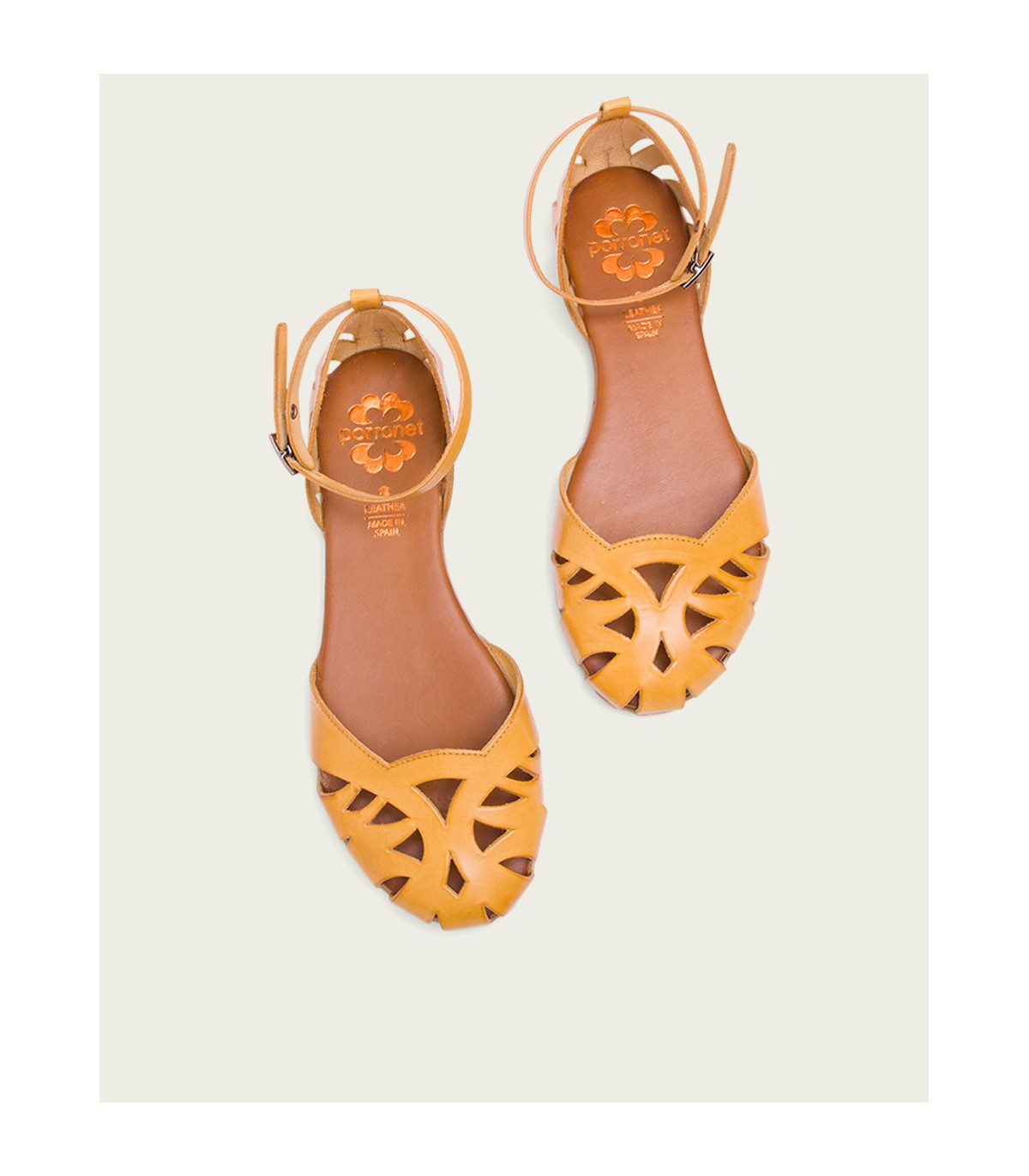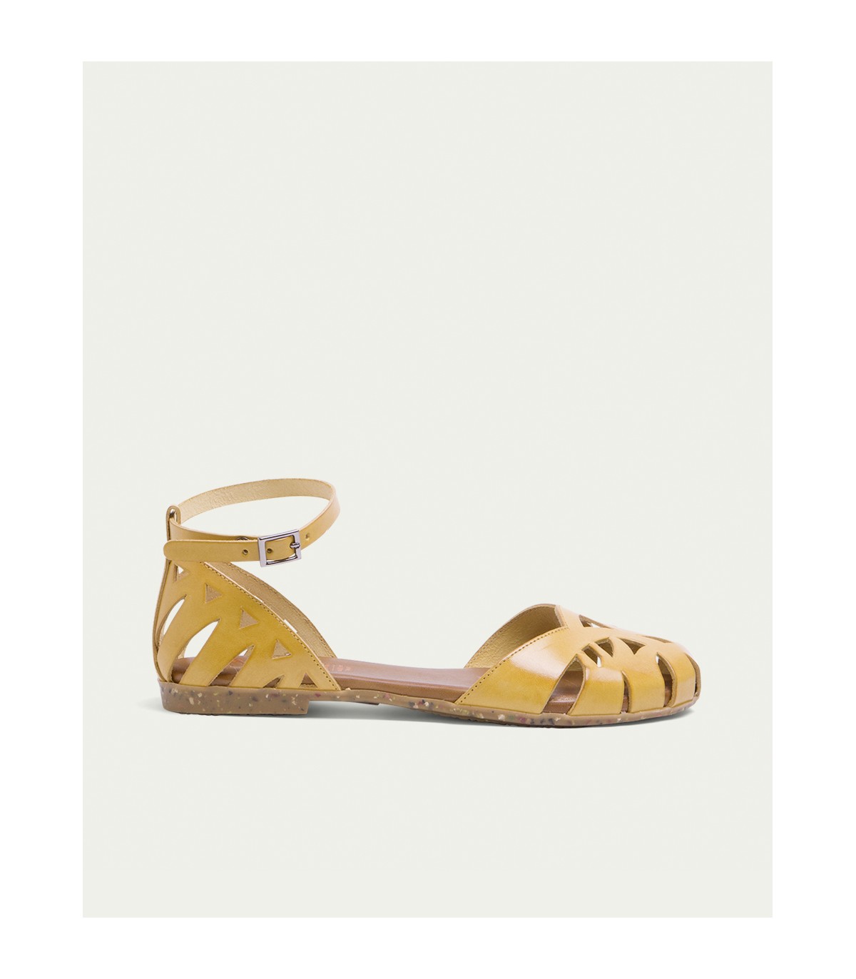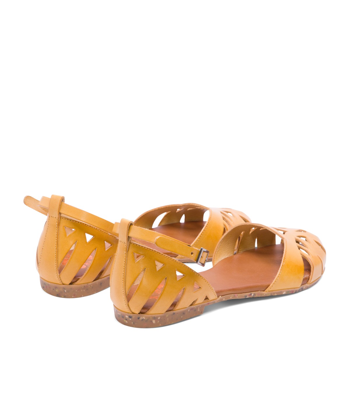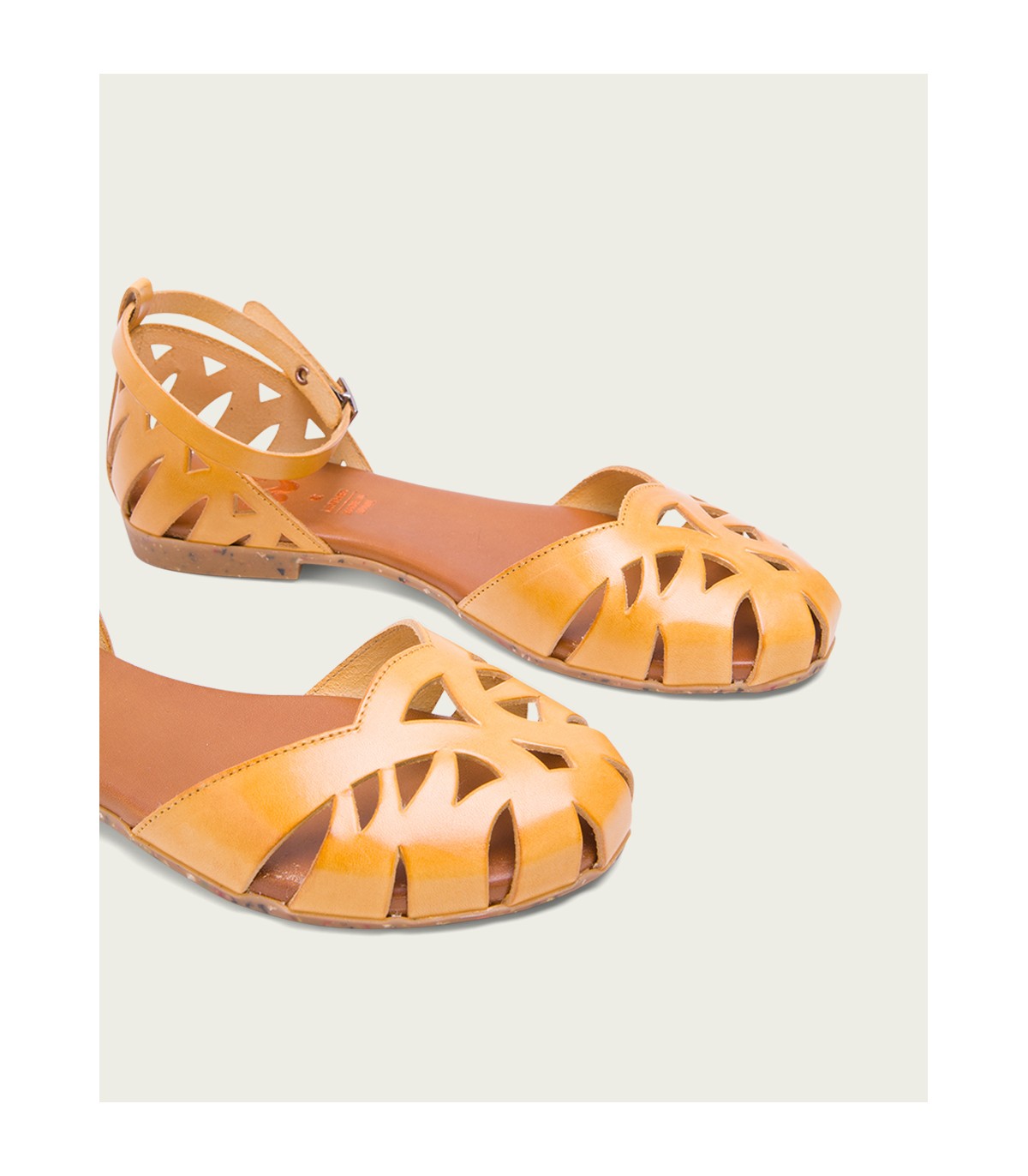 Sandalia plana de piel de color mostaza con pala y talón troquelado. Cierre con tira ajustable con hebilla. Plantilla en piel acolchada que junto al piso de goma flexible antideslizante garantiza una gran comodidad. Fabricado en España.
