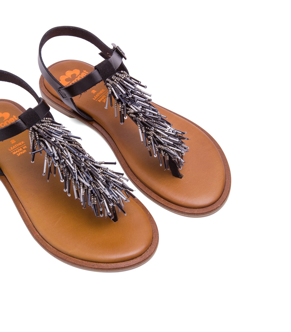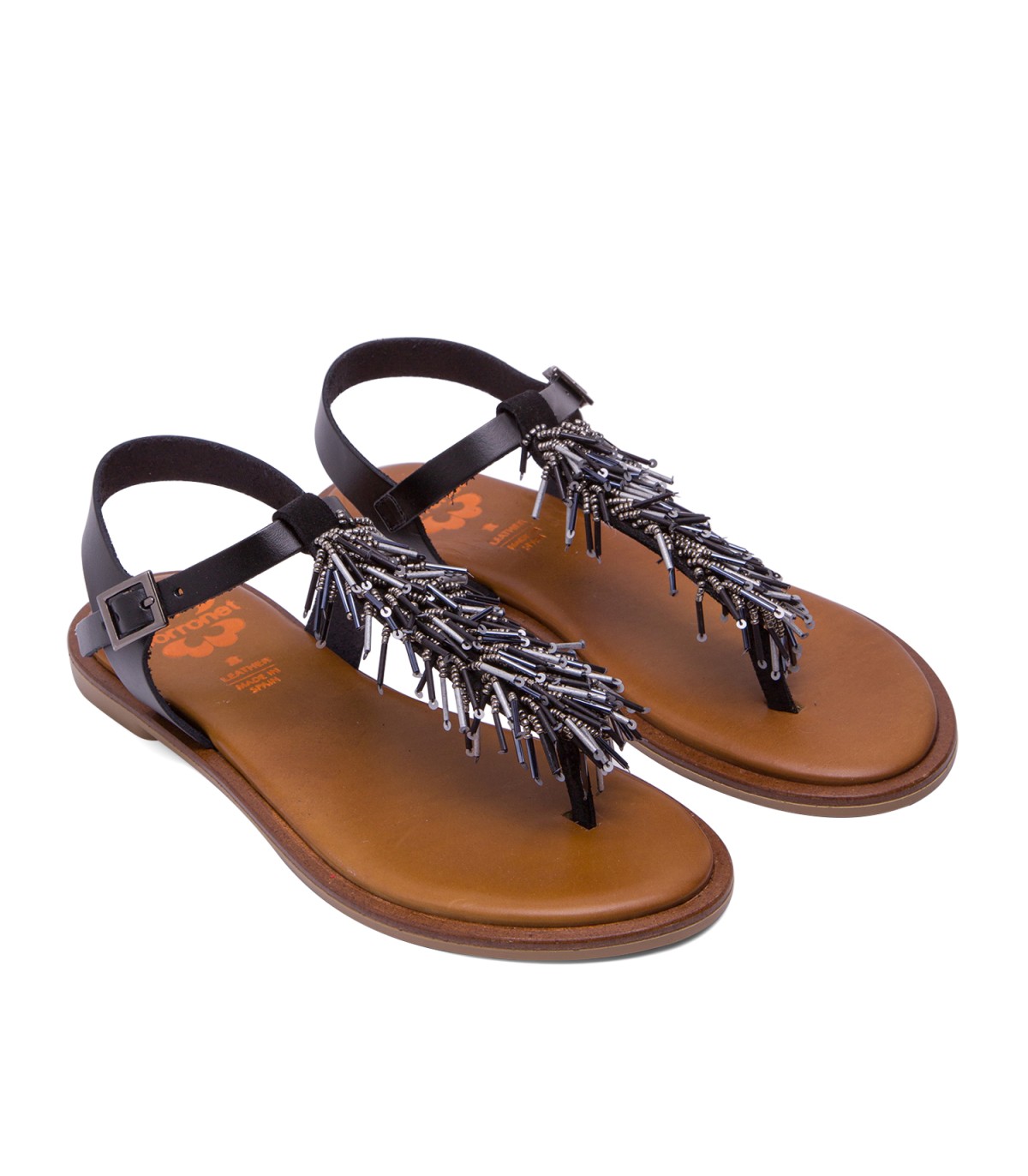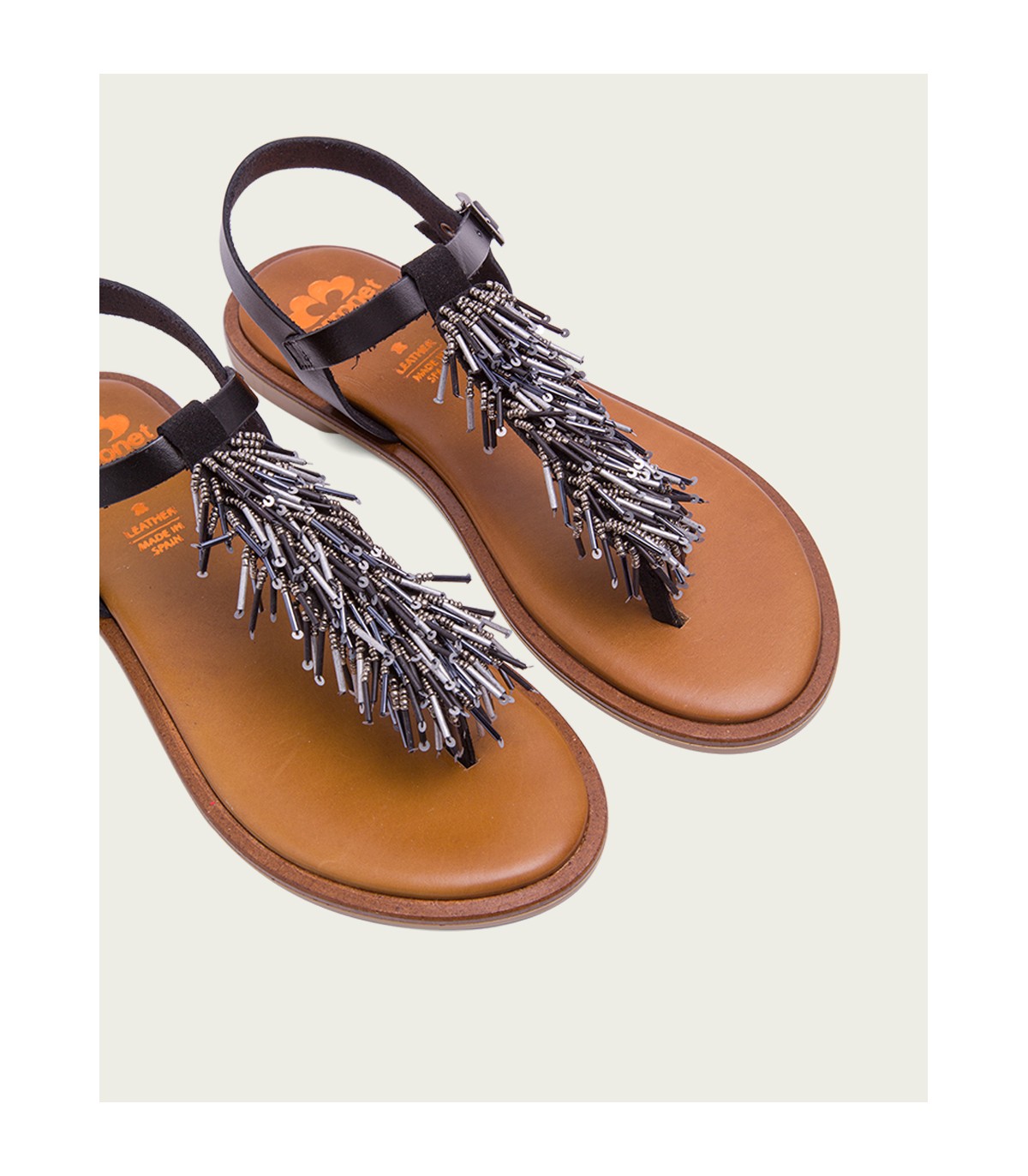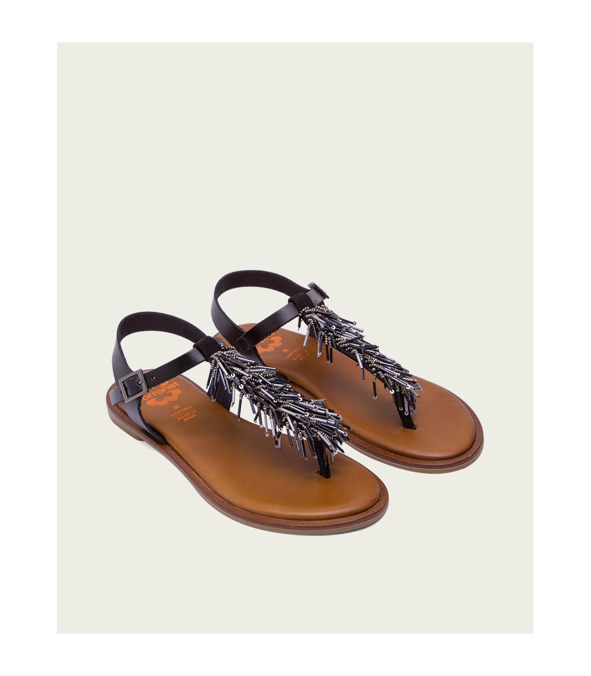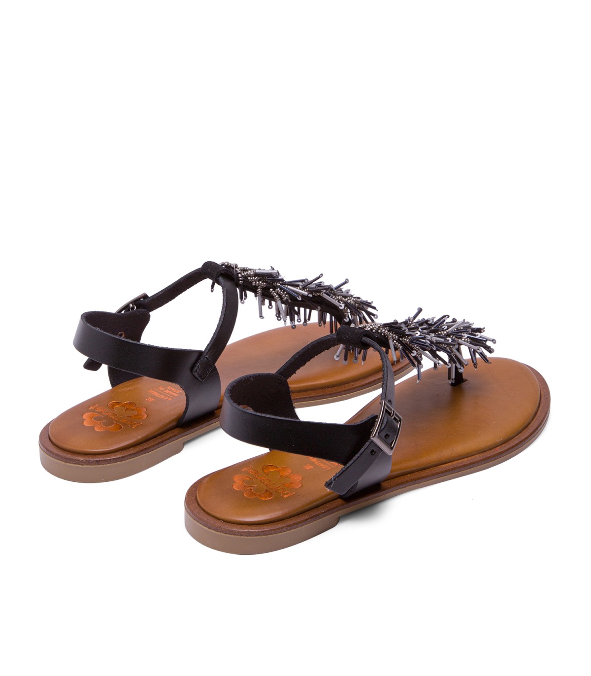 Sandalia plana de piel tipo esclava con original aplique de abalorios en tonos metalizados. Plantilla de piel acolchada que junto al piso de goma flexible garantiza una gran comodidad. Fabricado artesanalmente en España.