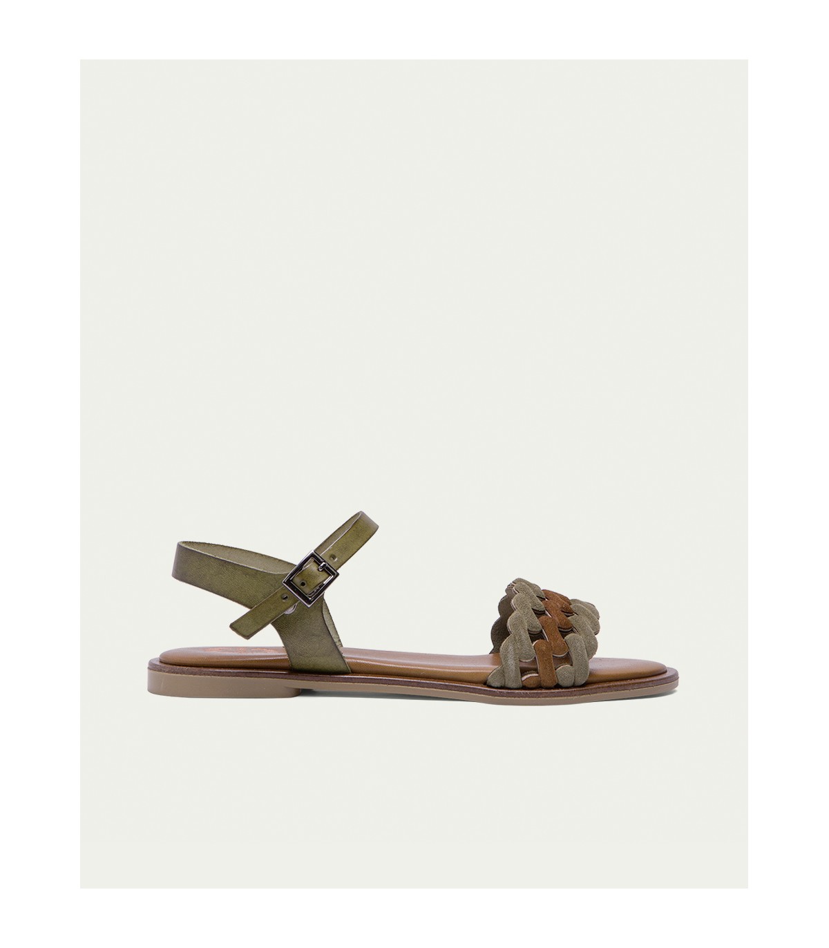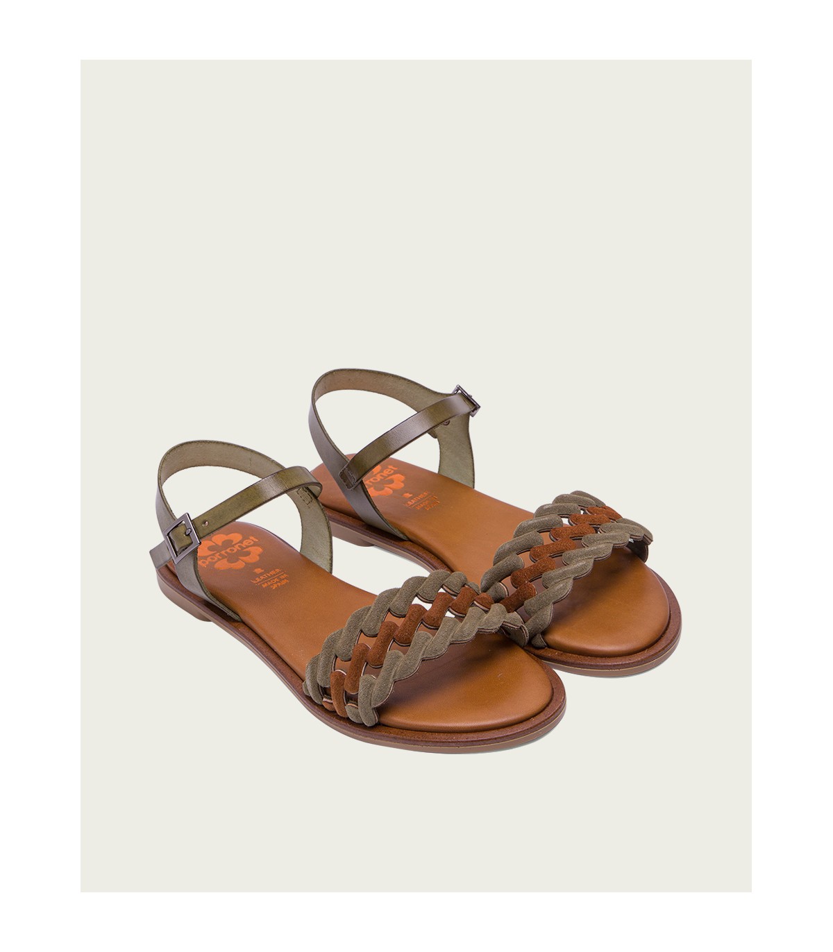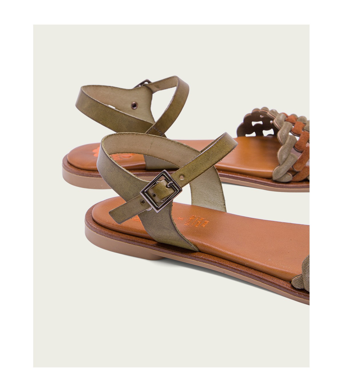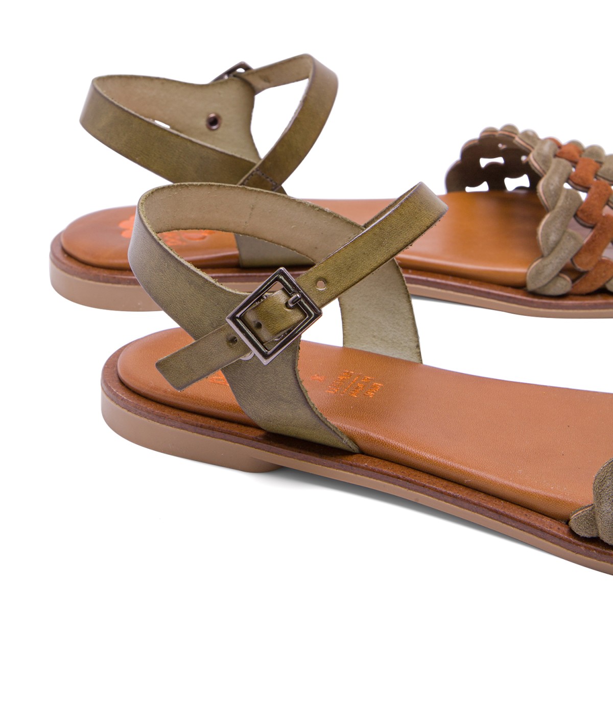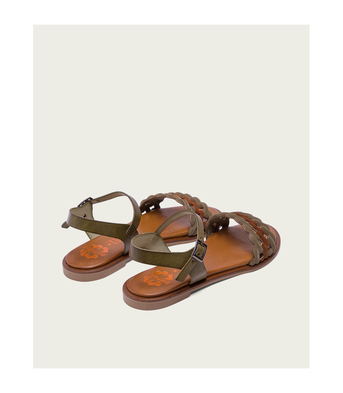 Sandalia plana con original pala de serraje de color kaki y cuero. Cierre mediante pulsera de piel en el tobillo ajustable con hebilla metálica. Plantilla acolchada de piel y piso de goma flexible elaborado con tecnologías y parte de materiales reciclados y 100% reciclables, que ayudan a reducir el impacto medioambiental. Fabricado artesanalmente en España.