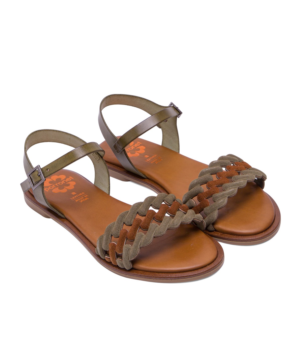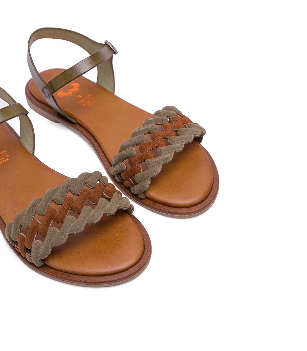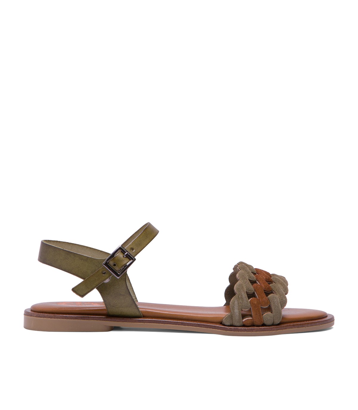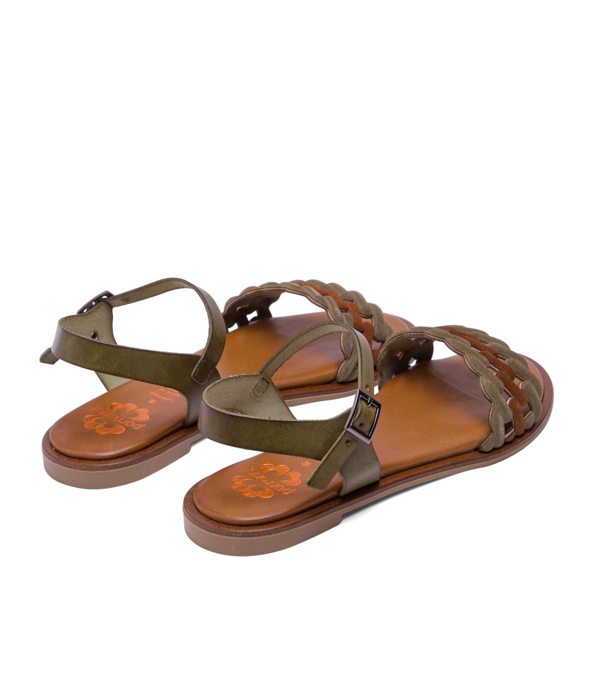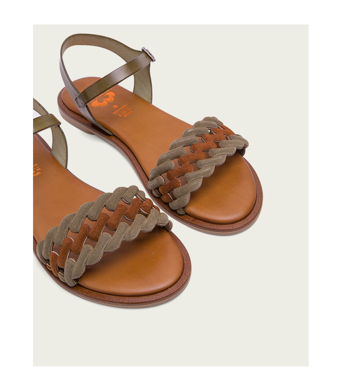 Sandalia plana con original pala de serraje de color kaki y cuero. Cierre mediante pulsera de piel en el tobillo ajustable con hebilla metálica. Plantilla acolchada de piel y piso de goma flexible elaborado con tecnologías y parte de materiales reciclados y 100% reciclables, que ayudan a reducir el impacto medioambiental. Fabricado artesanalmente en España.
