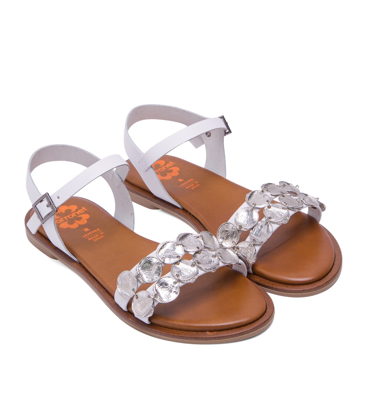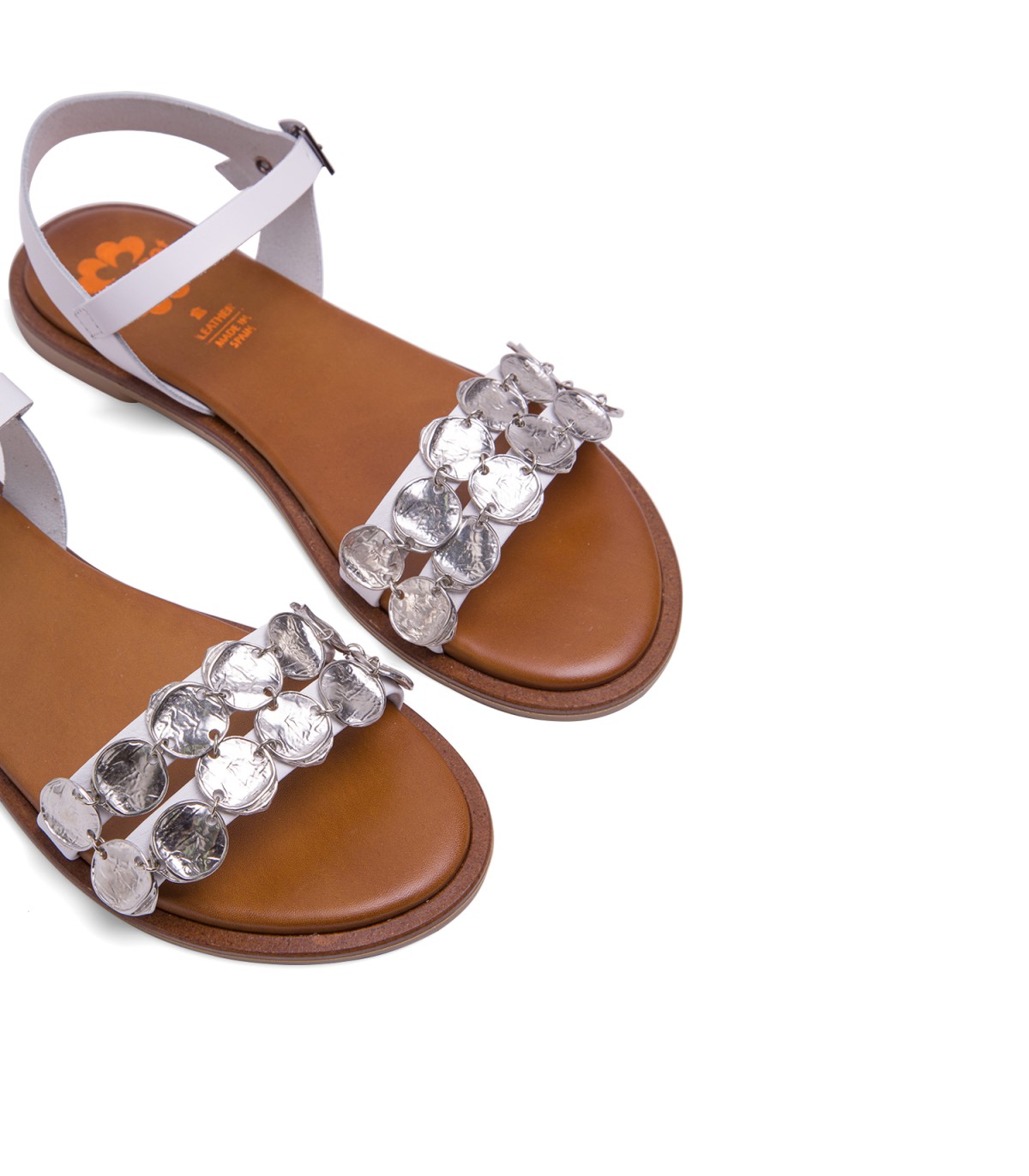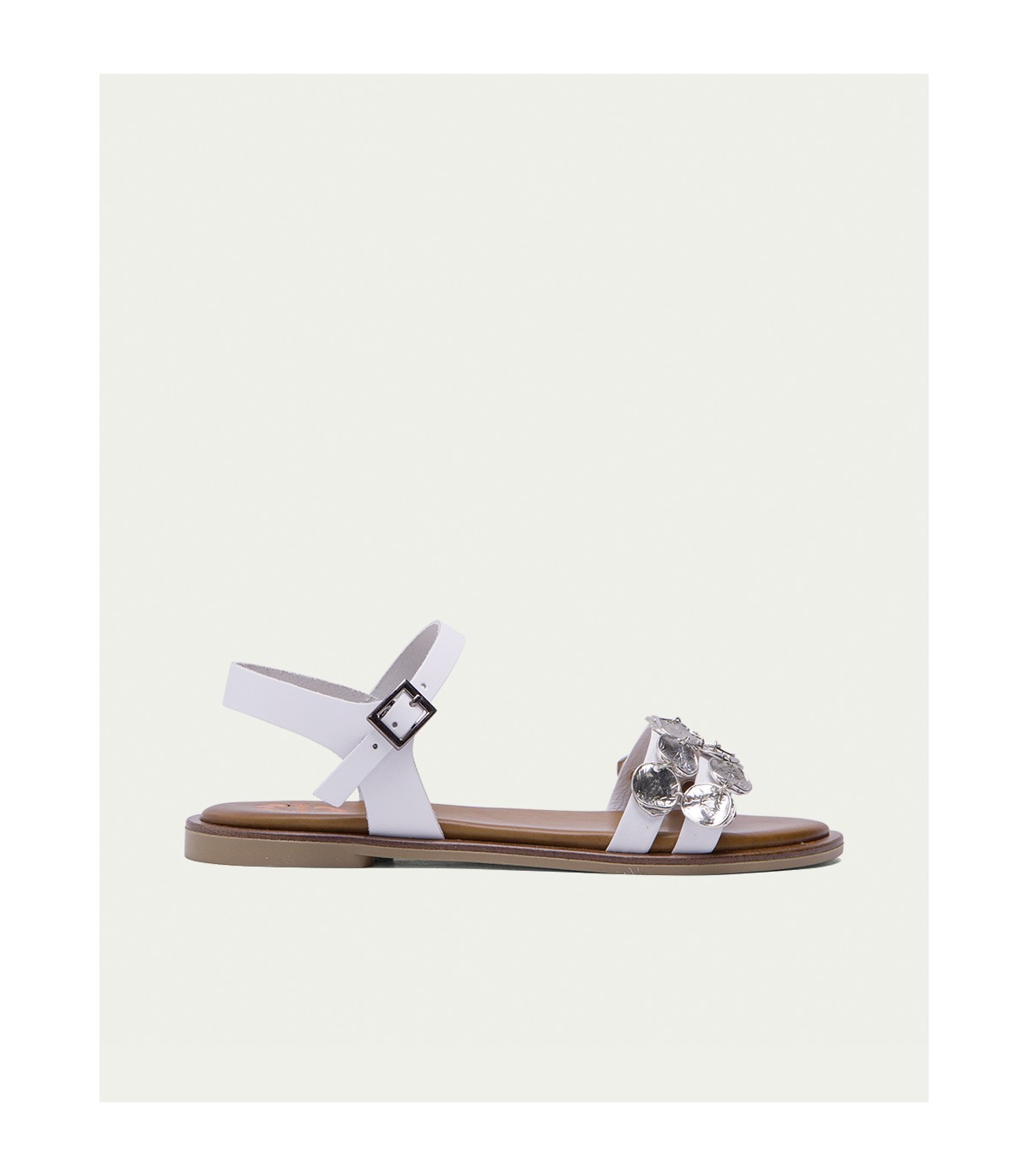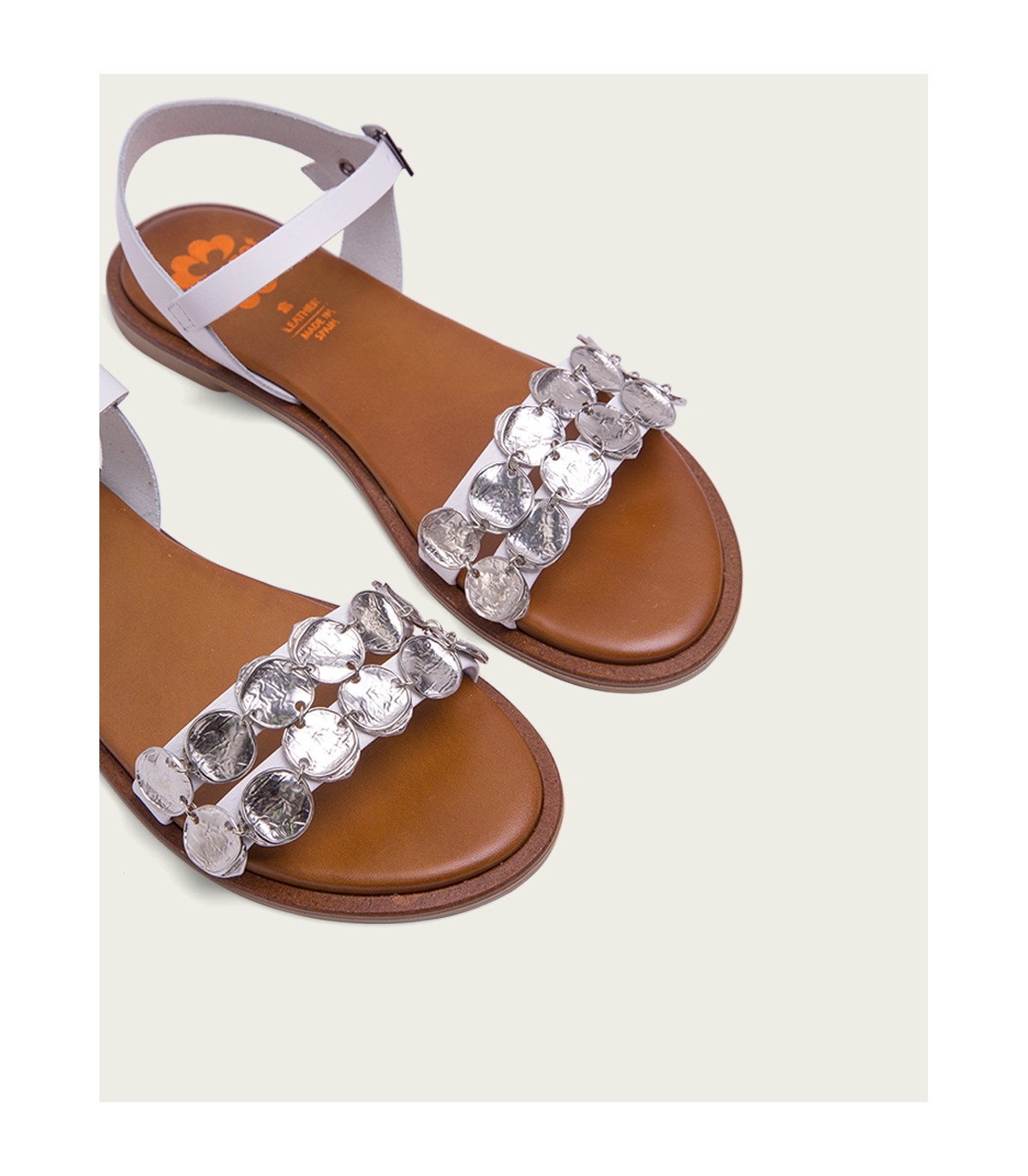 Sandalia plana de color blanco con pala formada con dos tiras con apliques metalizados. Cierre mediante pulsera de piel en el tobillo ajustable con hebilla metálica. Plantilla acolchada de piel y piso de goma flexible elaborado con tecnologías y parte de materiales reciclados y 100% reciclables, que ayudan a reducir el impacto medioambiental. Fabricado artesanalmente en España.