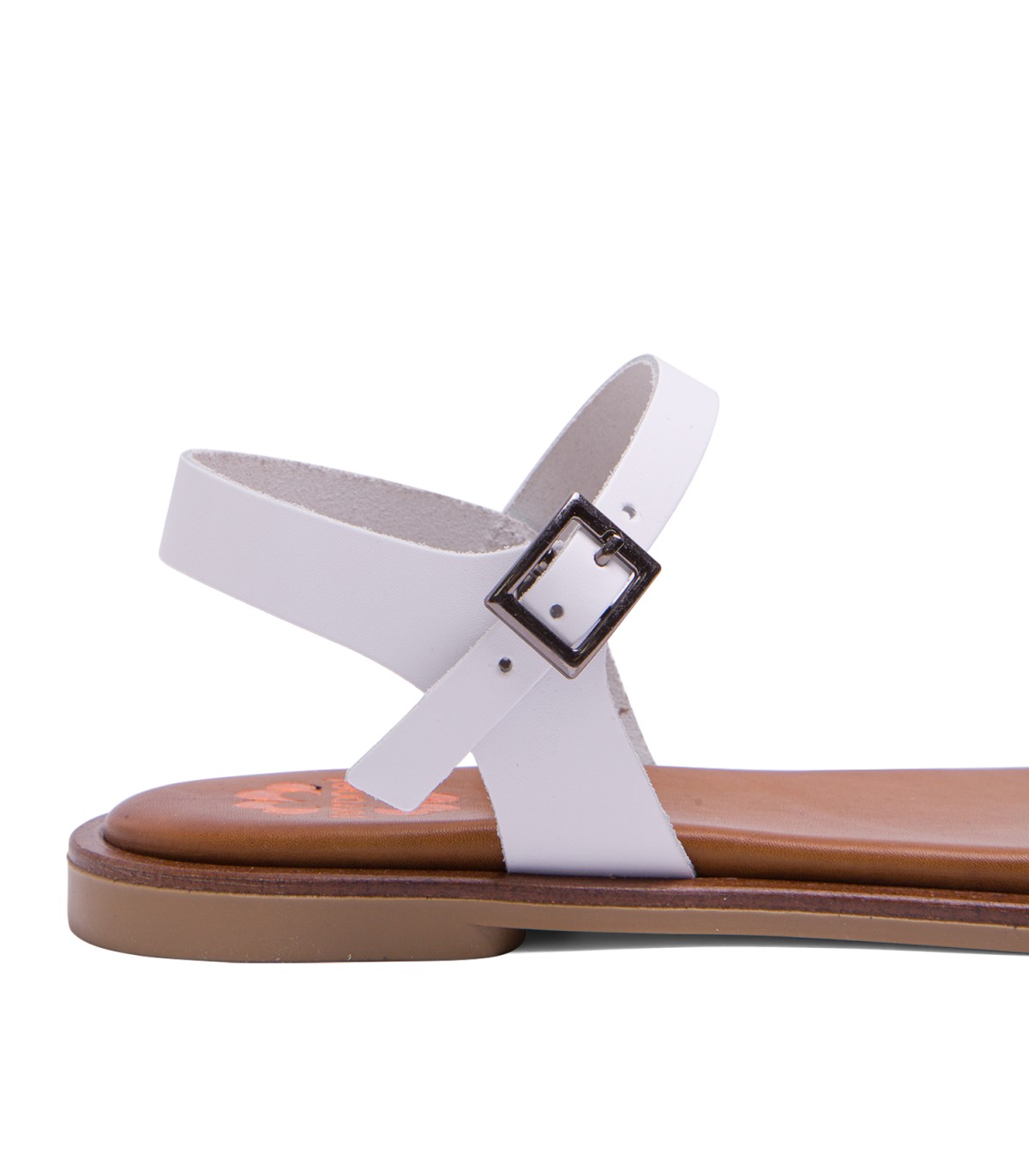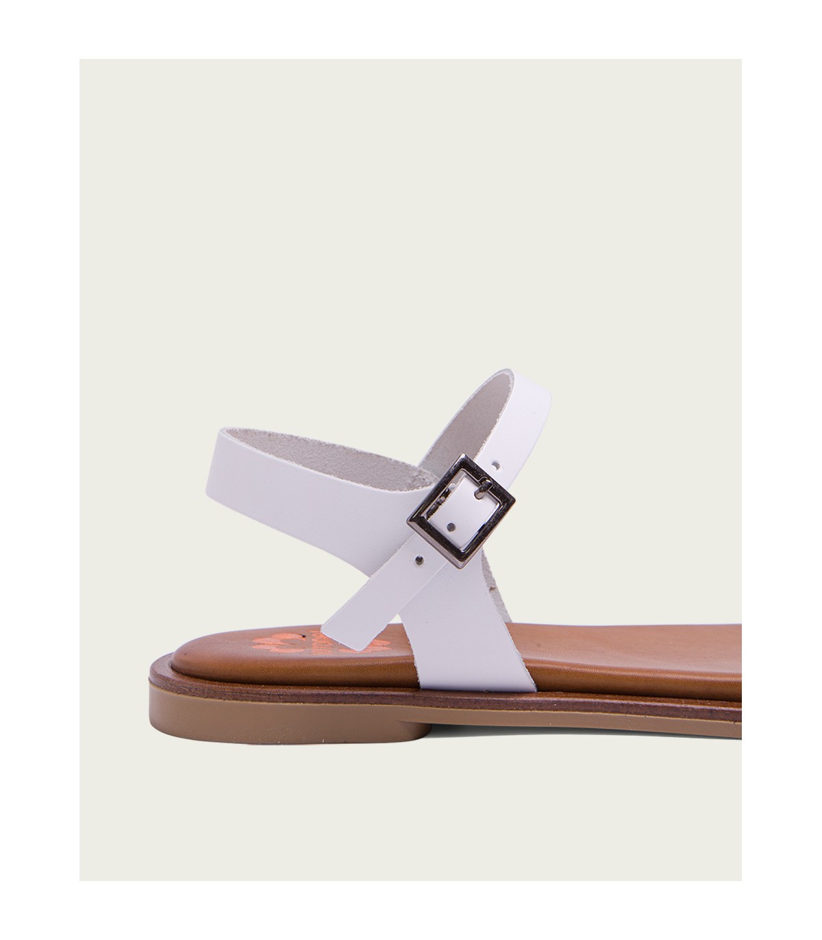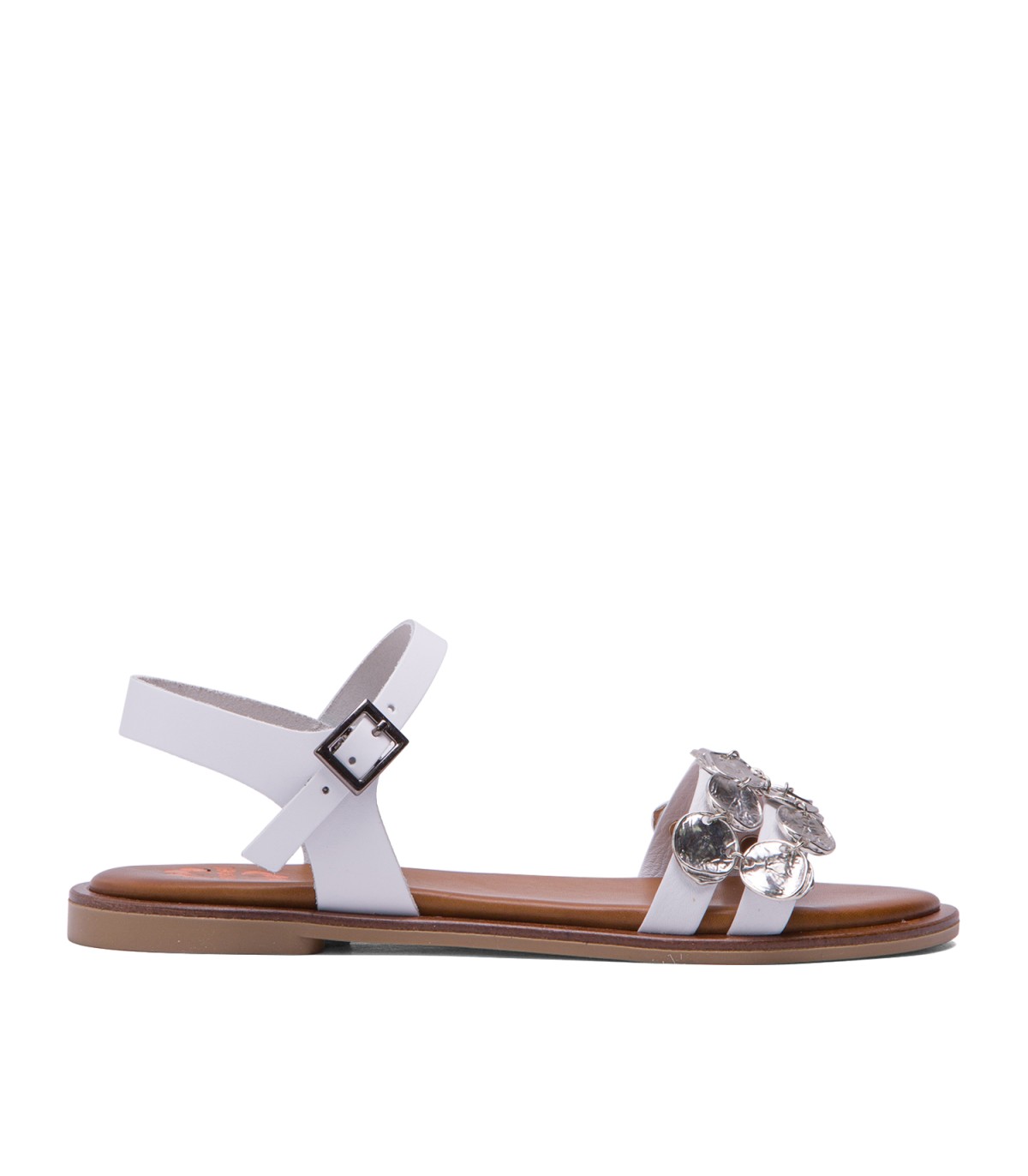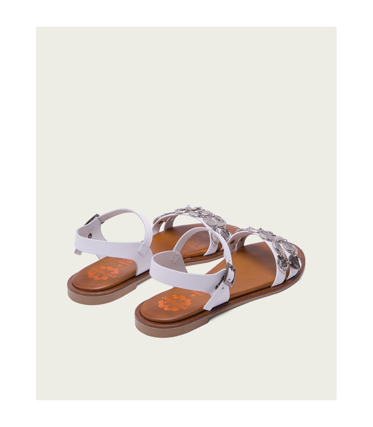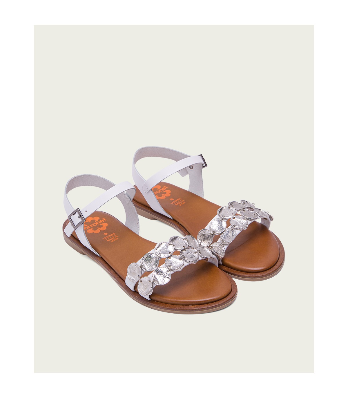 Sandalia plana de color blanco con pala formada con dos tiras con apliques metalizados. Cierre mediante pulsera de piel en el tobillo ajustable con hebilla metálica. Plantilla acolchada de piel y piso de goma flexible elaborado con tecnologías y parte de materiales reciclados y 100% reciclables, que ayudan a reducir el impacto medioambiental. Fabricado artesanalmente en España.