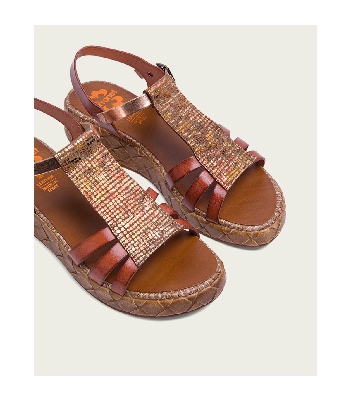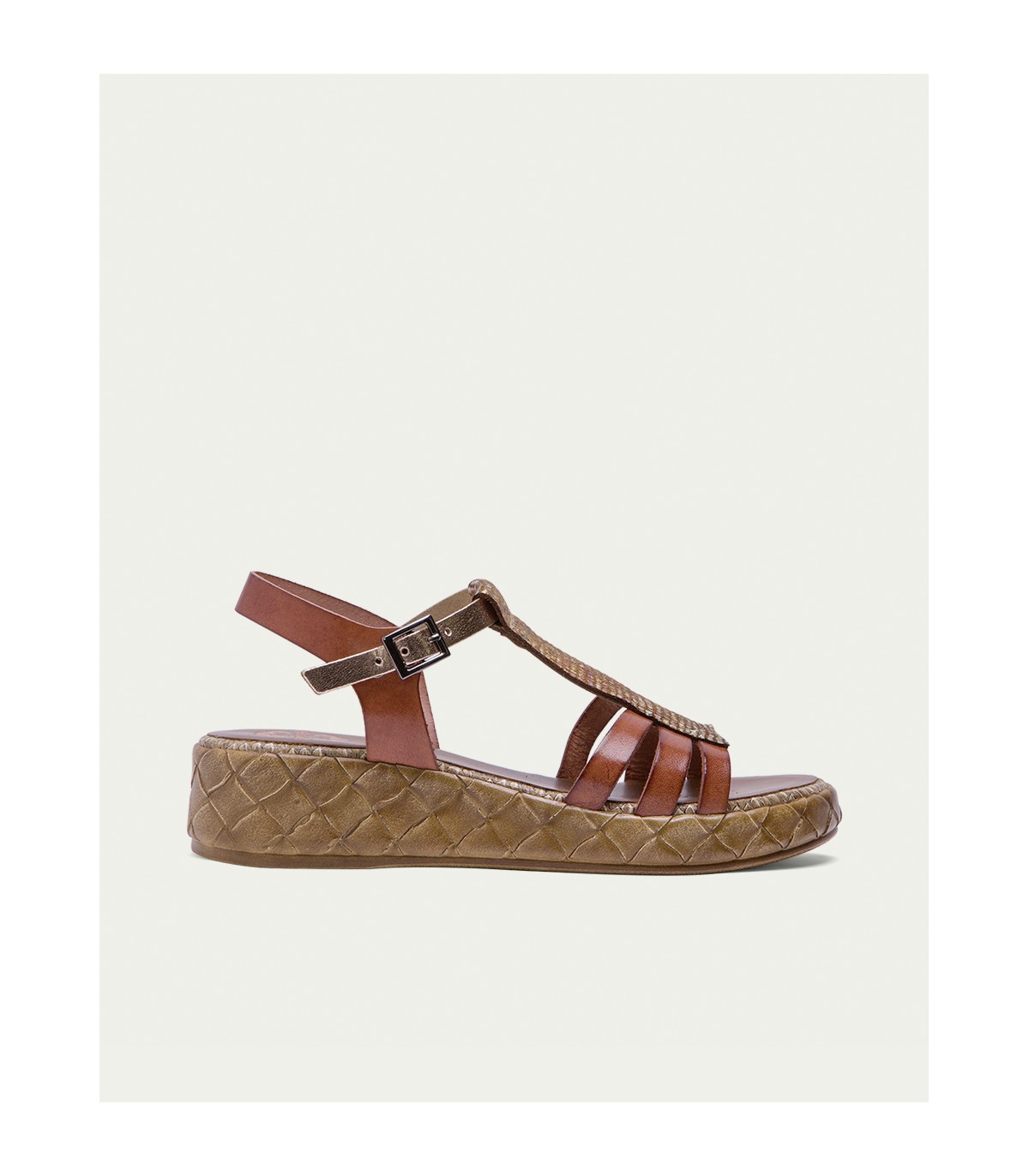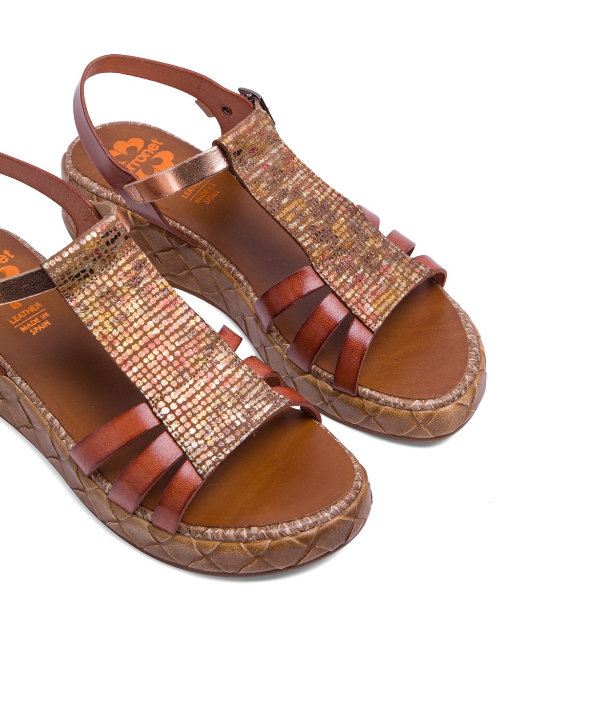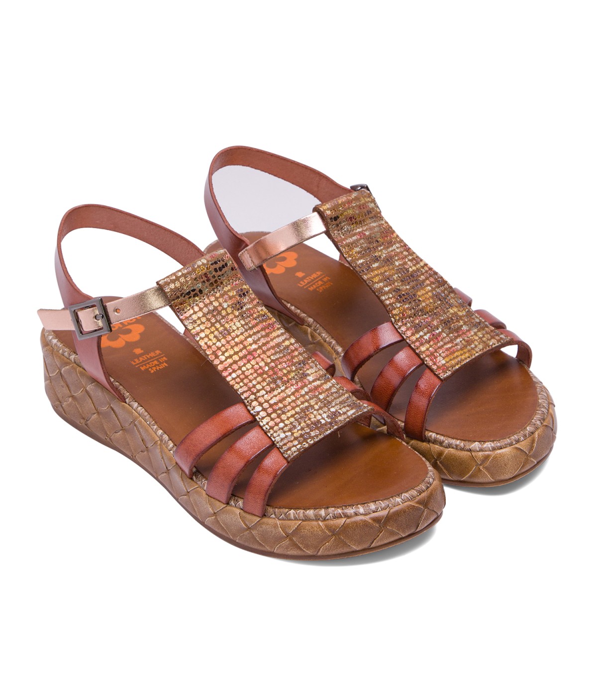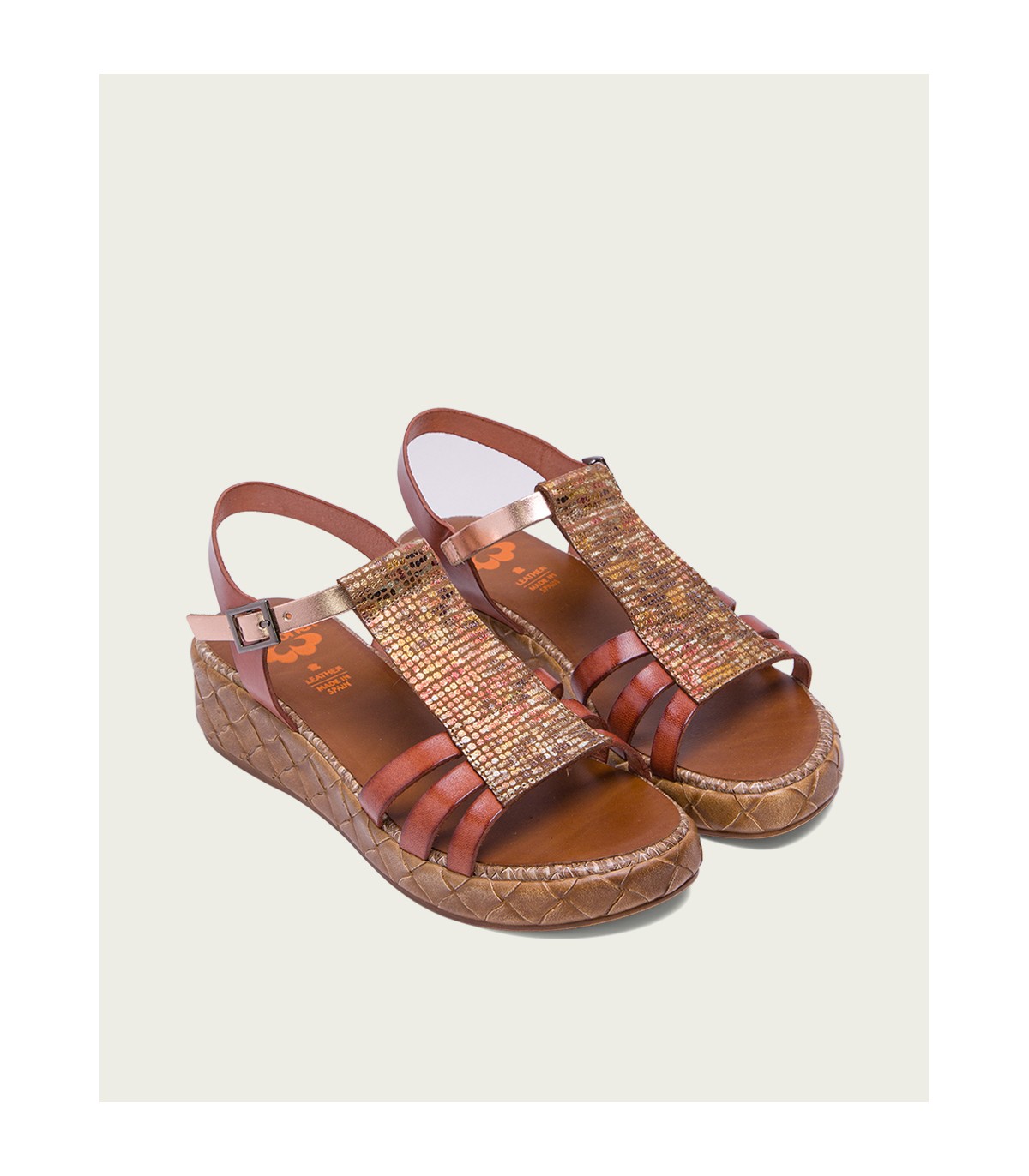 Sandalia de piel con pieza en el empeine de piel laminada en tonos metalizados. Cierre mediante pulsera de piel en el tobillo ajustable con hebilla metálica. Plantilla acolchada de piel que garantiza una gran comodidad. Cuña de 4cm de alto y 2 cm de plataforma con acabado trenzado. Fabricado artesanalmente en España.