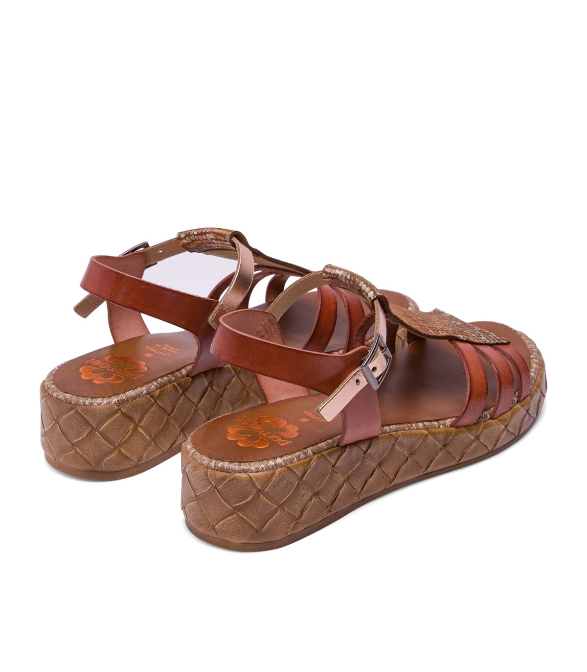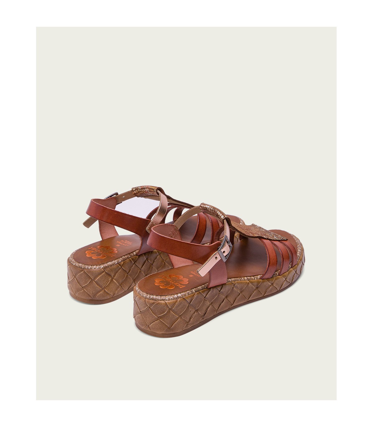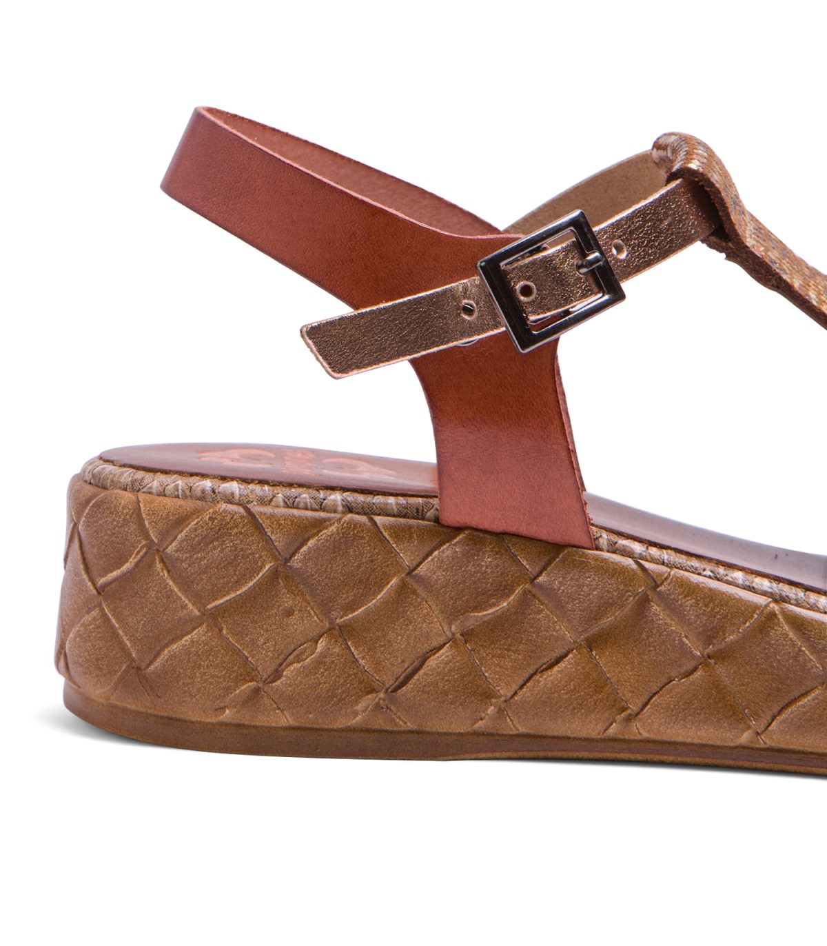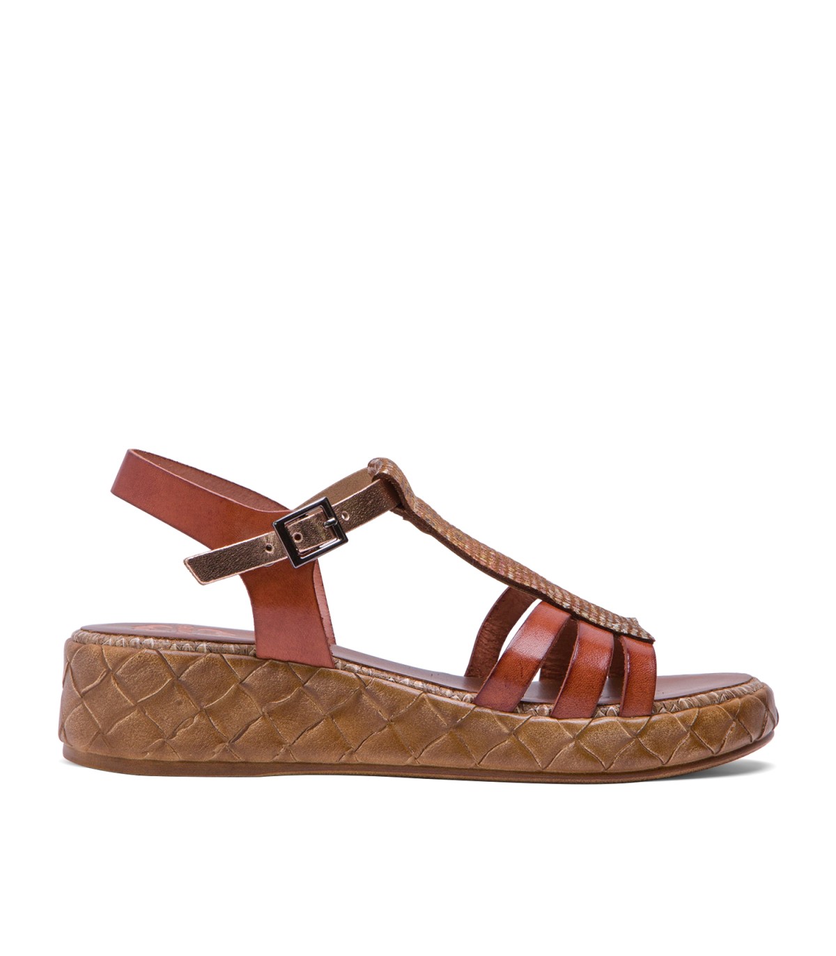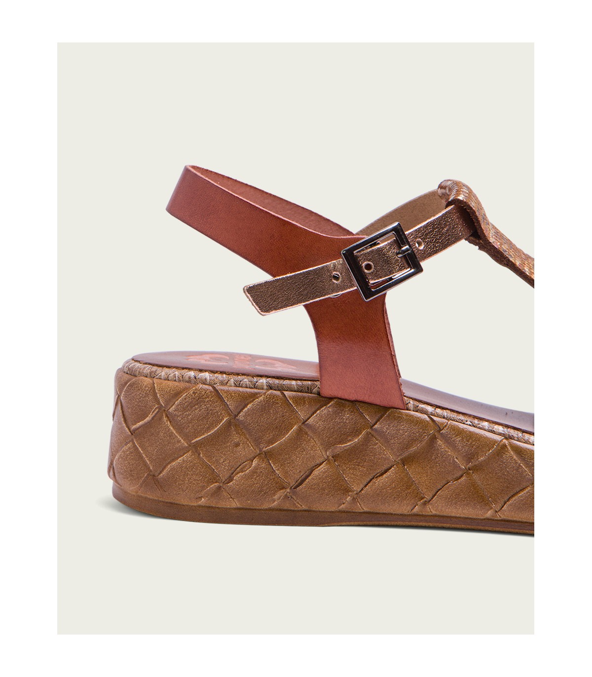 Sandalia de piel con pieza en el empeine de piel laminada en tonos metalizados. Cierre mediante pulsera de piel en el tobillo ajustable con hebilla metálica. Plantilla acolchada de piel que garantiza una gran comodidad. Cuña de 4cm de alto y 2 cm de plataforma con acabado trenzado. Fabricado artesanalmente en España.