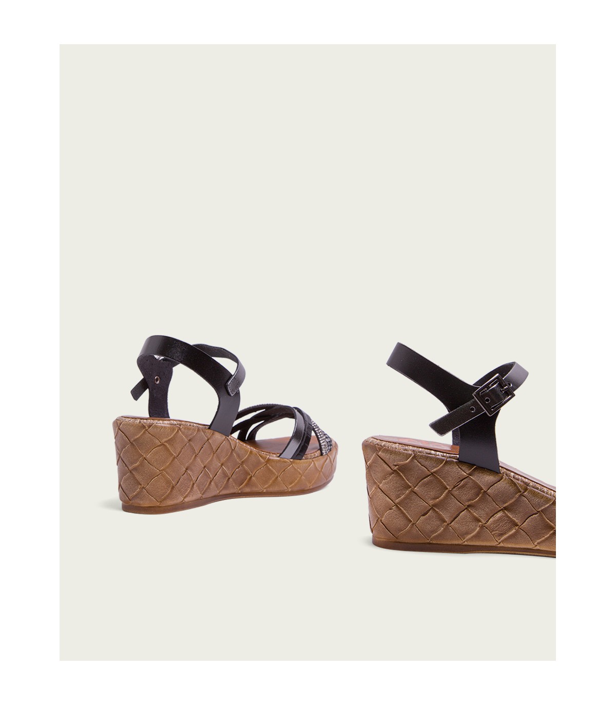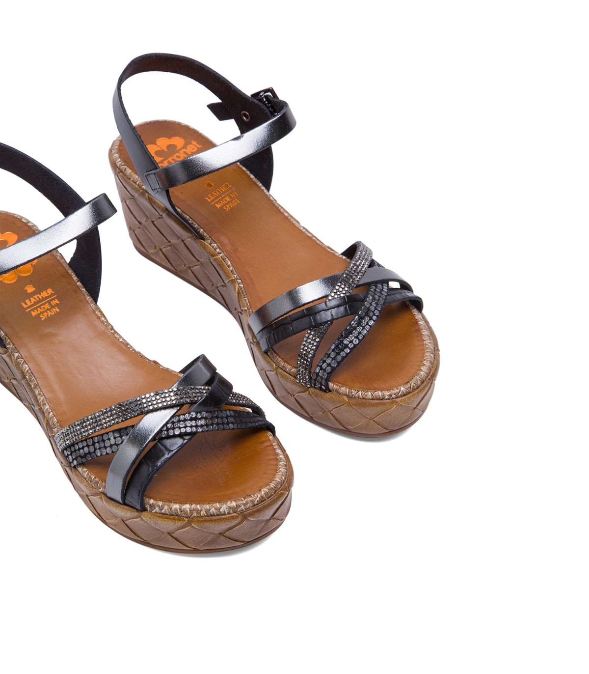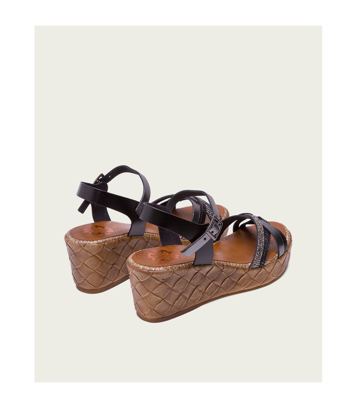 Sandalia de cuña con pala formada por tiras de piel y textil entrelazadas en tonos negro y metalizados. Cierre mediante pulsera de piel en el tobillo ajustable con hebilla metálica. Plantilla acolchada de piel que garantiza una gran comodidad. Cuña de 6,5cm de alto y 2,5cm de plataforma con acabado trenzado. Fabricado artesanalmente en España.