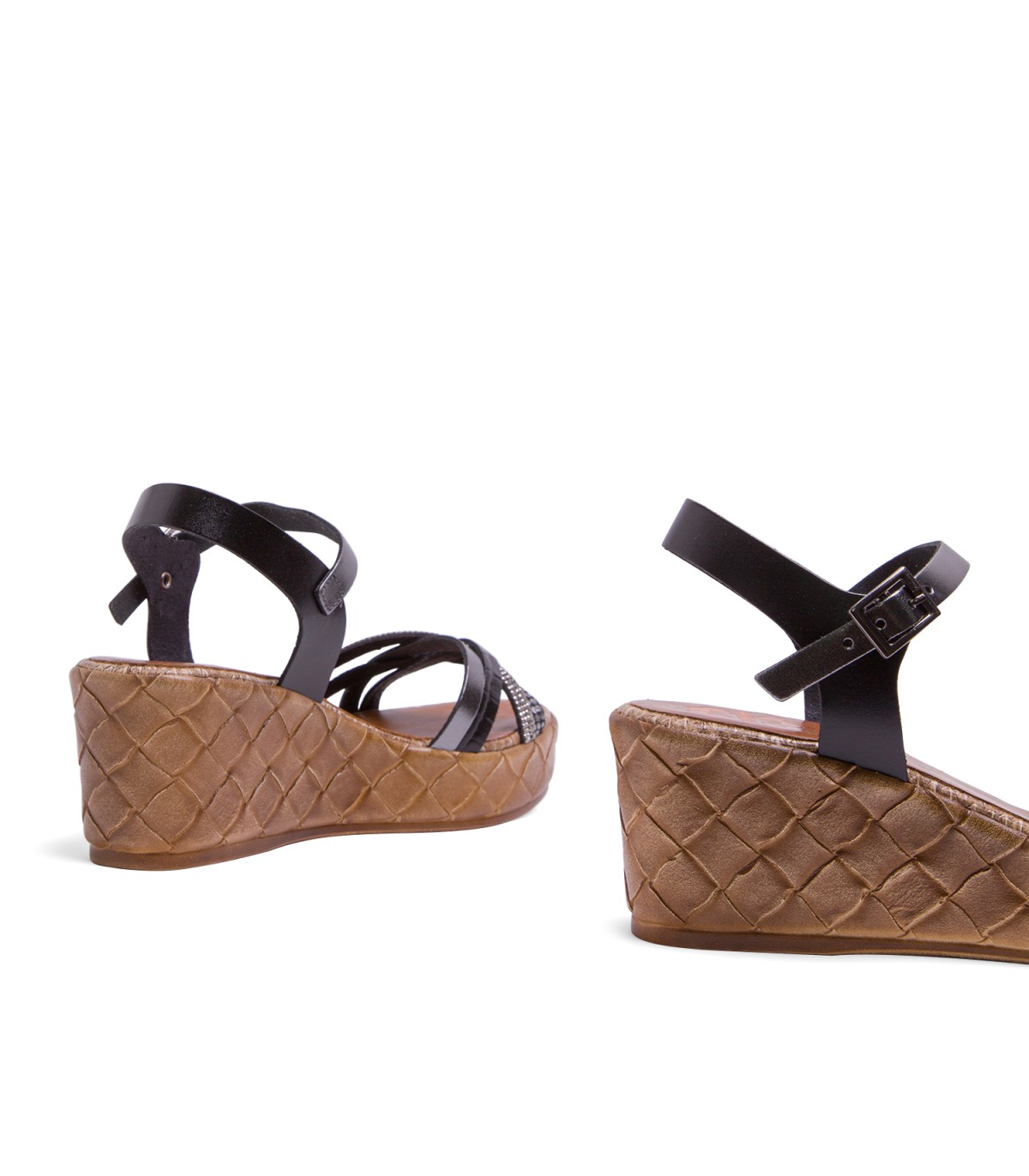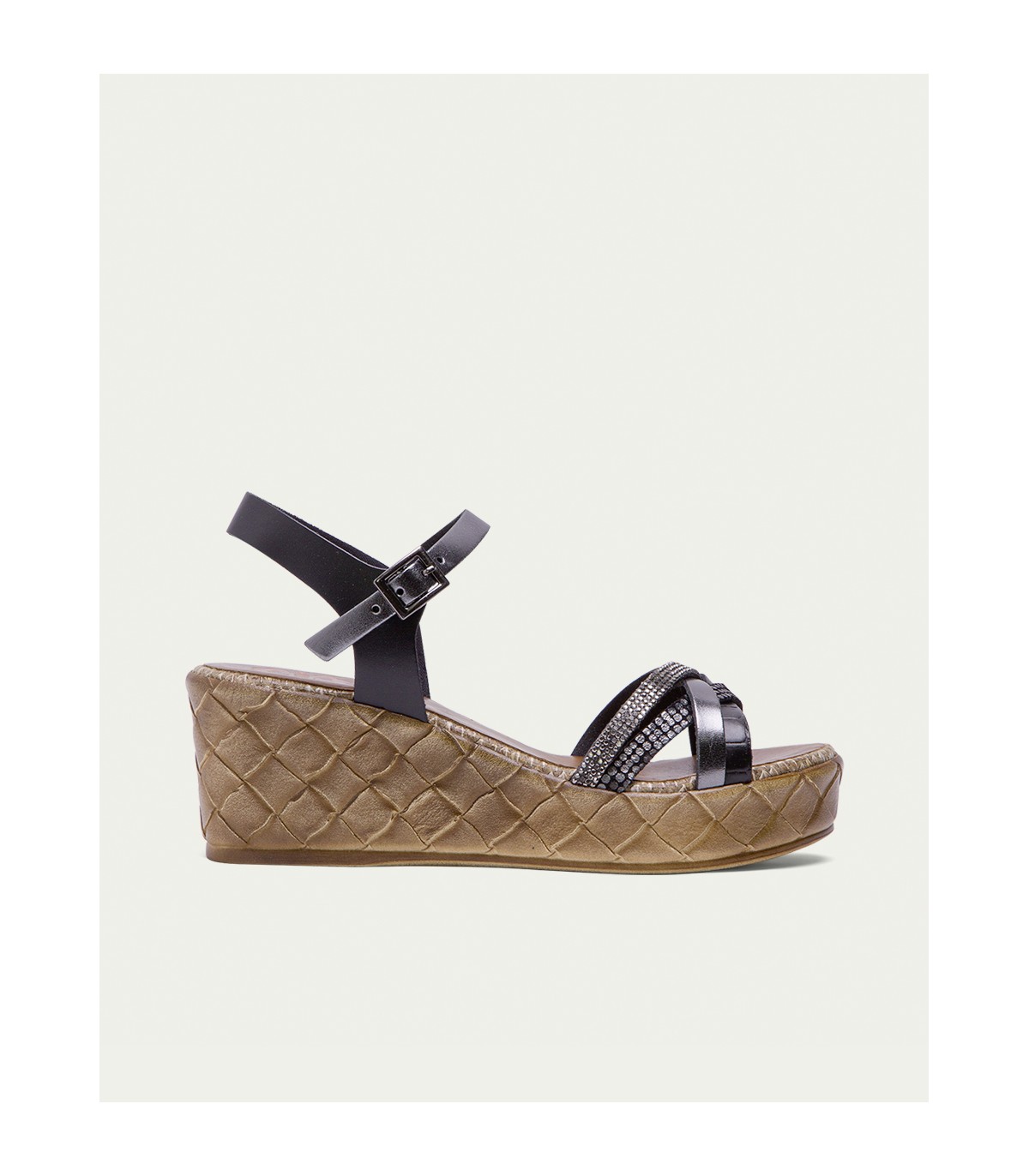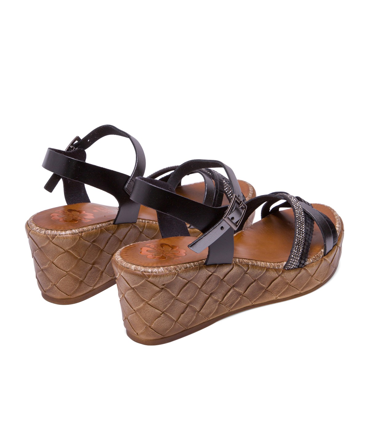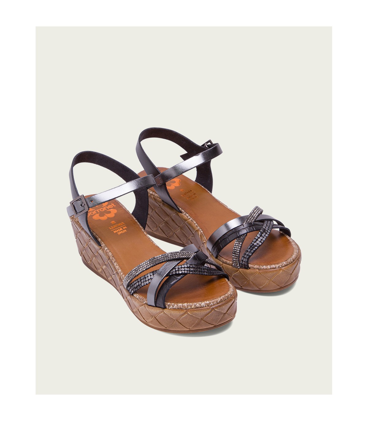 Sandalia de cuña con pala formada por tiras de piel y textil entrelazadas en tonos negro y metalizados. Cierre mediante pulsera de piel en el tobillo ajustable con hebilla metálica. Plantilla acolchada de piel que garantiza una gran comodidad. Cuña de 6,5cm de alto y 2,5cm de plataforma con acabado trenzado. Fabricado artesanalmente en España.