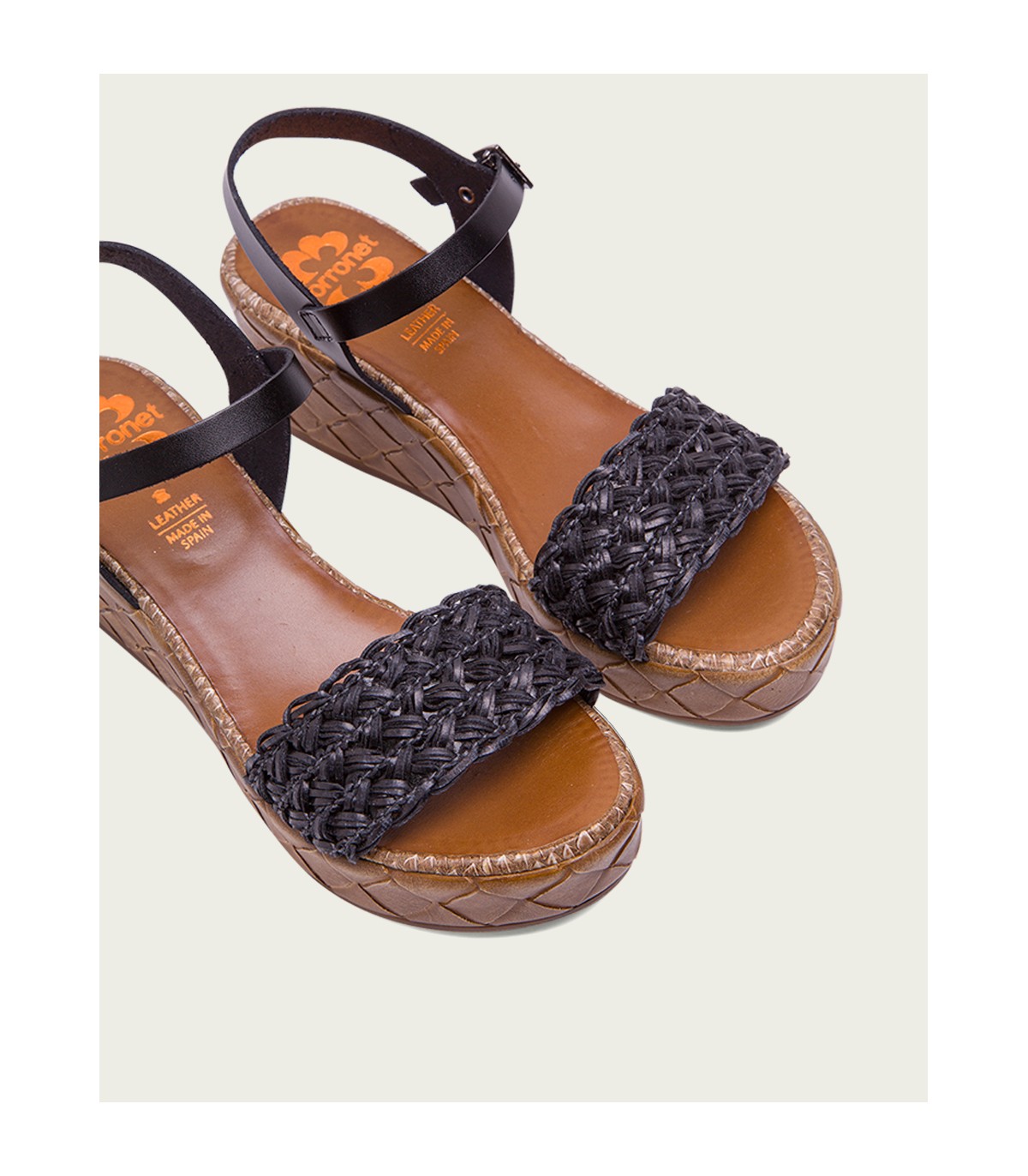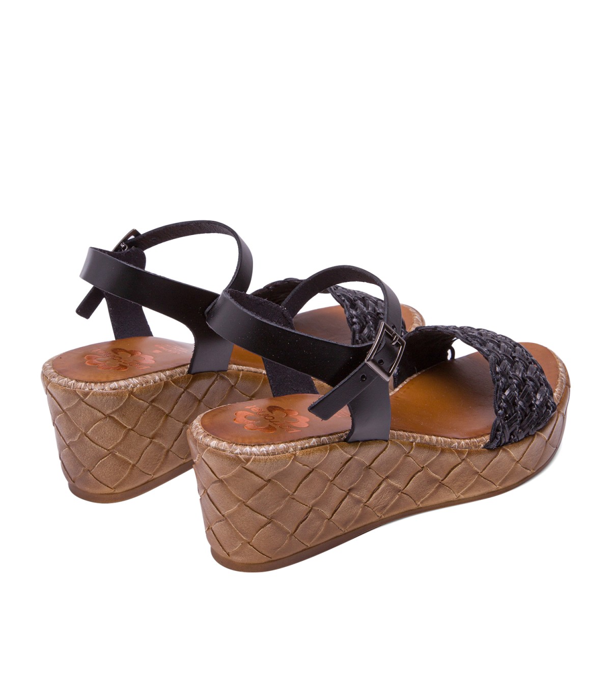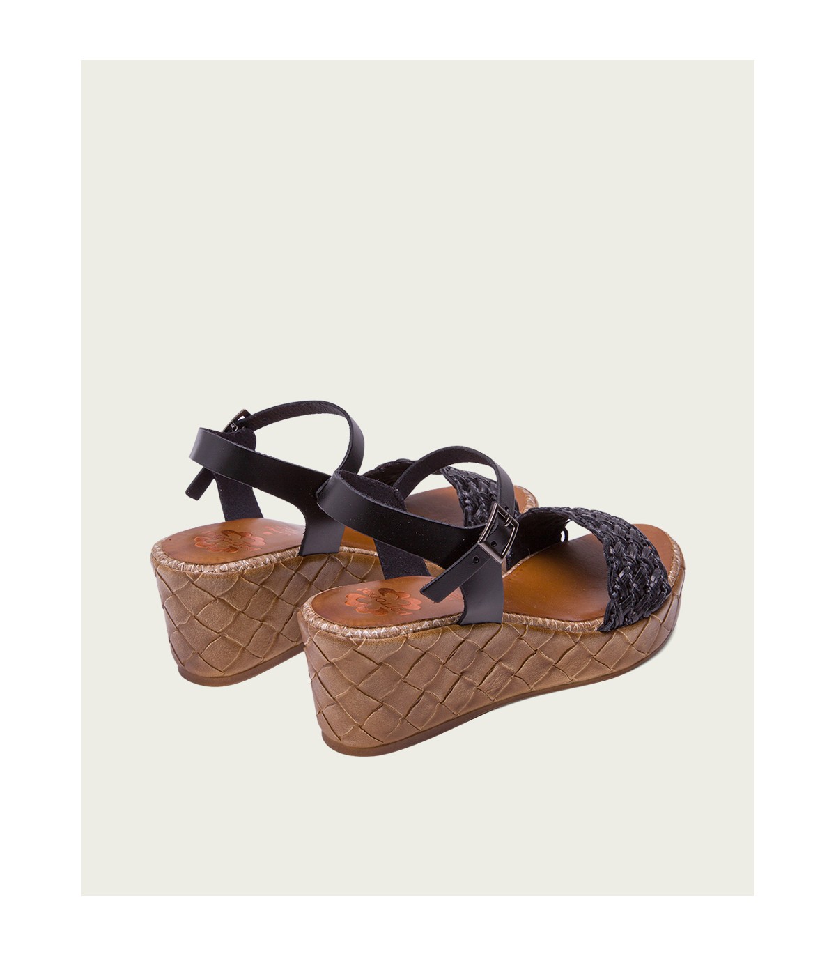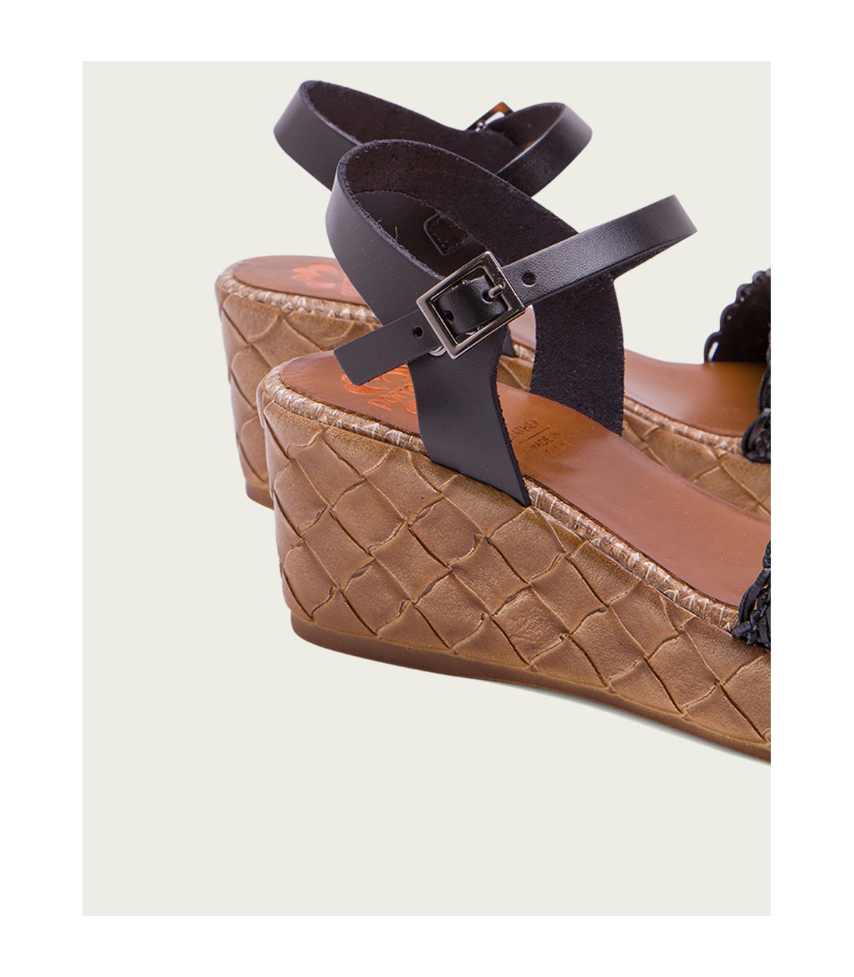 Sandalia de cuña con pala trenzada textil y forro microfibra transpirable. Cierre mediante pulsera de piel en el tobillo ajustable con hebilla metálica. Plantilla acolchada de piel que garantiza una gran comodidad. Cuña de 6,5cm de alto y 2,5 cm de plataforma con acabado trenzado. Fabricado artesanalmente en España.