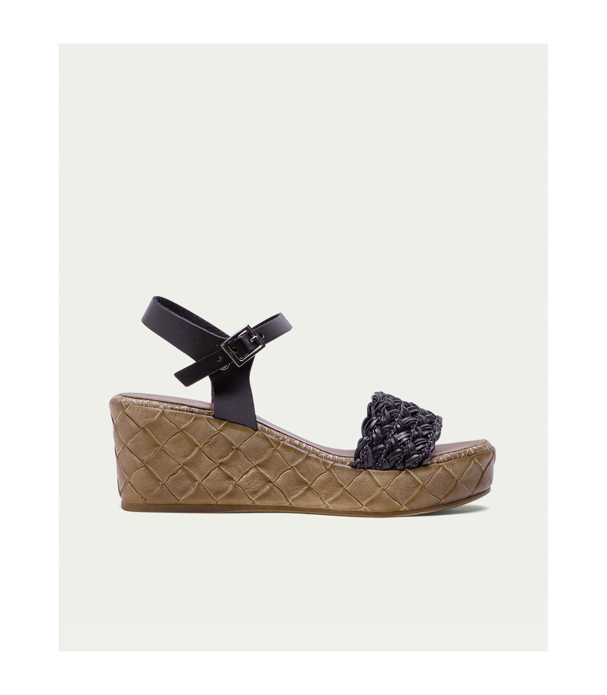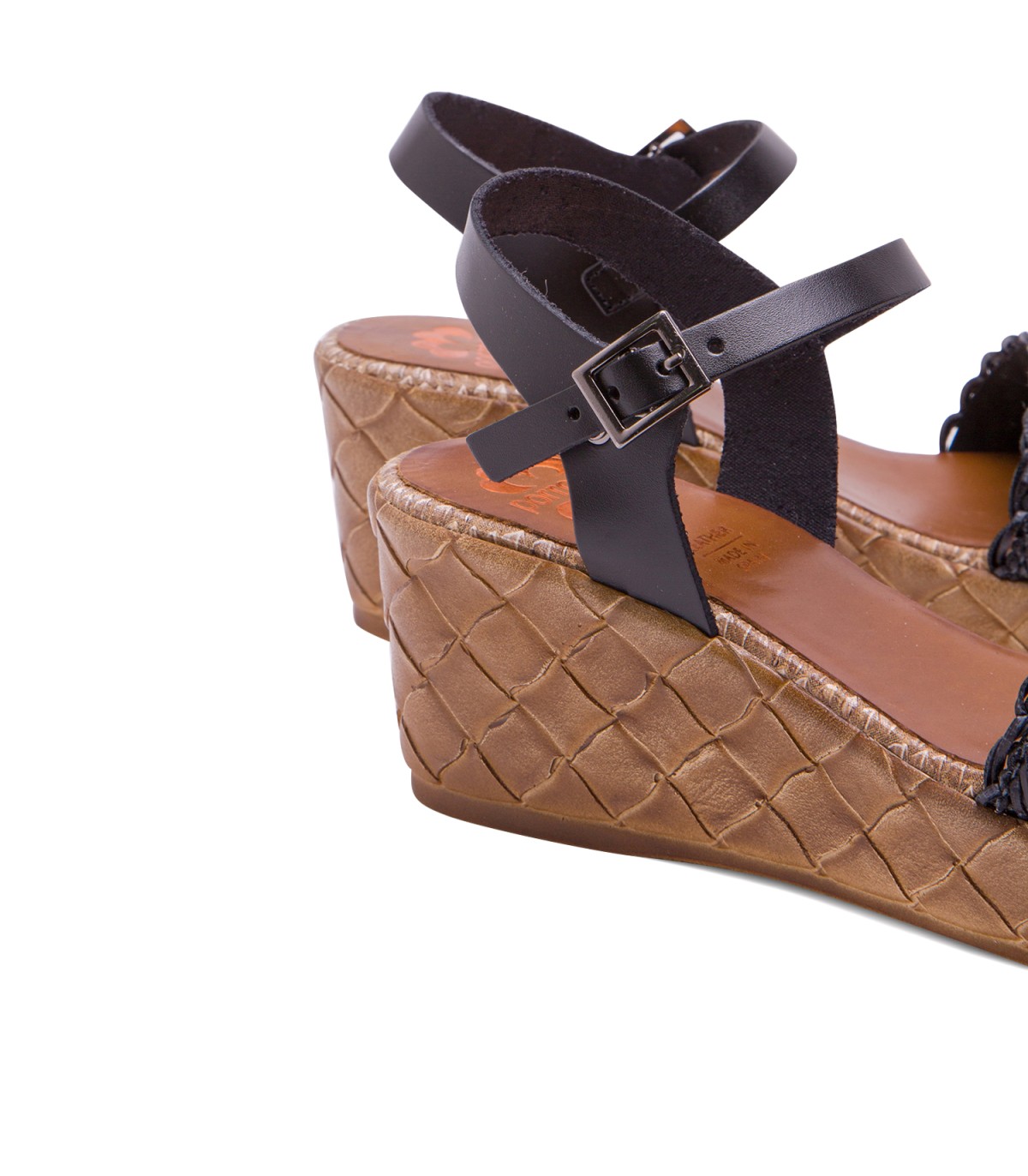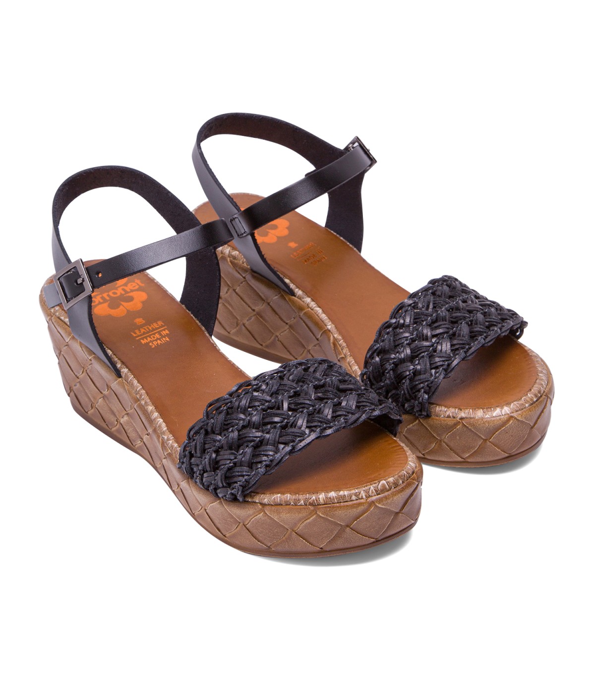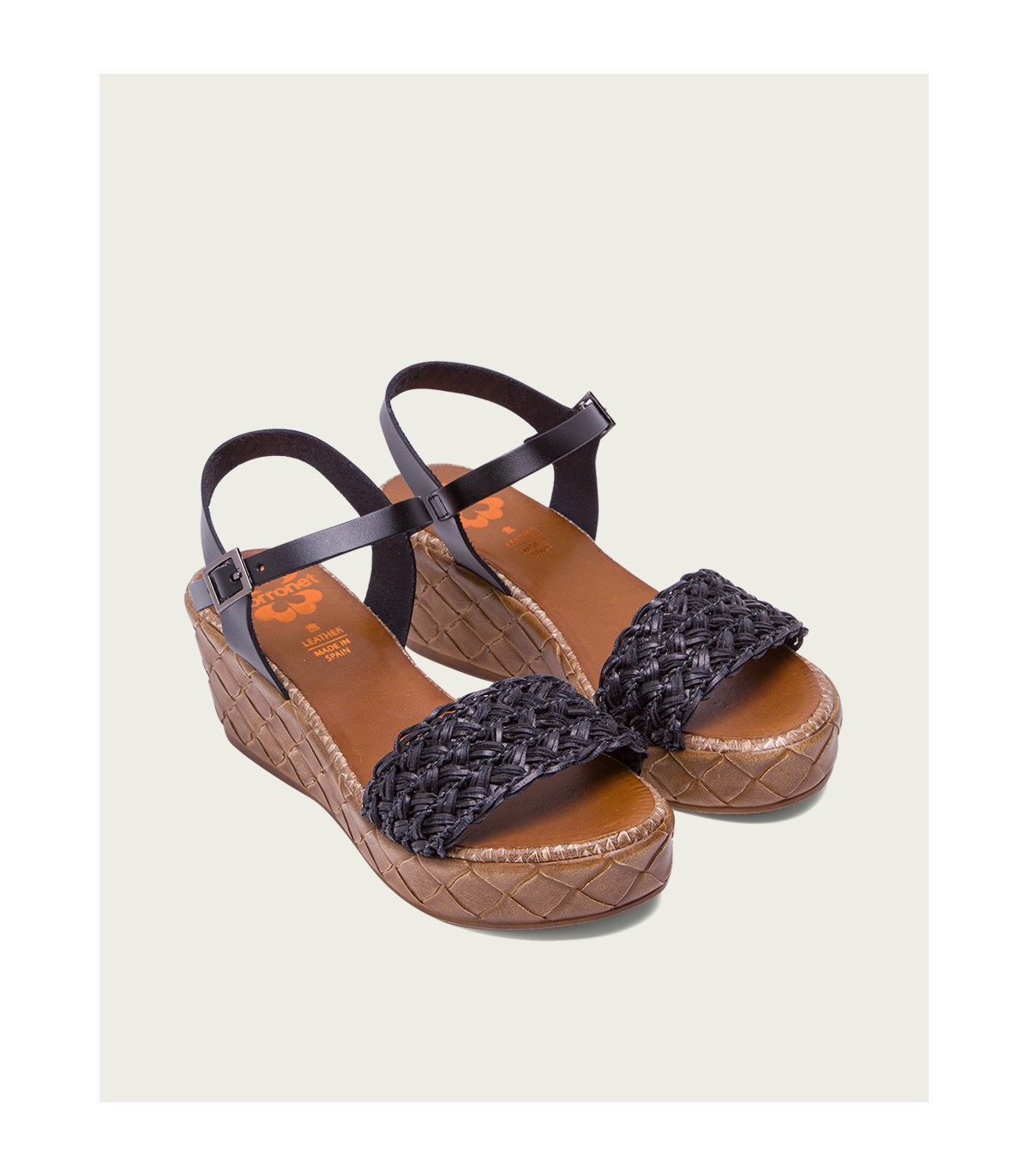 Sandalia de cuña con pala trenzada textil y forro microfibra transpirable. Cierre mediante pulsera de piel en el tobillo ajustable con hebilla metálica. Plantilla acolchada de piel que garantiza una gran comodidad. Cuña de 6,5cm de alto y 2,5 cm de plataforma con acabado trenzado. Fabricado artesanalmente en España.