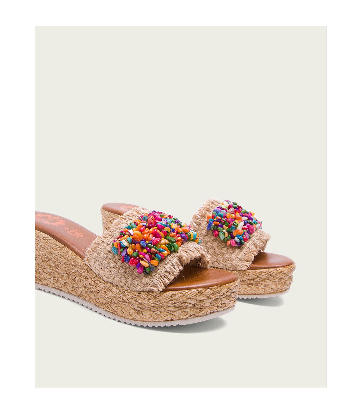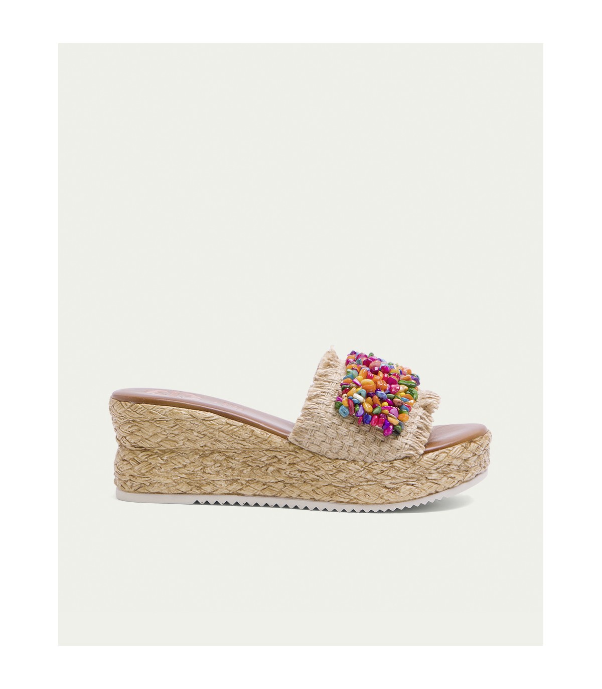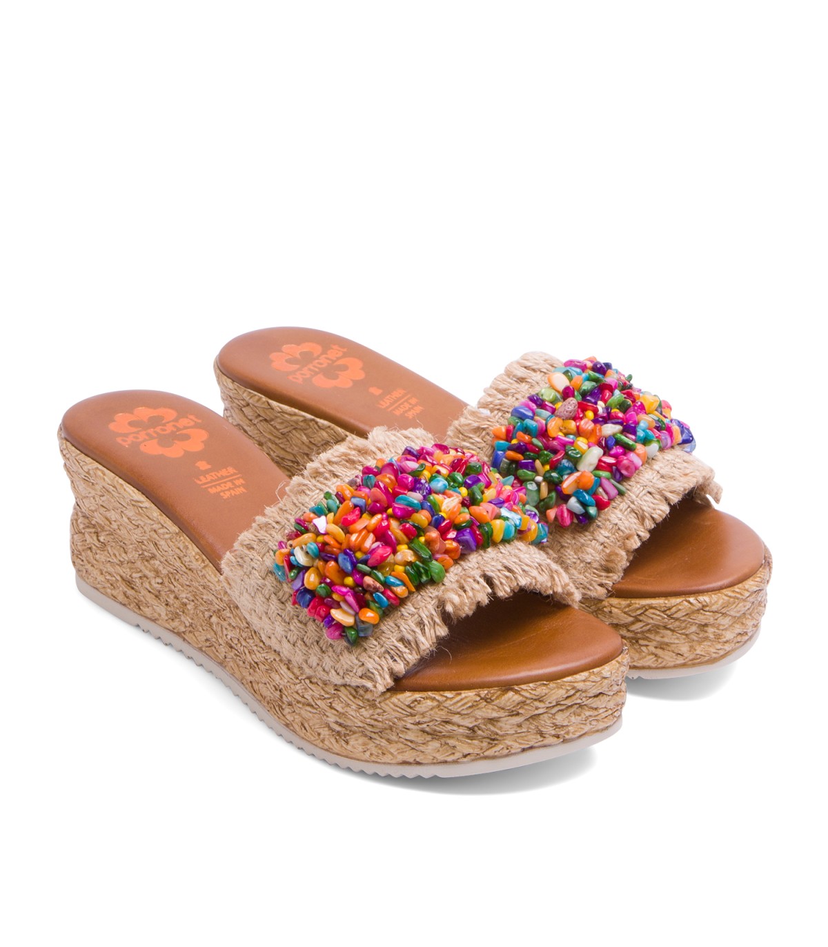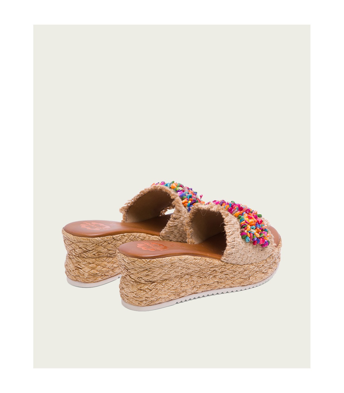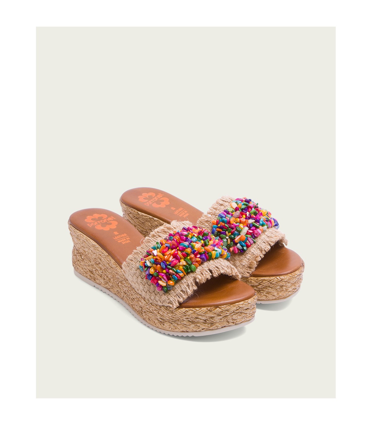 Sandalia cuña con pala de yute con original aplique de abalorios multicolor. Plantilla acolchada de piel que garantiza una gran comodidad. Cuña de 6,5cm de alto y 3cm de plataforma con acabado trenzado. Fabricado artesanalmente en España.