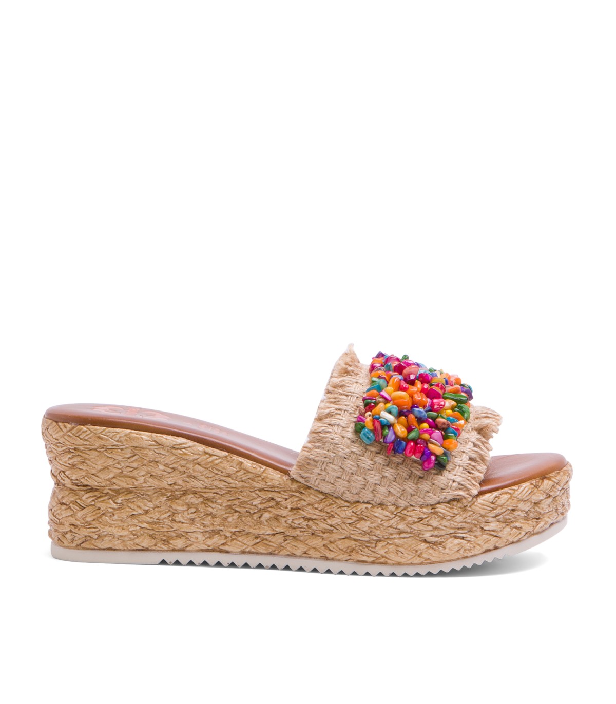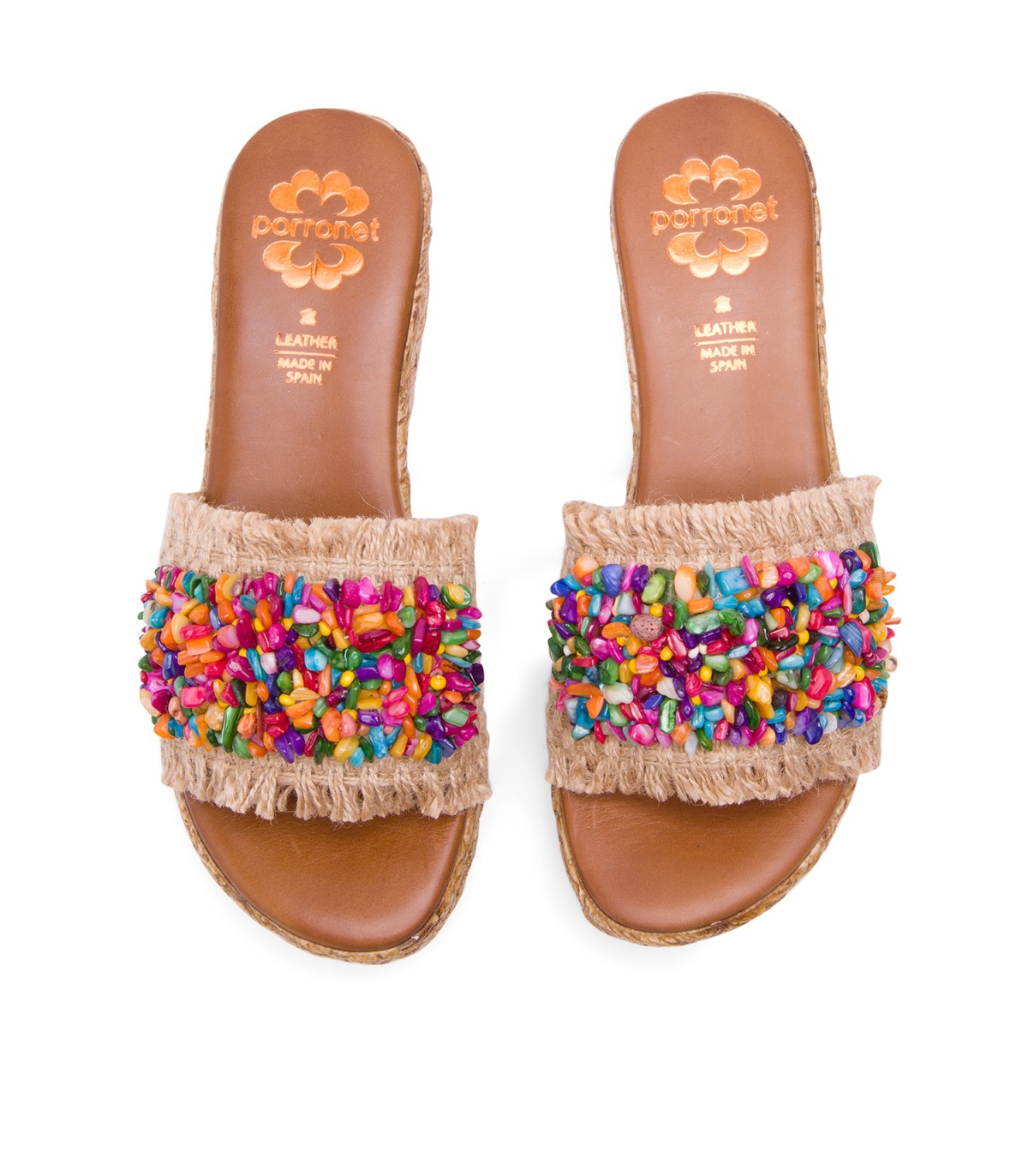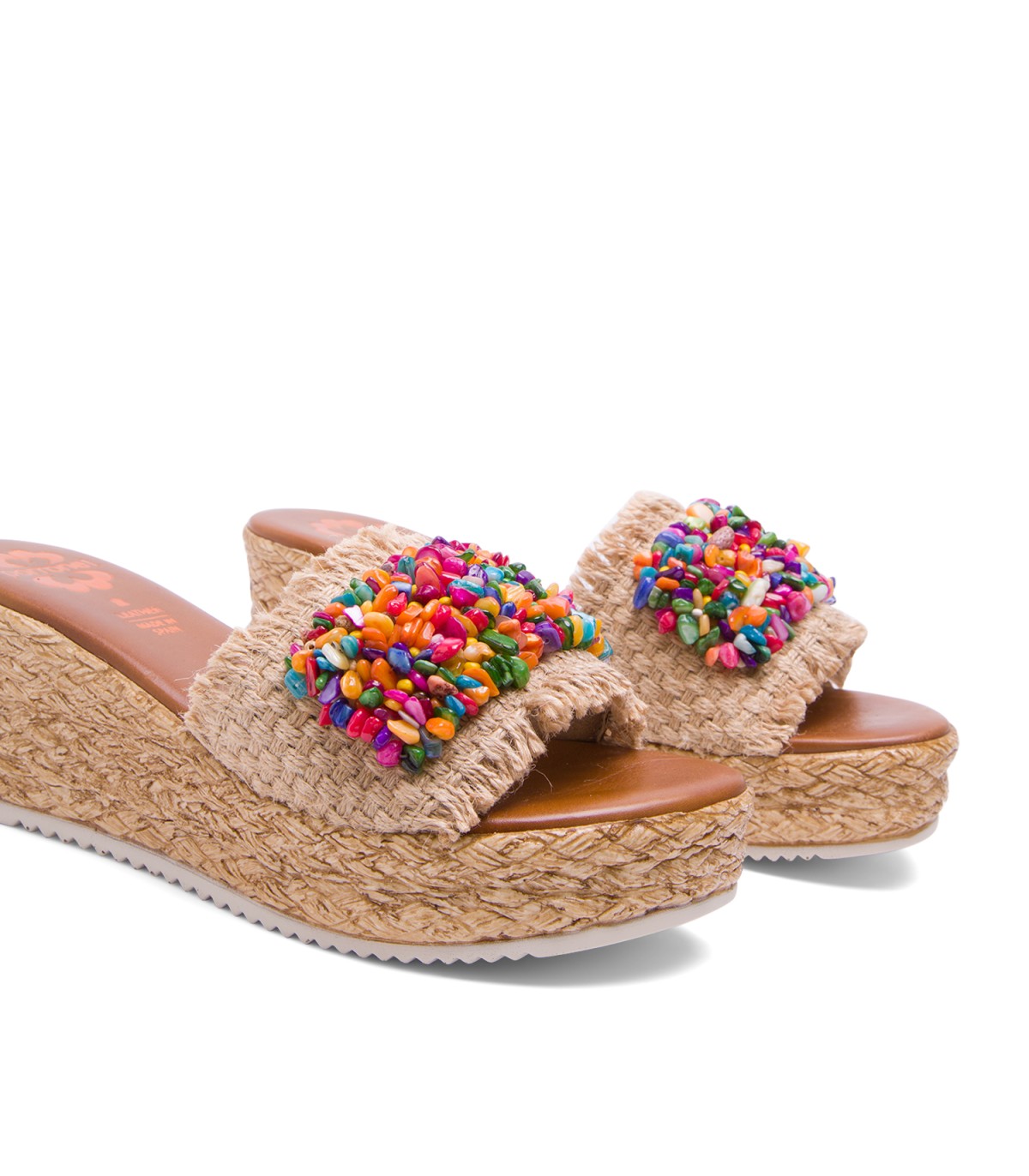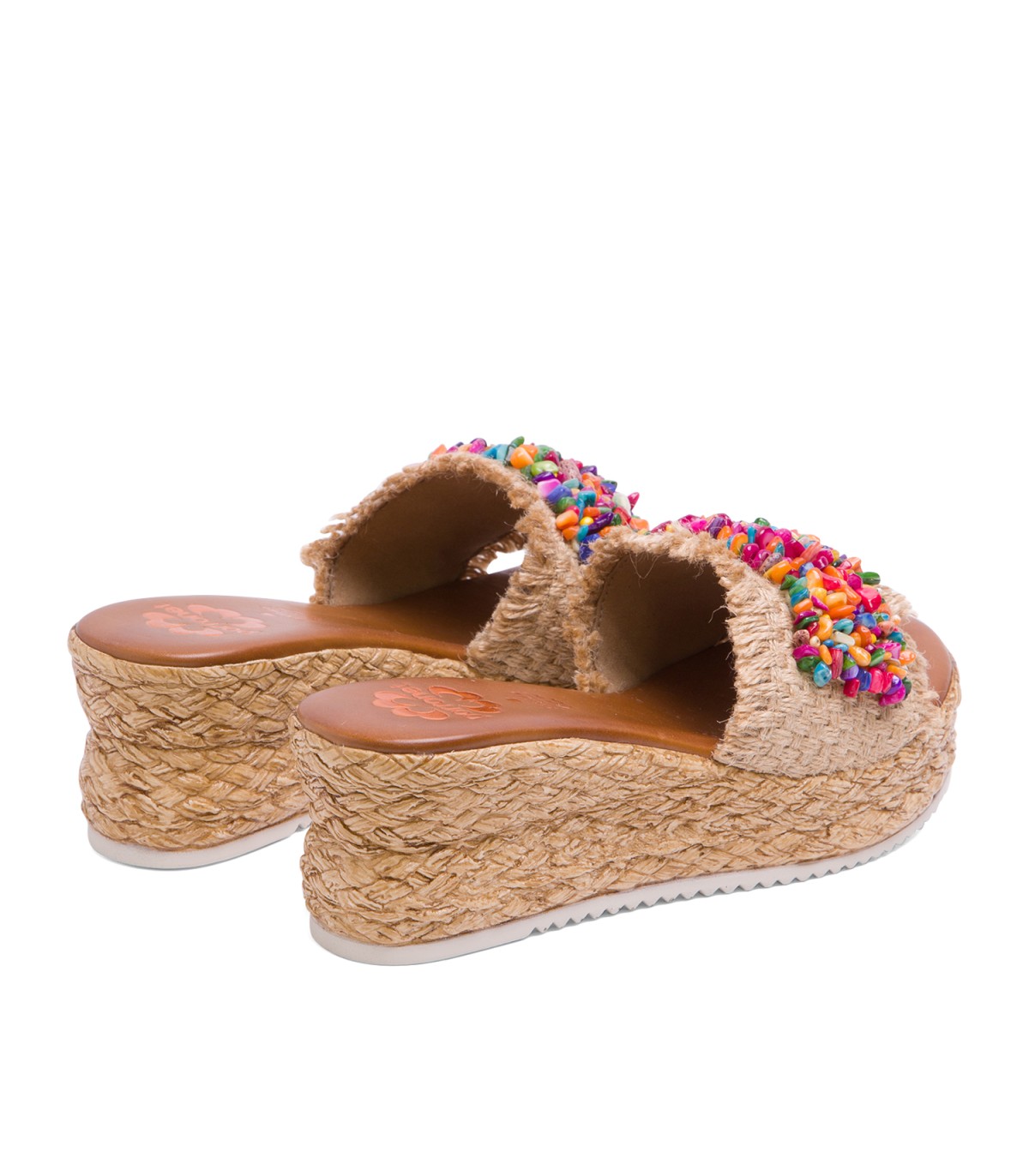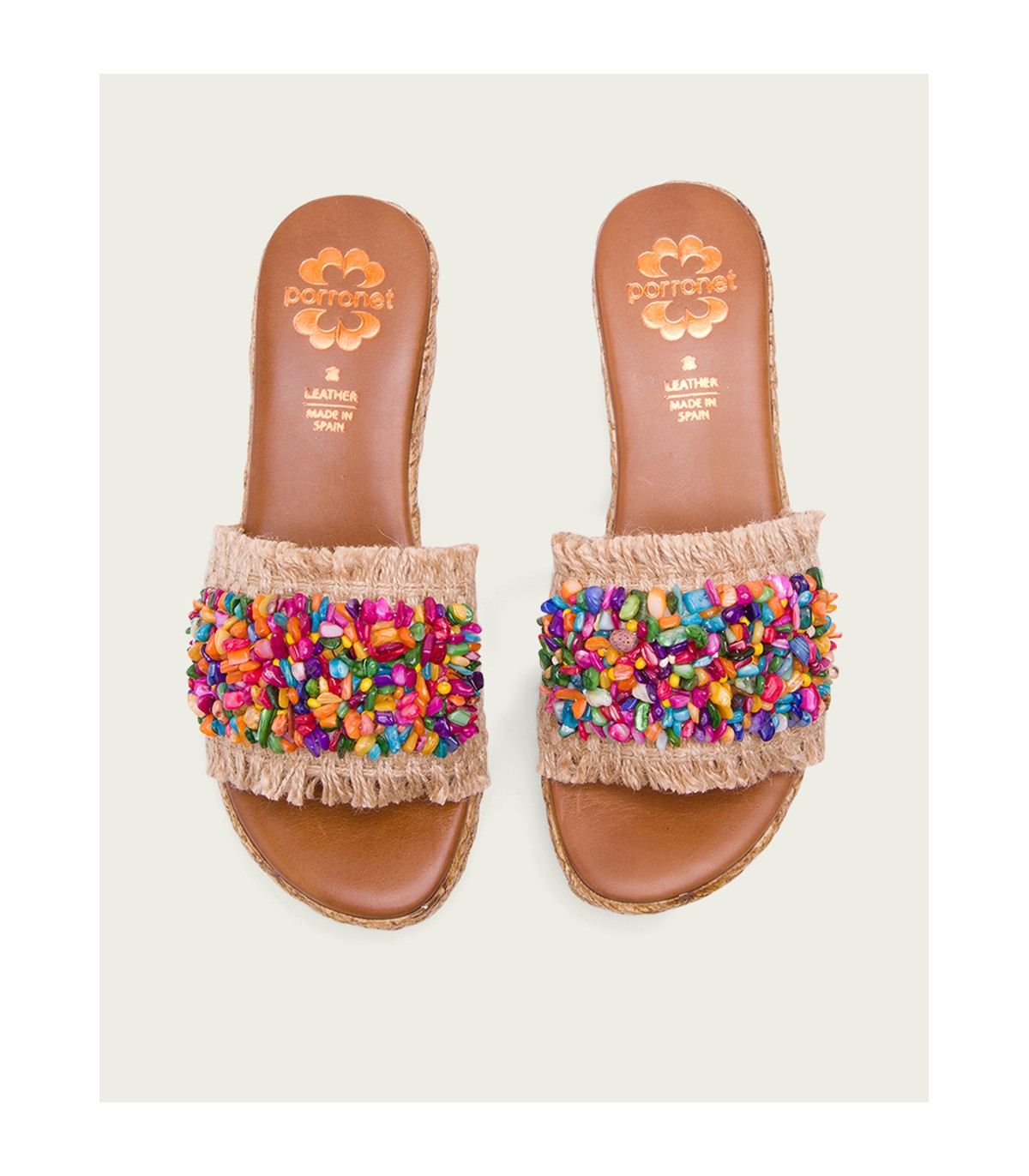 Sandalia cuña con pala de yute con original aplique de abalorios multicolor. Plantilla acolchada de piel que garantiza una gran comodidad. Cuña de 6,5cm de alto y 3cm de plataforma con acabado trenzado. Fabricado artesanalmente en España.