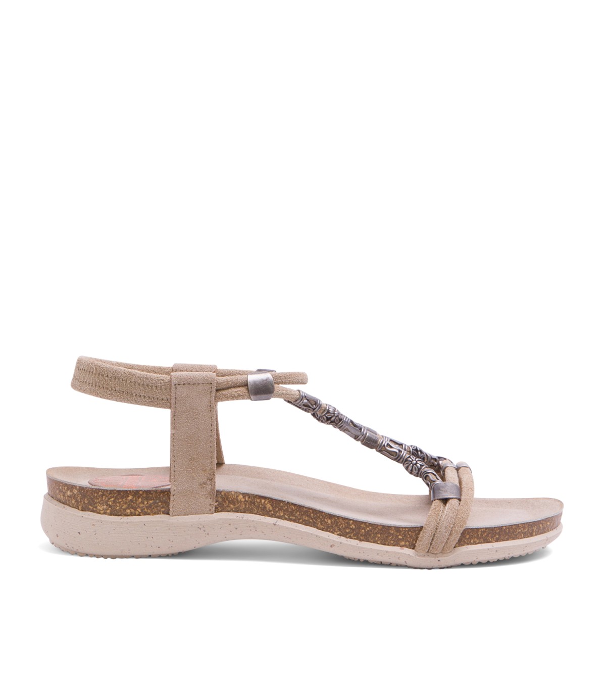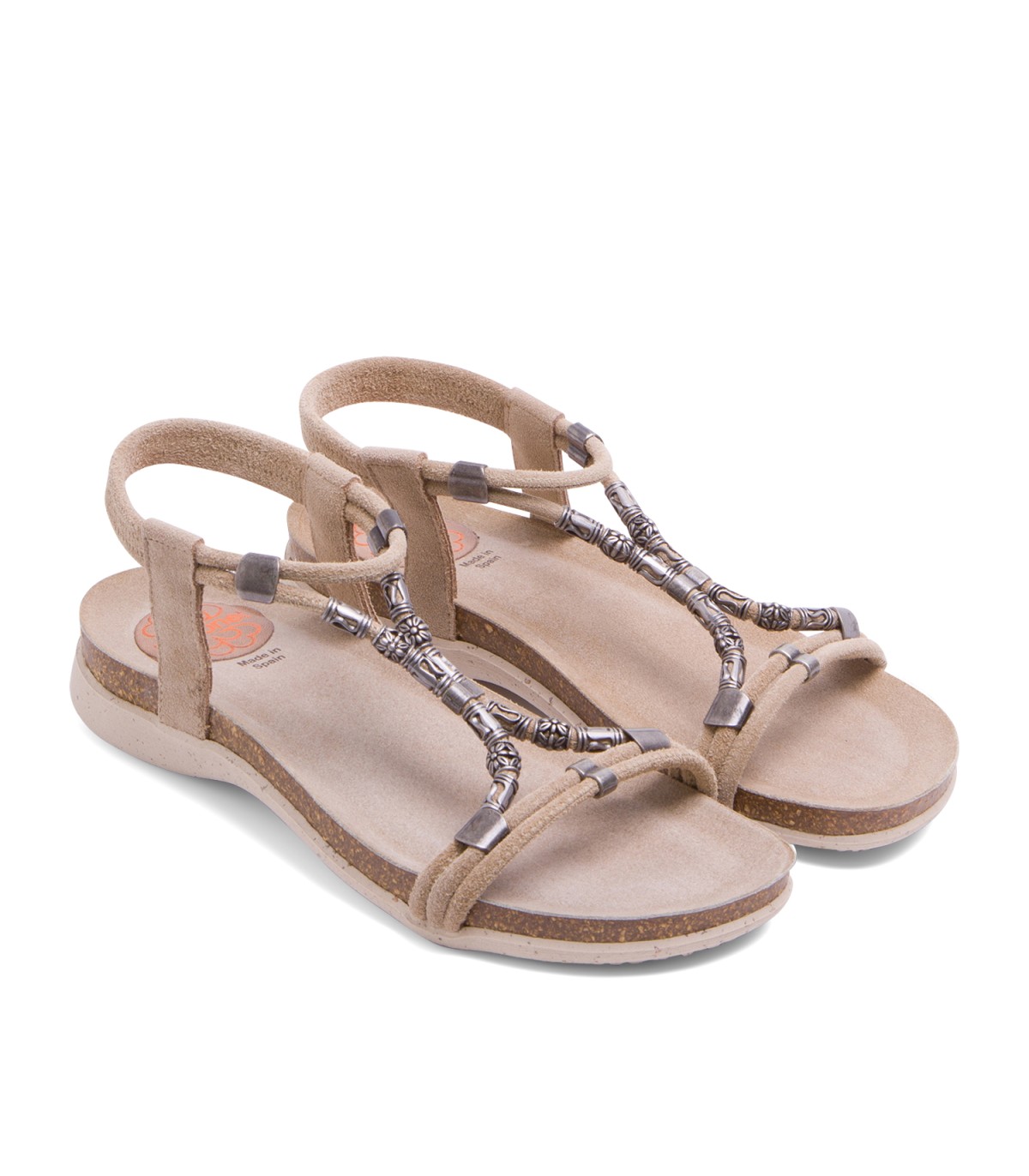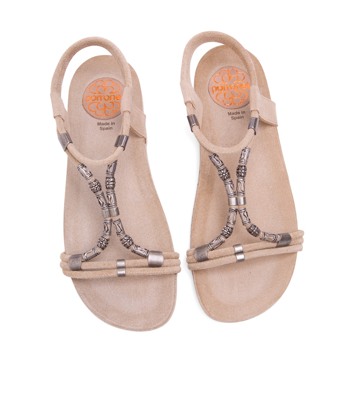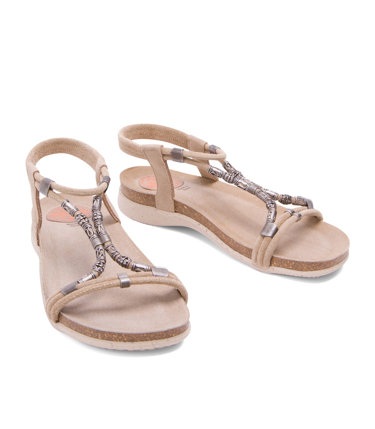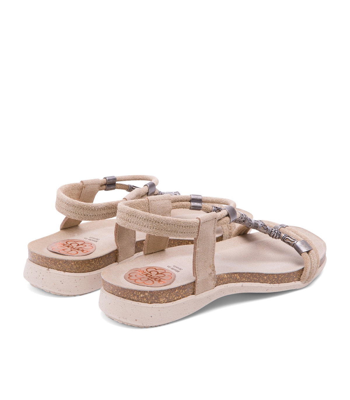 Sandalia tipo bio que combina tiras de serraje con adorno de abalorios estilo étnico en el empeine con tira elástica en el tobillo para facilitar el calce. Plantilla acolchada en serraje que garantiza una gran comodidad. Cuña de 3,5 cm de alto y 1,5 cm de plataforma. Piso elaborado con tecnologías y parte de materiales reciclados y 100% reciclables, que ayudan a reducir el impacto medioambiental. Fabricado artesanalmente en España.