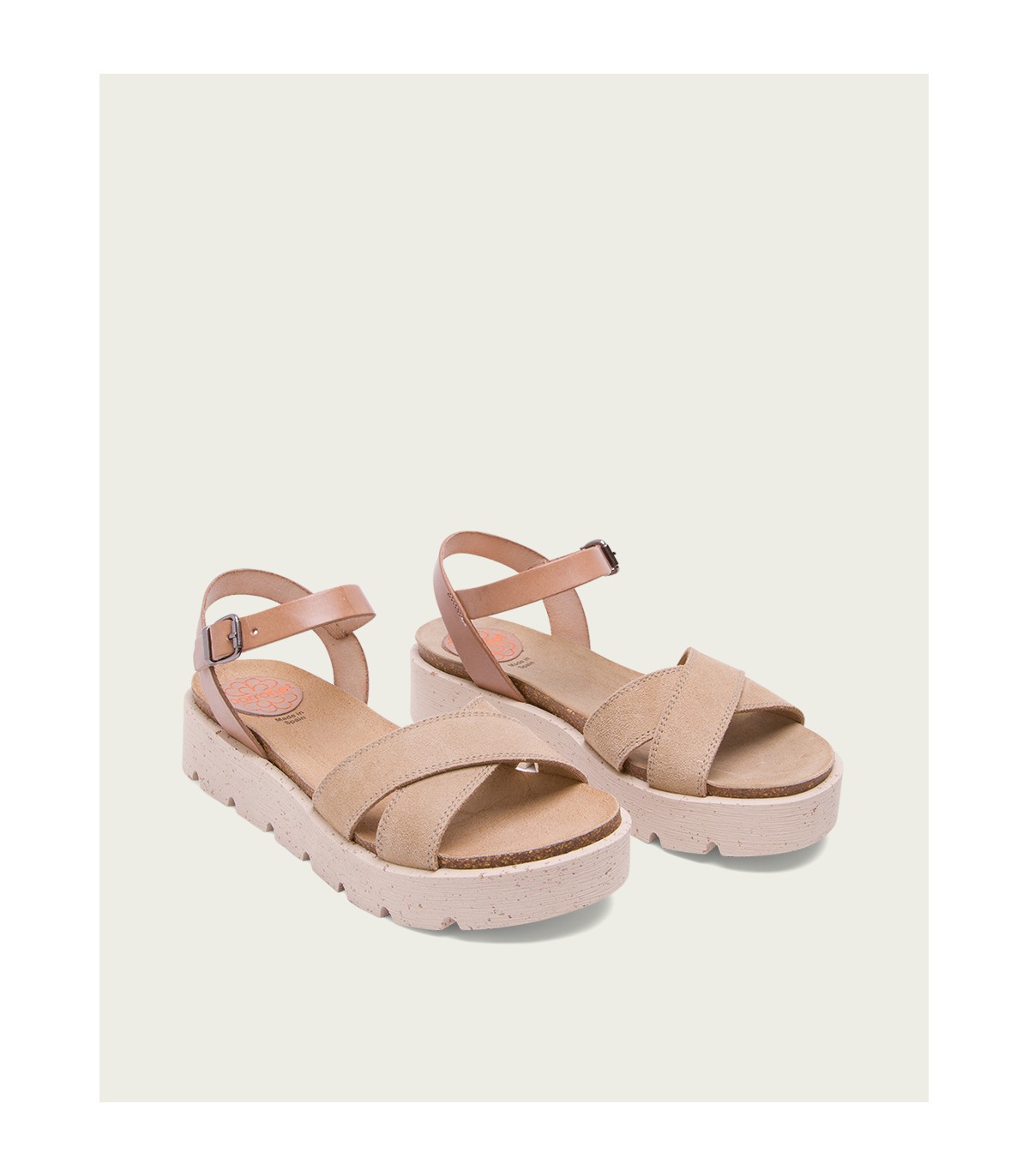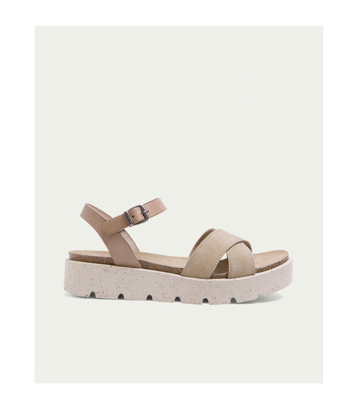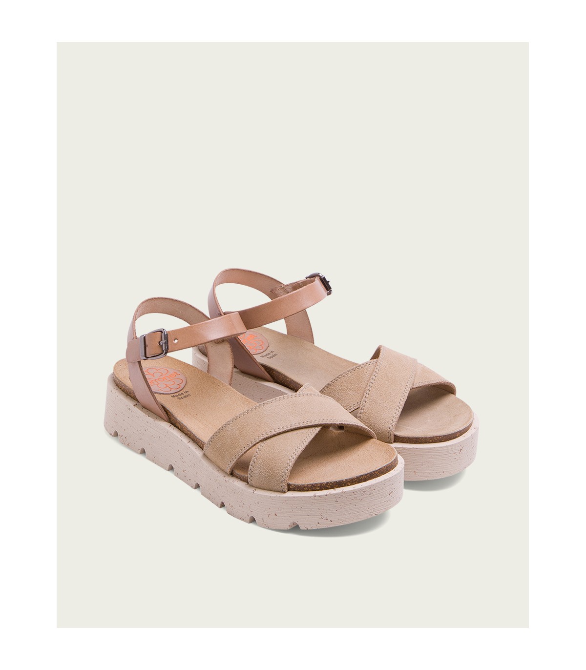 Sandalia con pala cruzada de serraje y cierre mediante pulsera de piel en el tobillo ajustable con hebilla metálica. Planta bio de serraje y cuña de 4,5cm de alto y 3cm de plataforma. Piso elaborado con tecnologías y parte de materiales reciclados y 100% reciclables, que ayudan a reducir el impacto medioambiental. Fabricado artesanalmente en España.