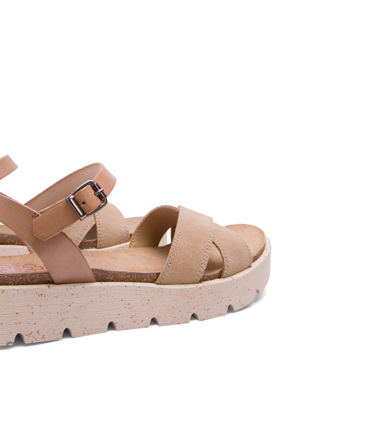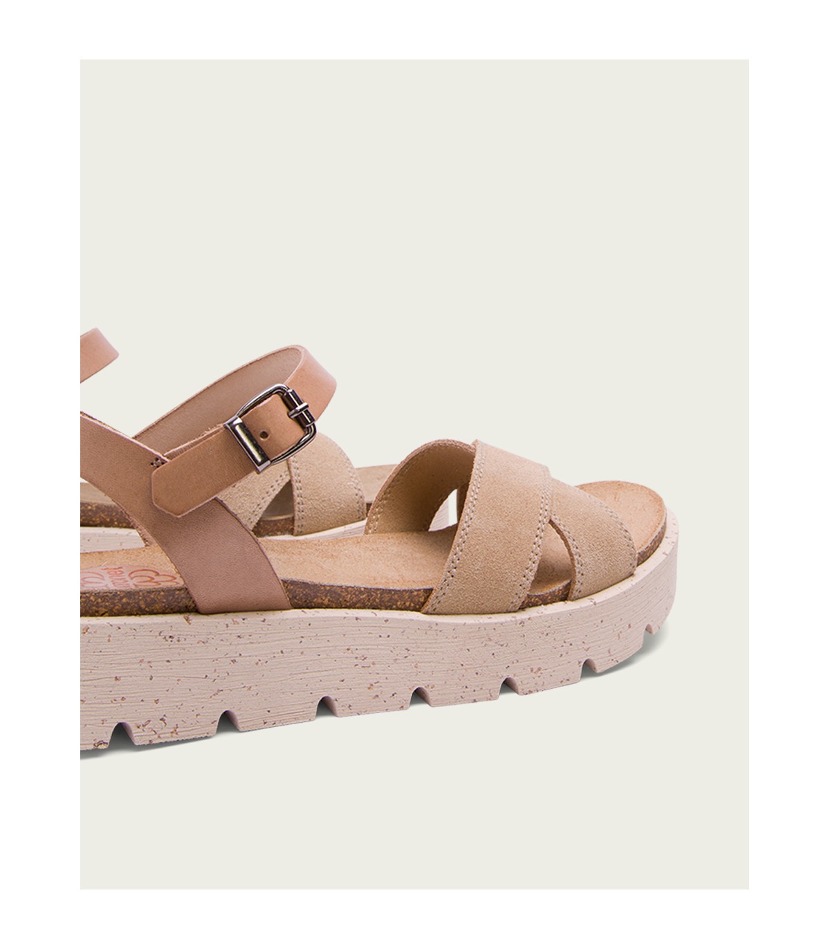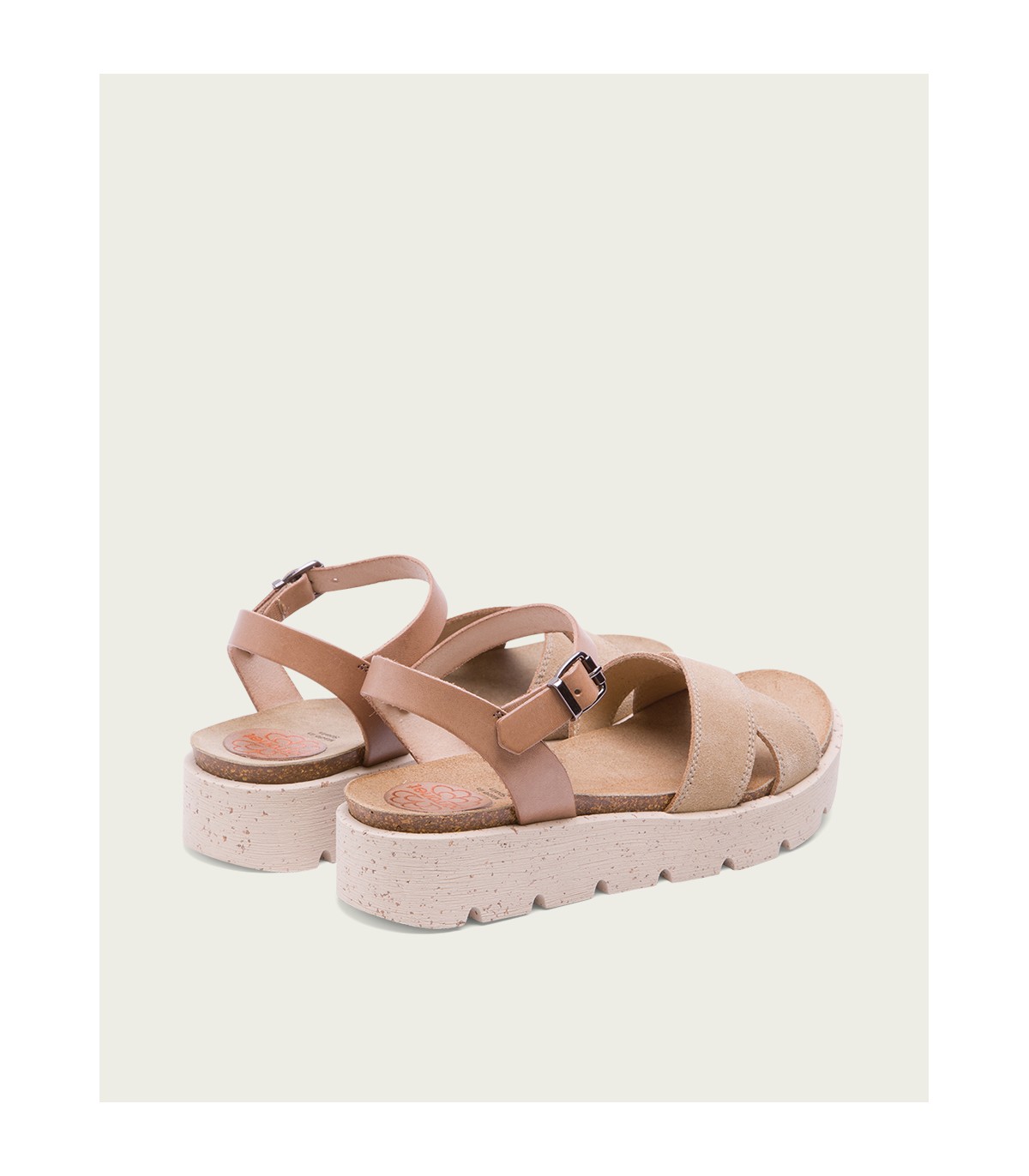 Sandalia con pala cruzada de serraje y cierre mediante pulsera de piel en el tobillo ajustable con hebilla metálica. Planta bio de serraje y cuña de 4,5cm de alto y 3cm de plataforma. Piso elaborado con tecnologías y parte de materiales reciclados y 100% reciclables, que ayudan a reducir el impacto medioambiental. Fabricado artesanalmente en España.