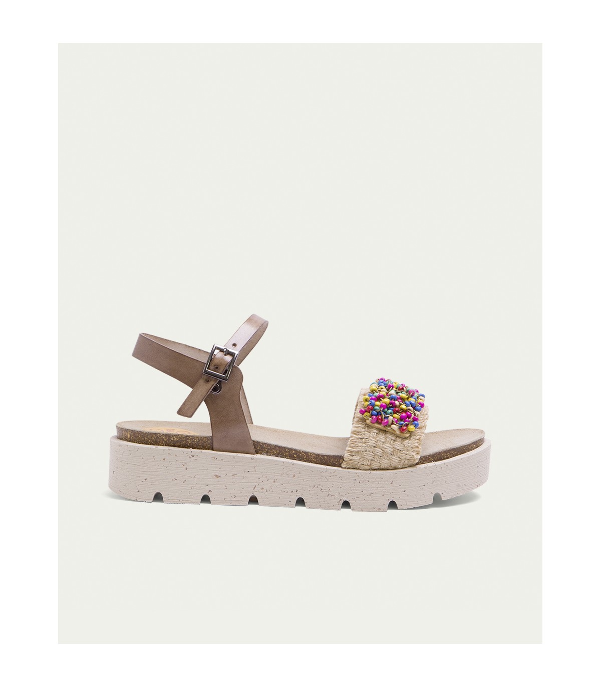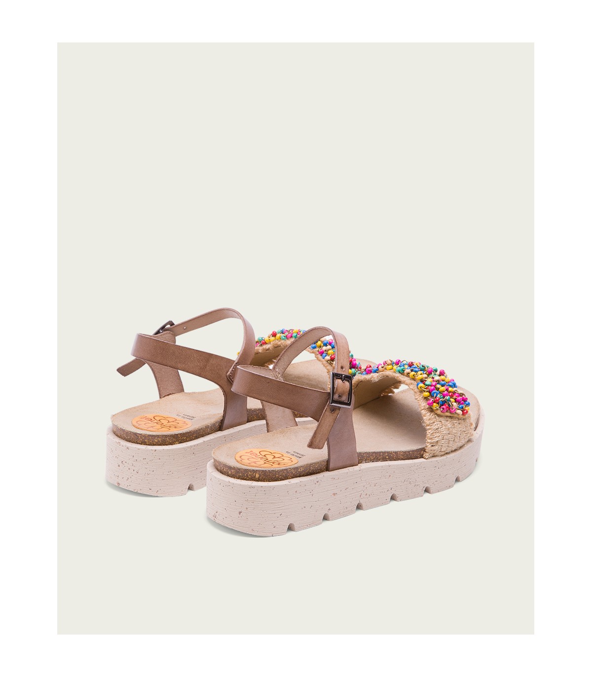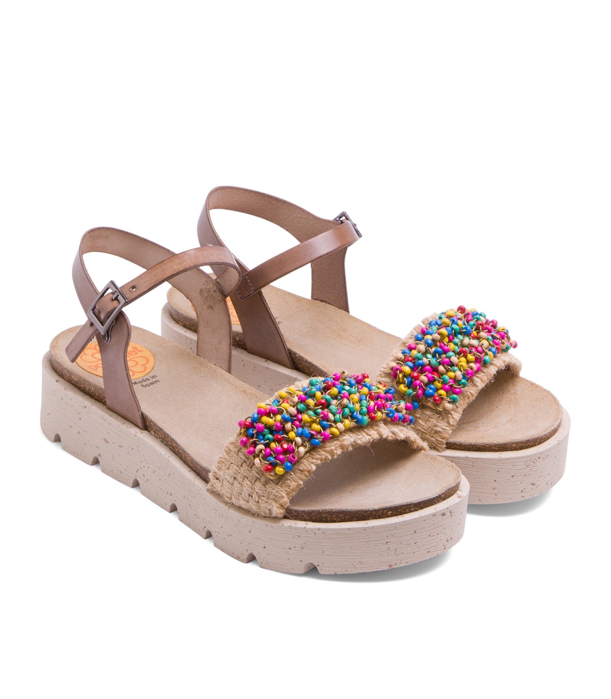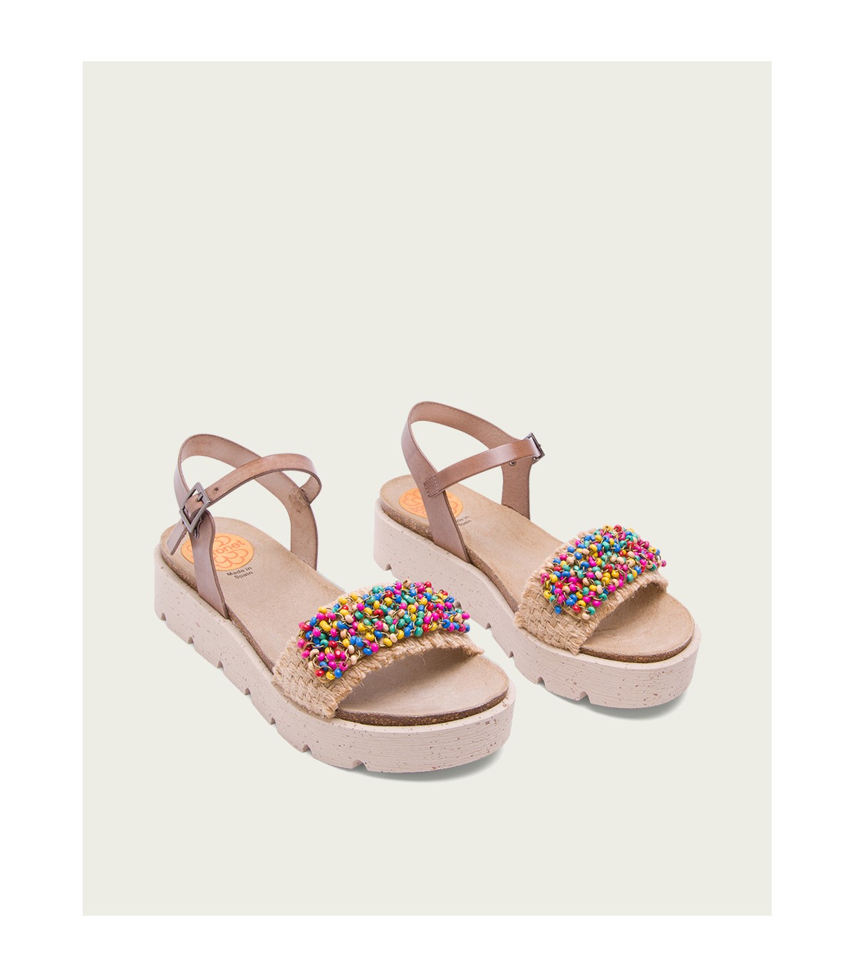Sandalia con pala de yute y original aplique con abalorios. Cierre mediante pulsera de piel en el tobillo ajustable con hebilla metálica. Planta bio de serraje y cuña de 4,5cm de alto y 3cm de plataforma. Piso elaborado con tecnologías y parte de materiales reciclados y 100% reciclables, que ayudan a reducir el impacto medioambiental. Fabricado artesanalmente en España.