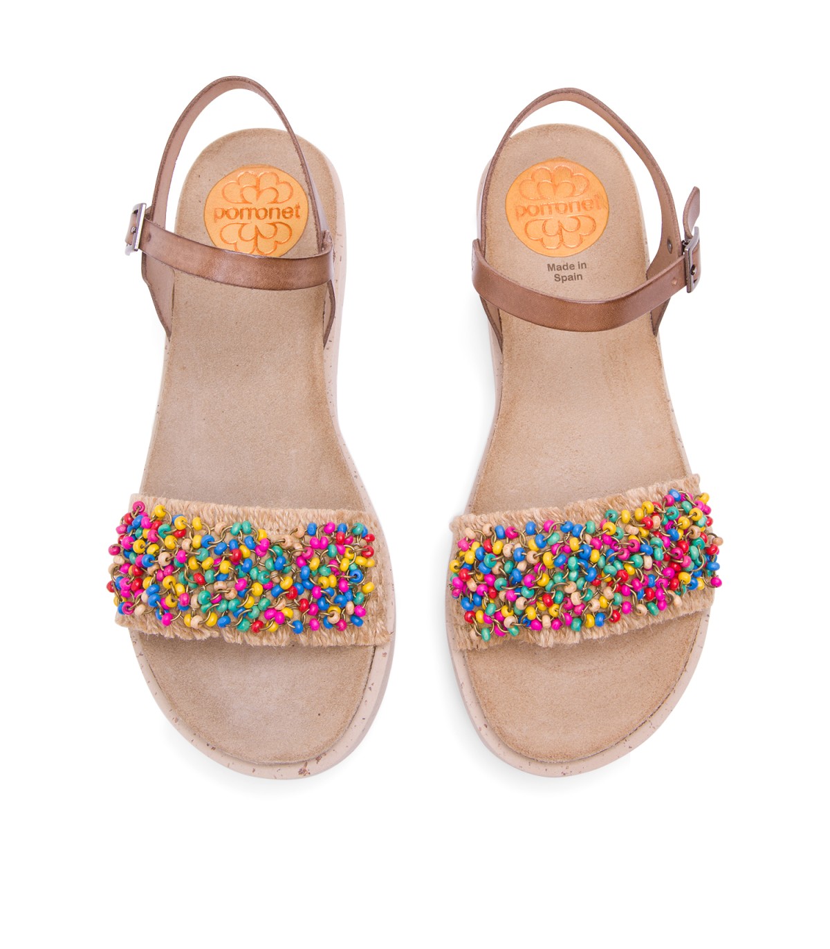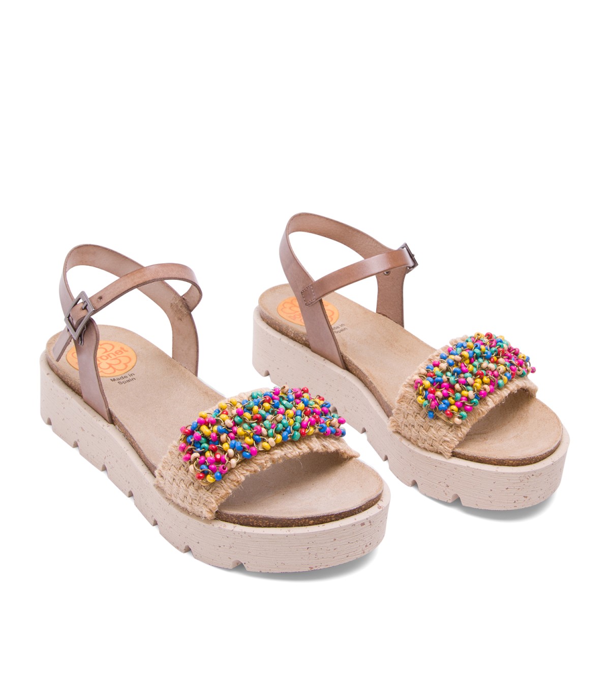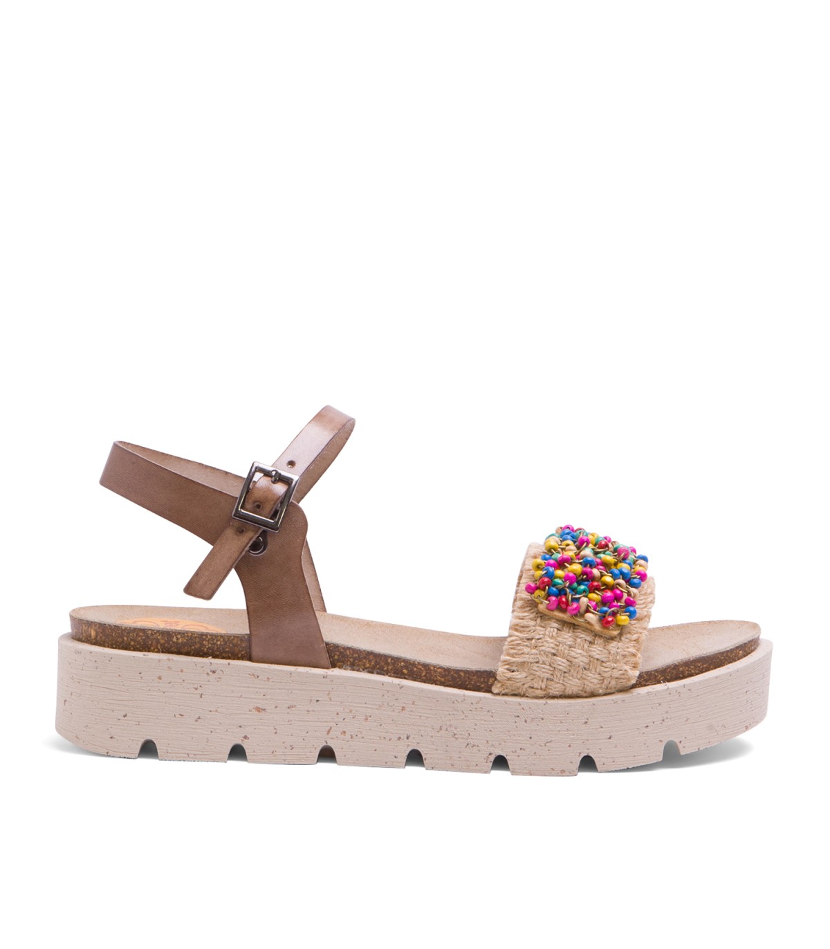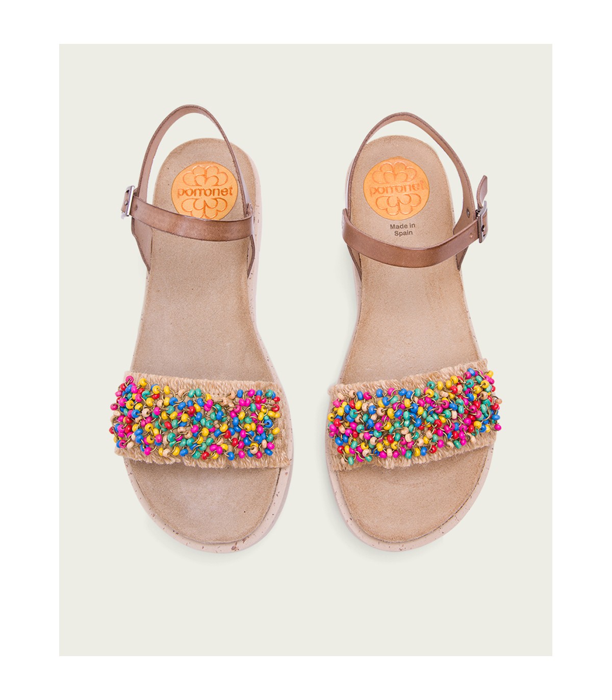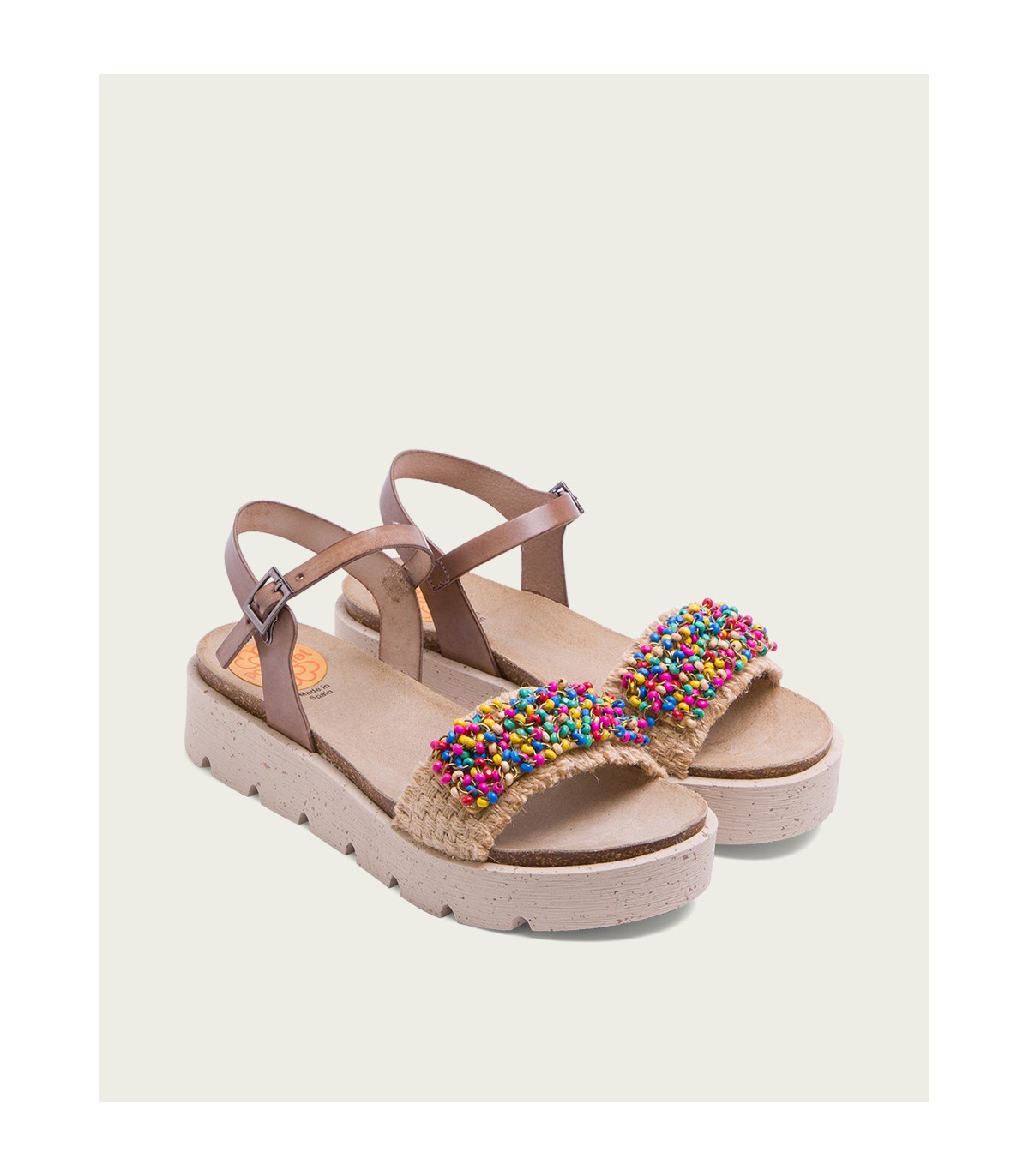 Sandalia con pala de yute y original aplique con abalorios. Cierre mediante pulsera de piel en el tobillo ajustable con hebilla metálica. Planta bio de serraje y cuña de 4,5cm de alto y 3cm de plataforma. Piso elaborado con tecnologías y parte de materiales reciclados y 100% reciclables, que ayudan a reducir el impacto medioambiental. Fabricado artesanalmente en España.