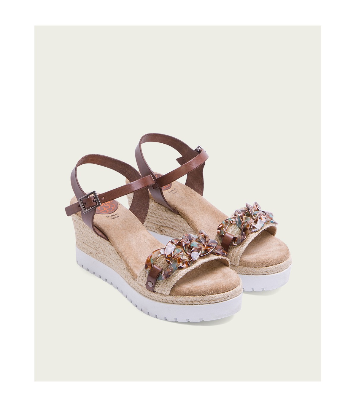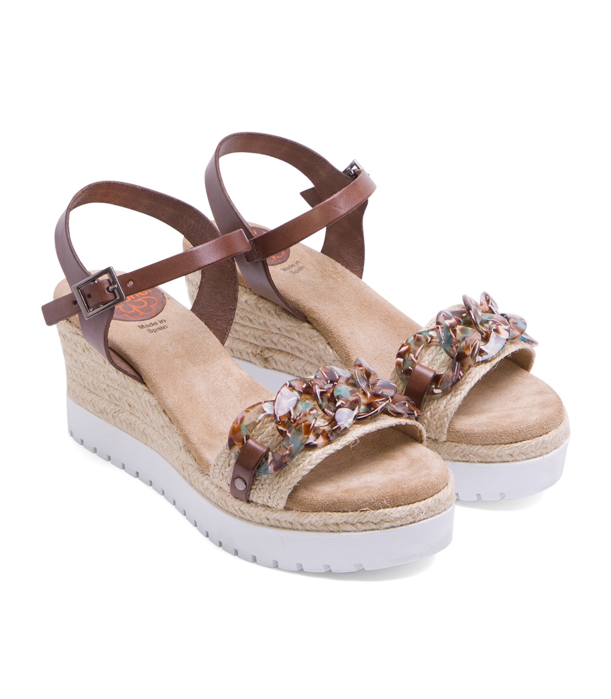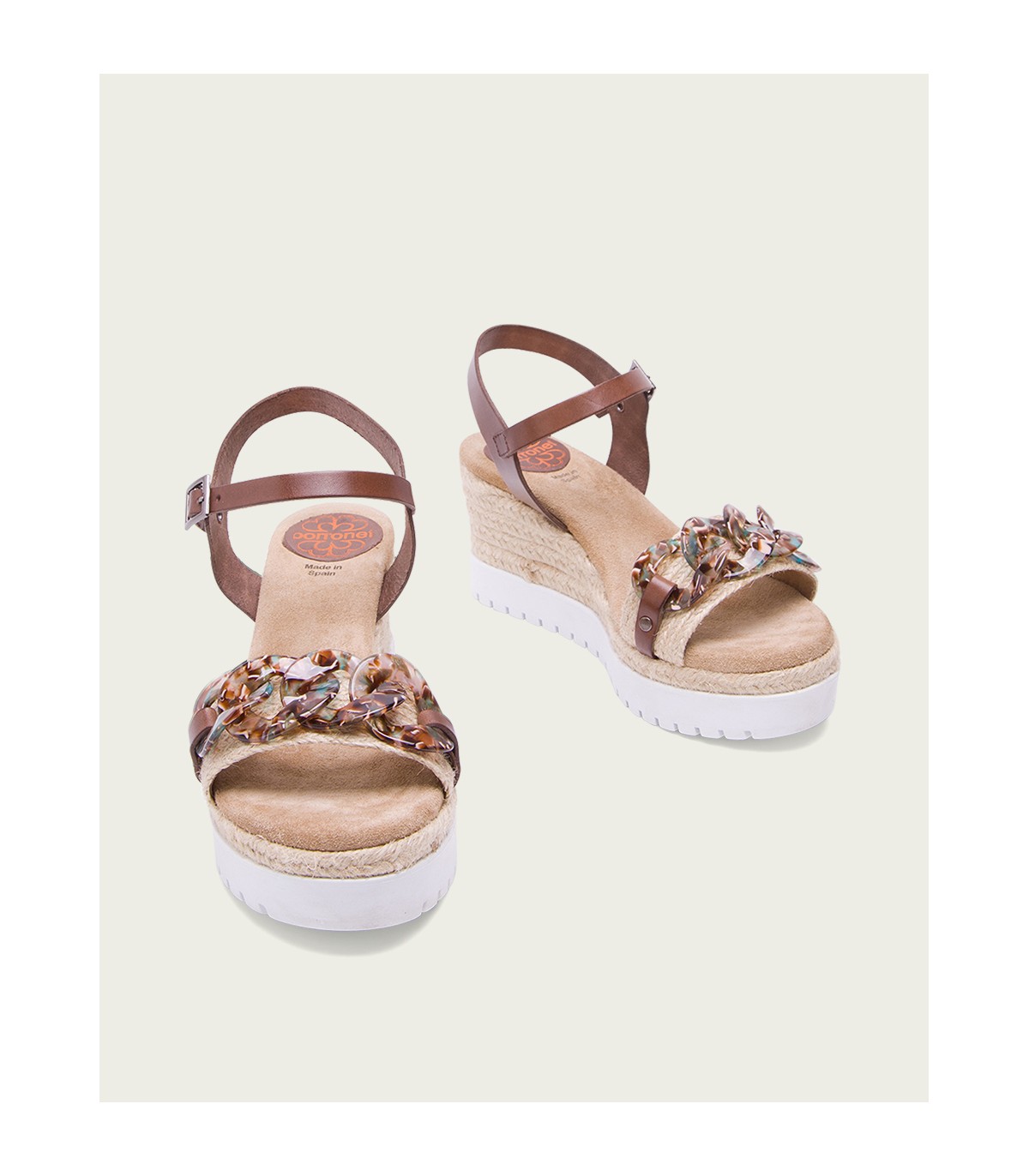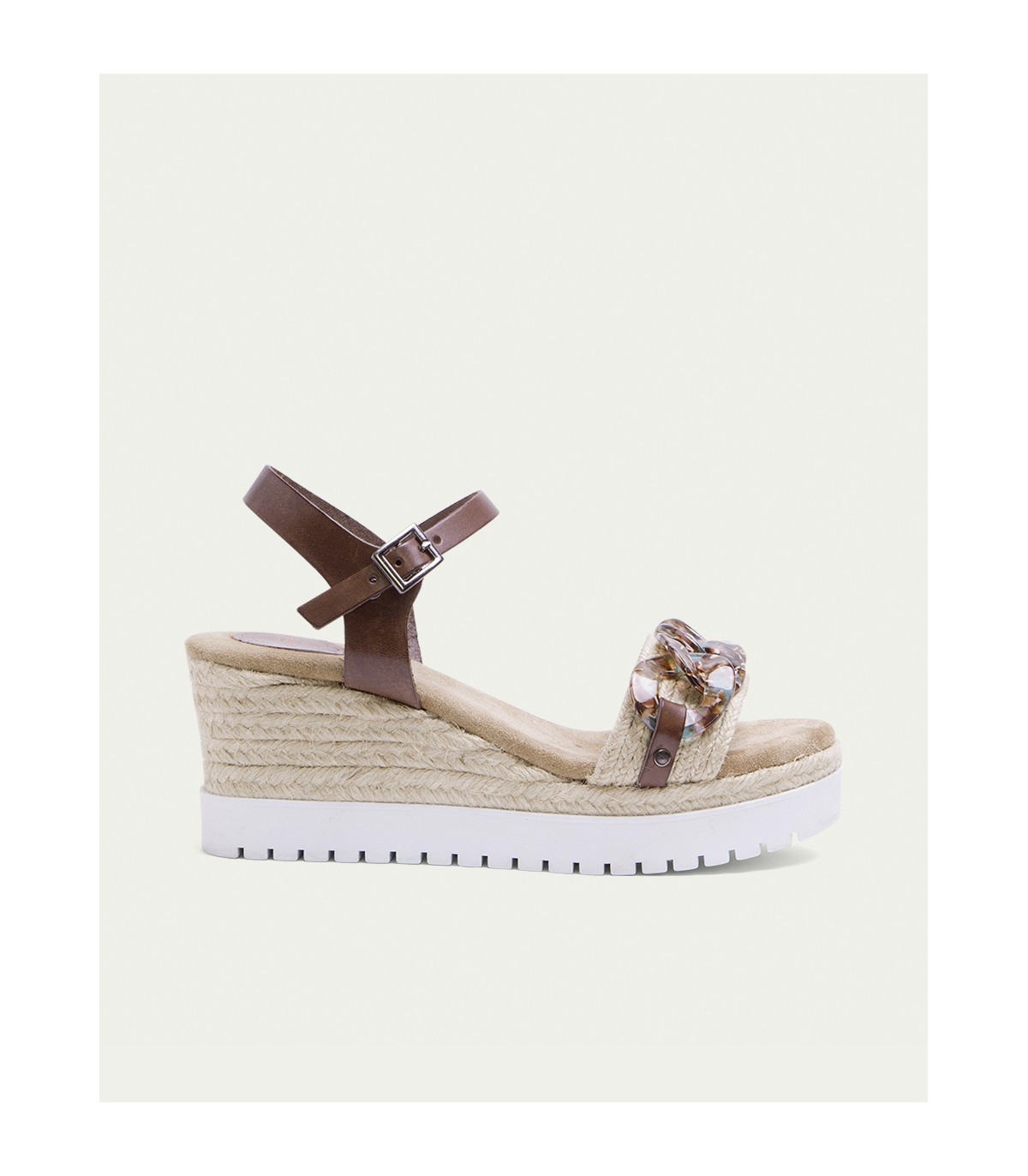 Sandalia tipo cuña de piel con pala de yute con aplique en forma de cadena. Cierre mediante pulsera de piel en el tobillo ajustable con hebilla metálica. Plantilla acolchada de serraje que garantiza una gran comodidad. Cuña de yute de 7cm de altura y plataforma delantera de 3cm con suela dentada de poliuretano. Fabricado de manera artesanal en España.