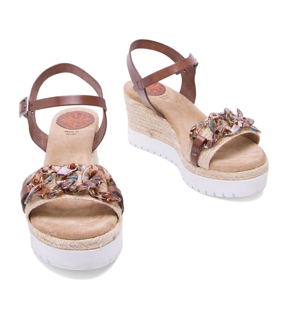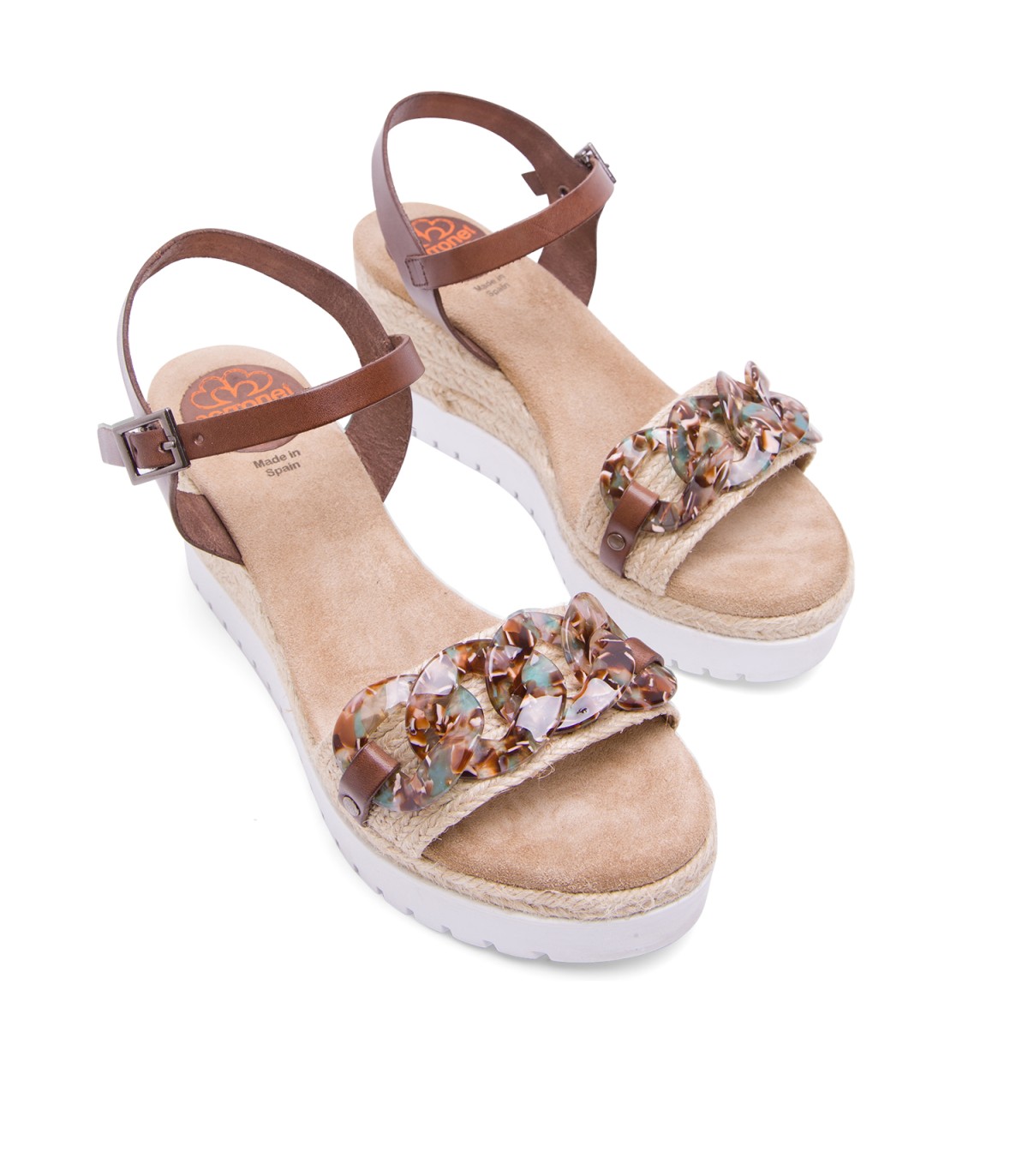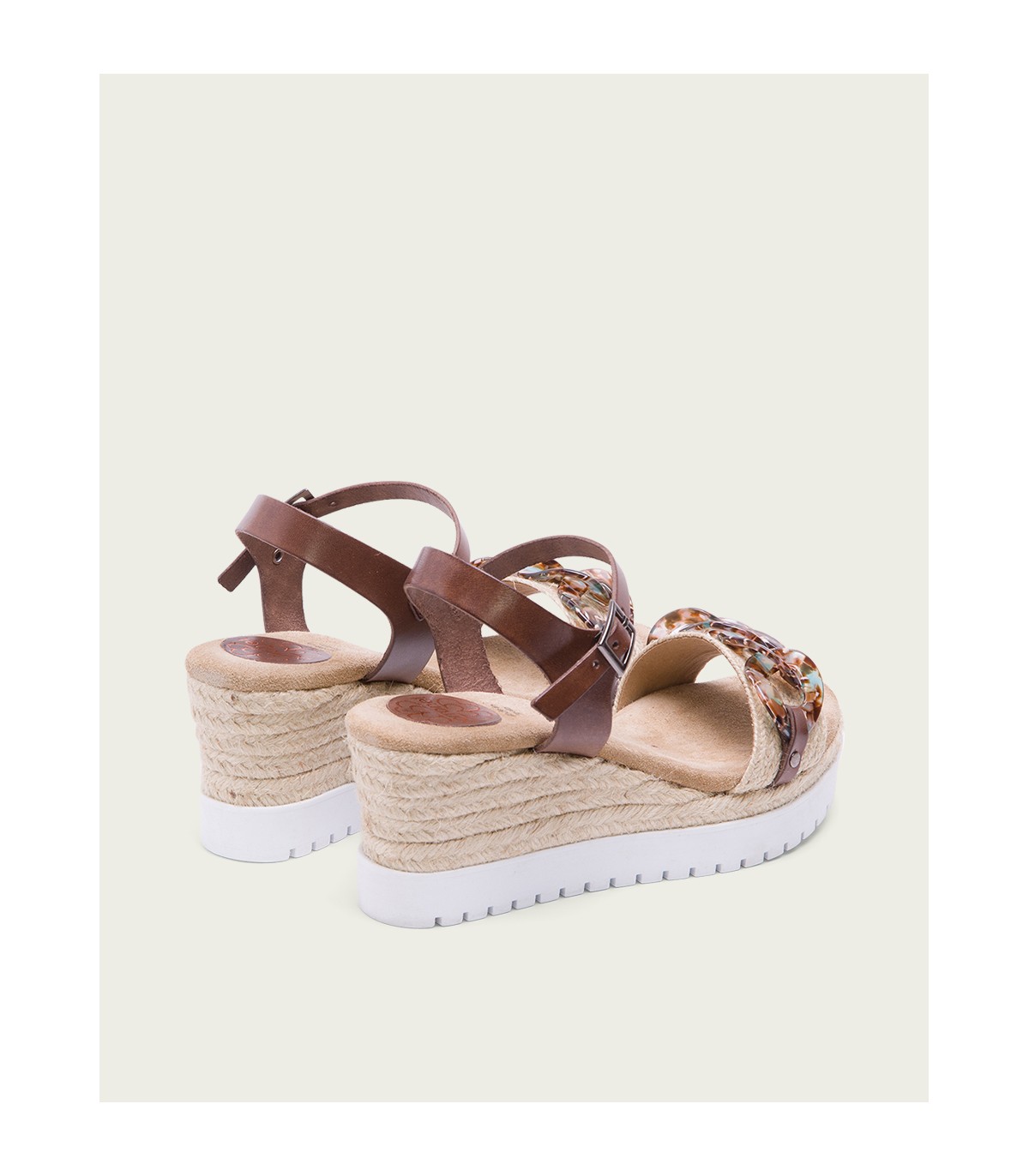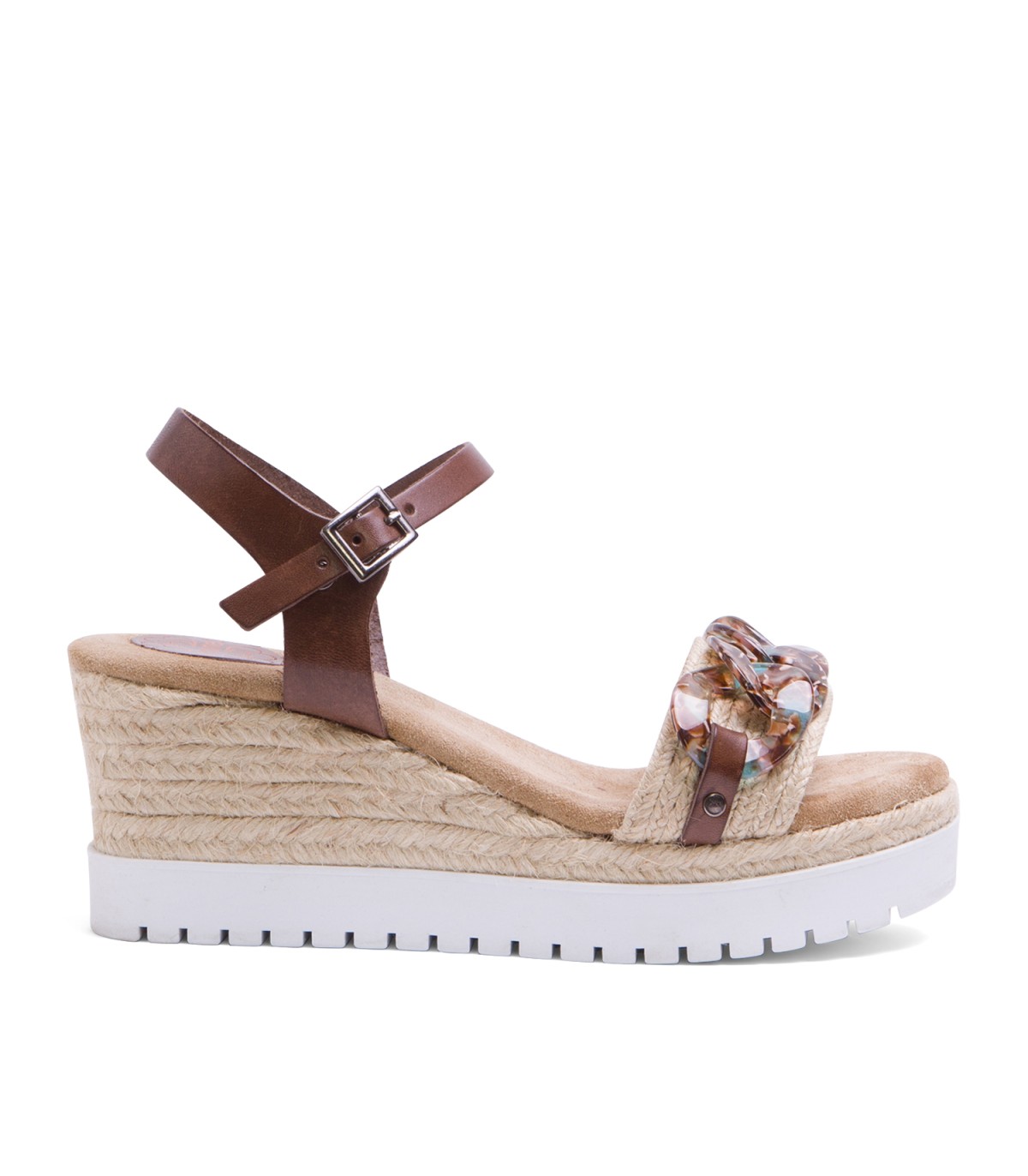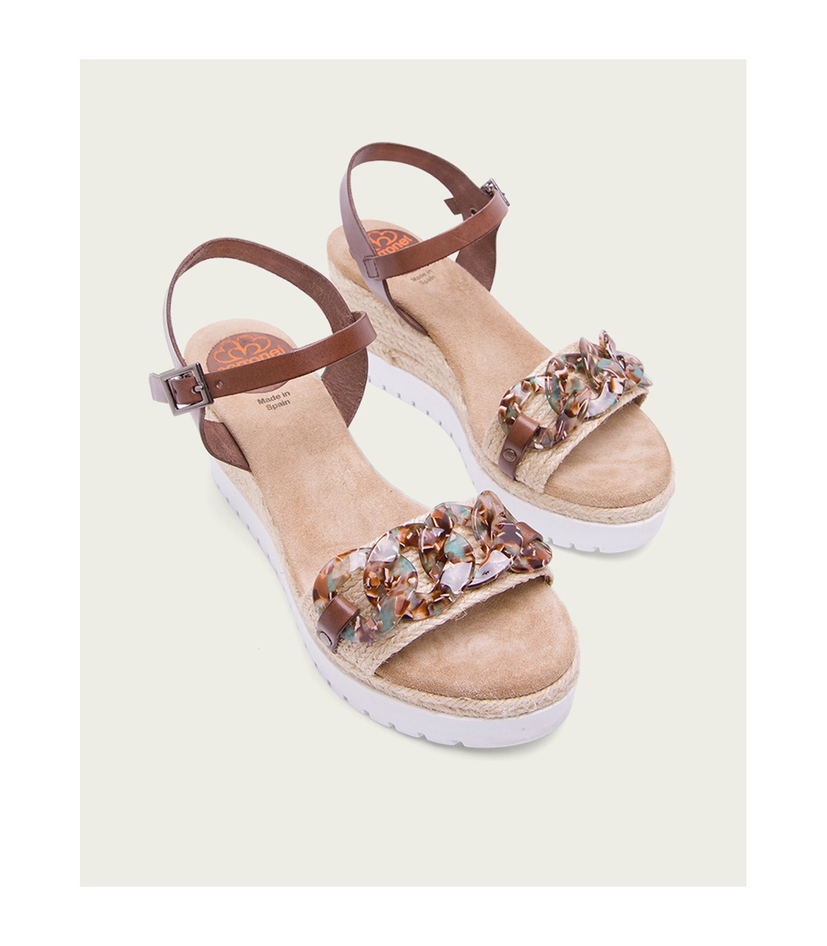 Sandalia tipo cuña de piel con pala de yute con aplique en forma de cadena. Cierre mediante pulsera de piel en el tobillo ajustable con hebilla metálica. Plantilla acolchada de serraje que garantiza una gran comodidad. Cuña de yute de 7cm de altura y plataforma delantera de 3cm con suela dentada de poliuretano. Fabricado de manera artesanal en España.