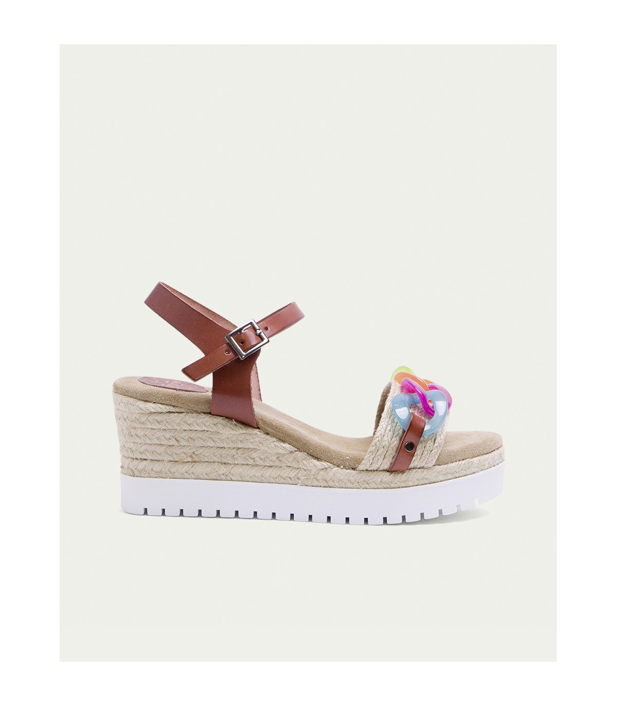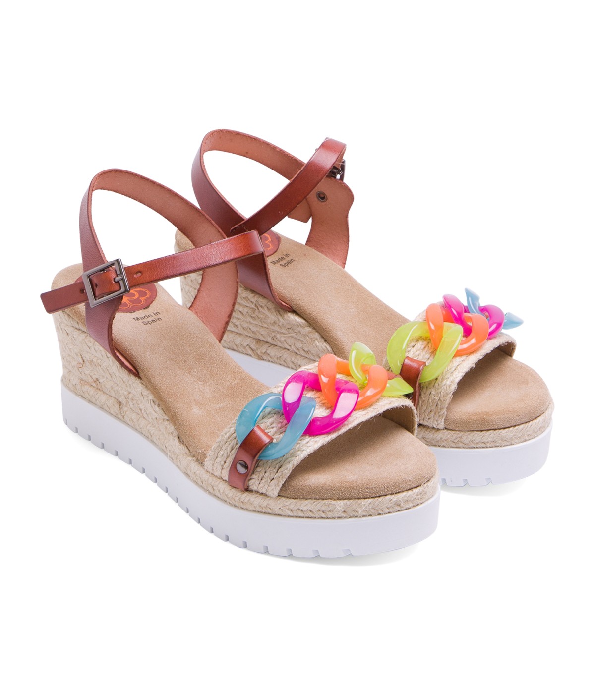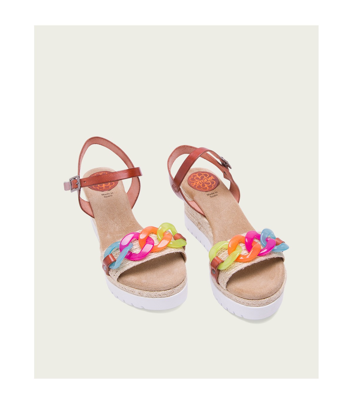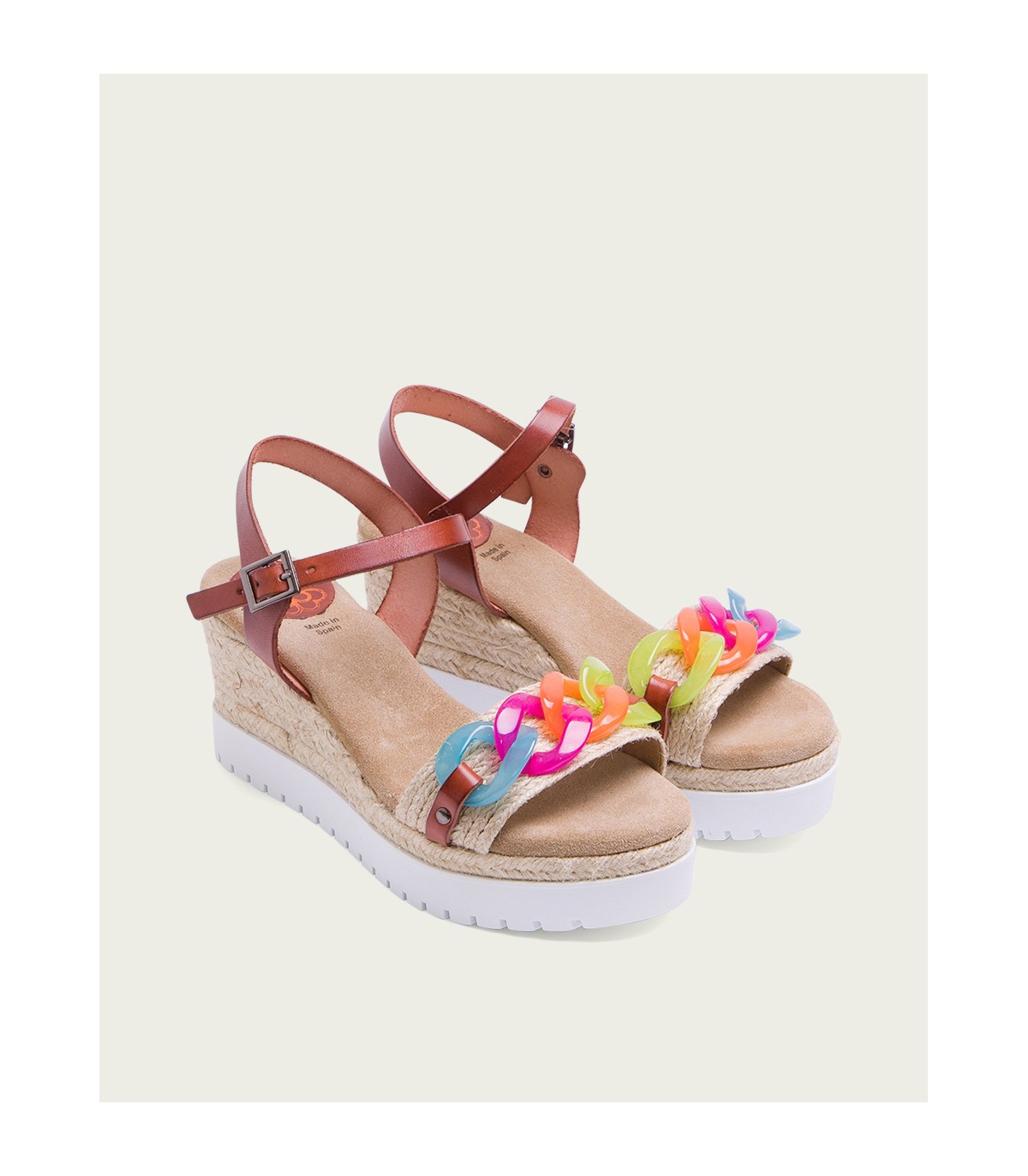 Sandalia tipo cuña de piel con pala de yute con aplique en forma de cadena. Cierre mediante pulsera de piel en el tobillo ajustable con hebilla metálica. Plantilla acolchada de serraje que garantiza una gran comodidad. Cuña de yute de 7cm de altura y plataforma delantera de 3cm con suela dentada de poliuretano. Fabricado de manera artesanal en España.