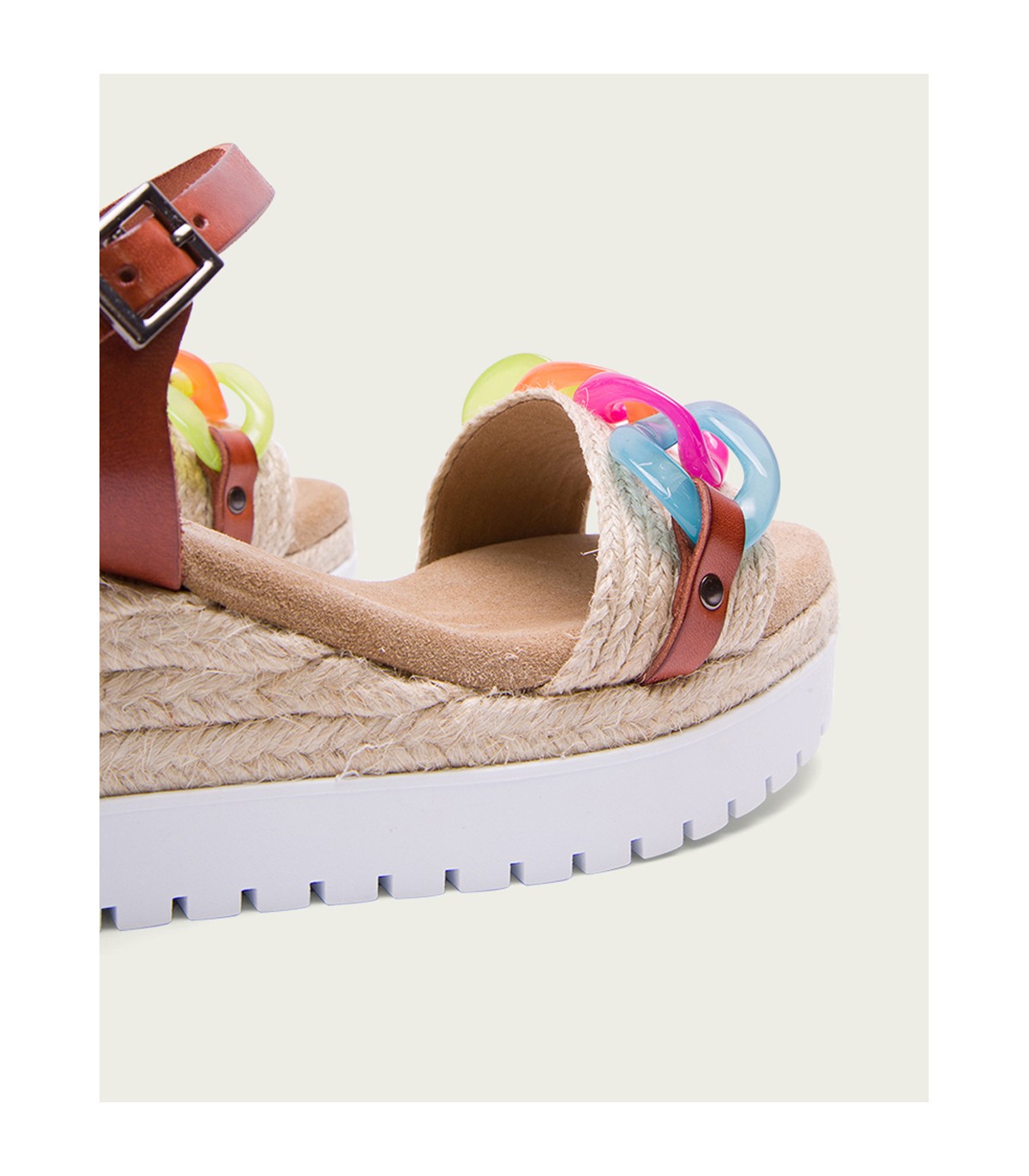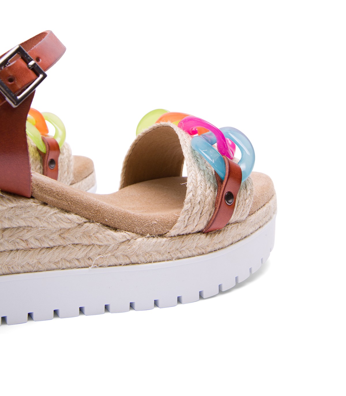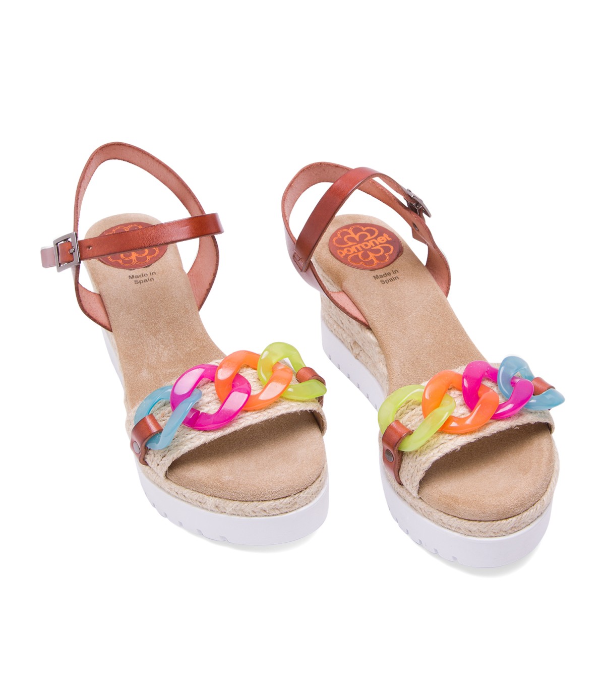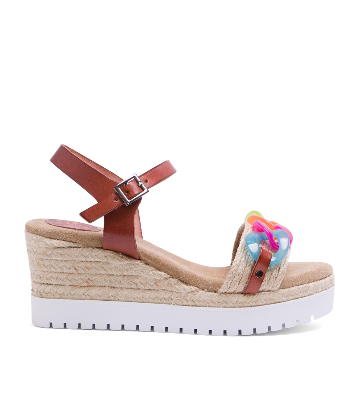 Sandalia tipo cuña de piel con pala de yute con aplique en forma de cadena. Cierre mediante pulsera de piel en el tobillo ajustable con hebilla metálica. Plantilla acolchada de serraje que garantiza una gran comodidad. Cuña de yute de 7cm de altura y plataforma delantera de 3cm con suela dentada de poliuretano. Fabricado de manera artesanal en España.