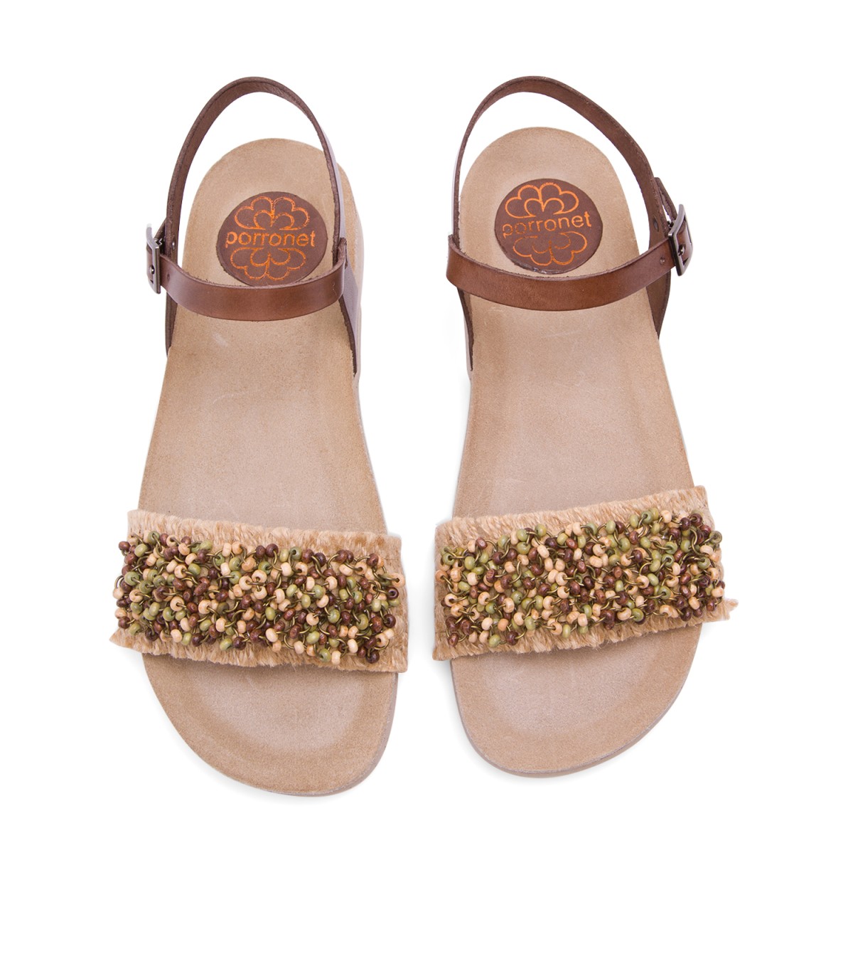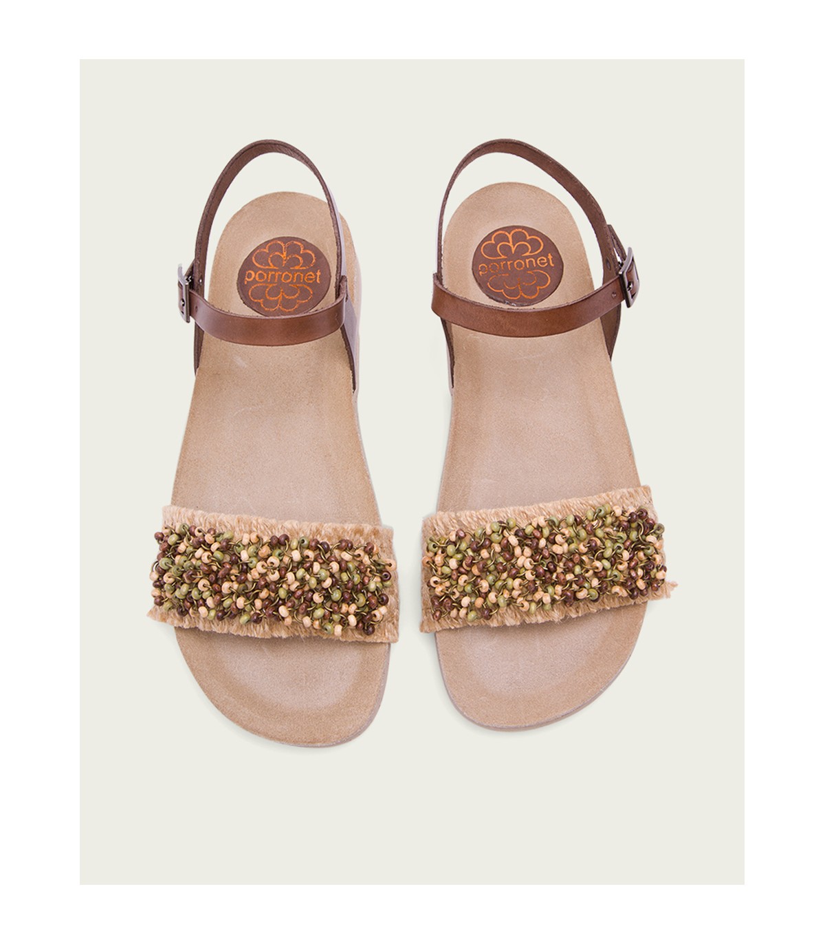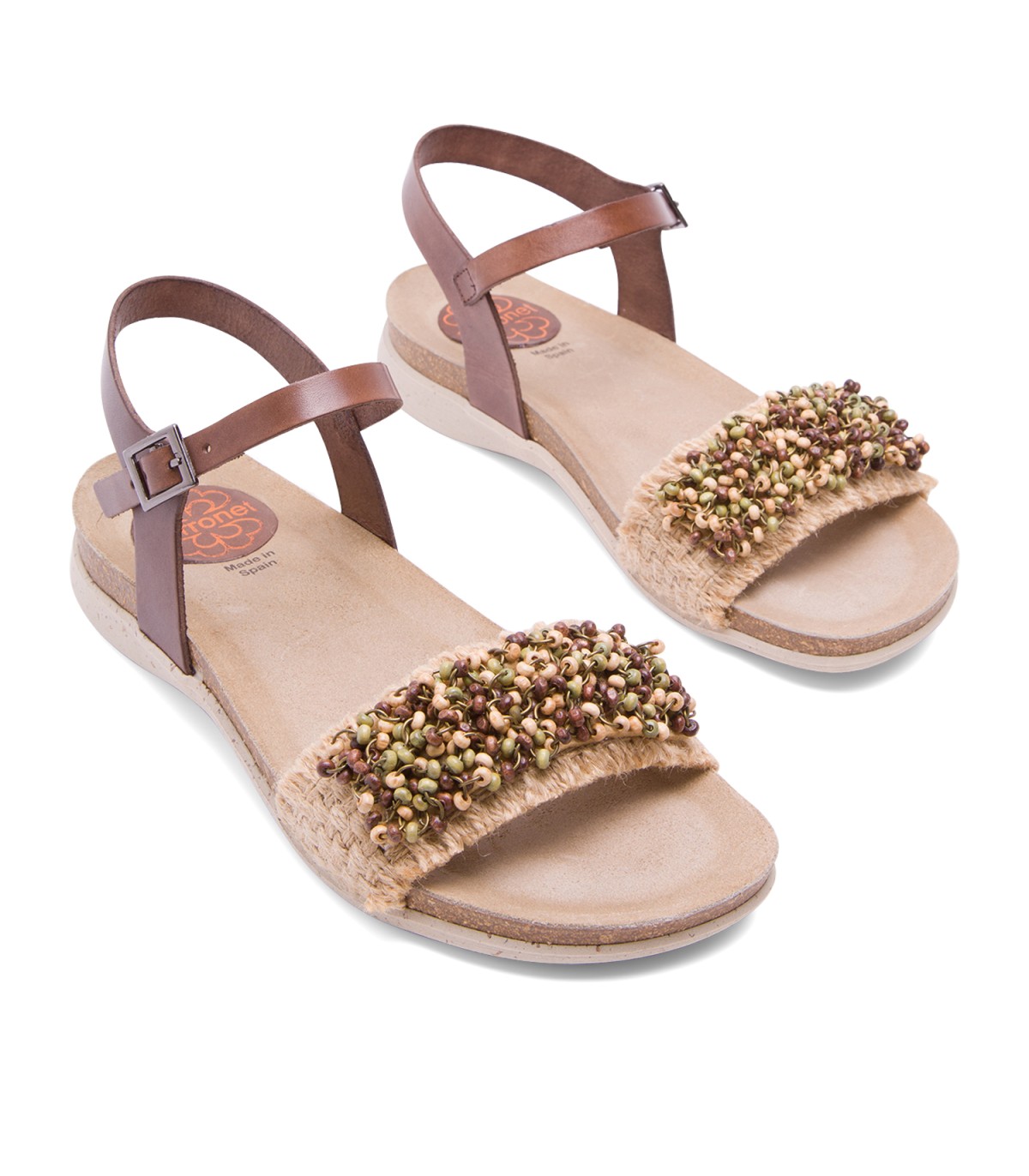 Sandalia tipo bio con original pala elaborada en yute con detalle de abalorios de madera y cierre mediante pulsera de piel en el tobillo ajustable con hebilla metálica. Plantilla acolchada en serraje que garantiza una gran comodidad. Cuña de 3,5 cm de alto y 1,5 cm de plataforma. Piso elaborado con tecnologías y parte de materiales reciclados y 100% reciclables, que ayudan a reducir el impacto medioambiental. Fabricado artesanalmente en España.